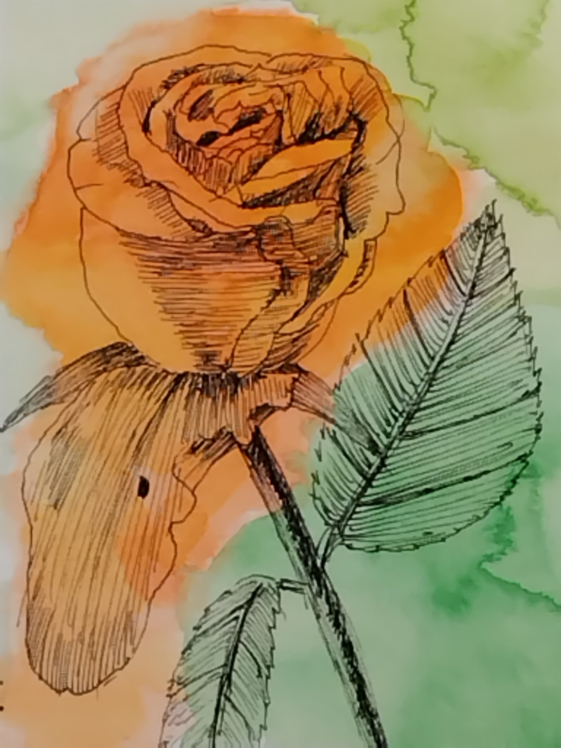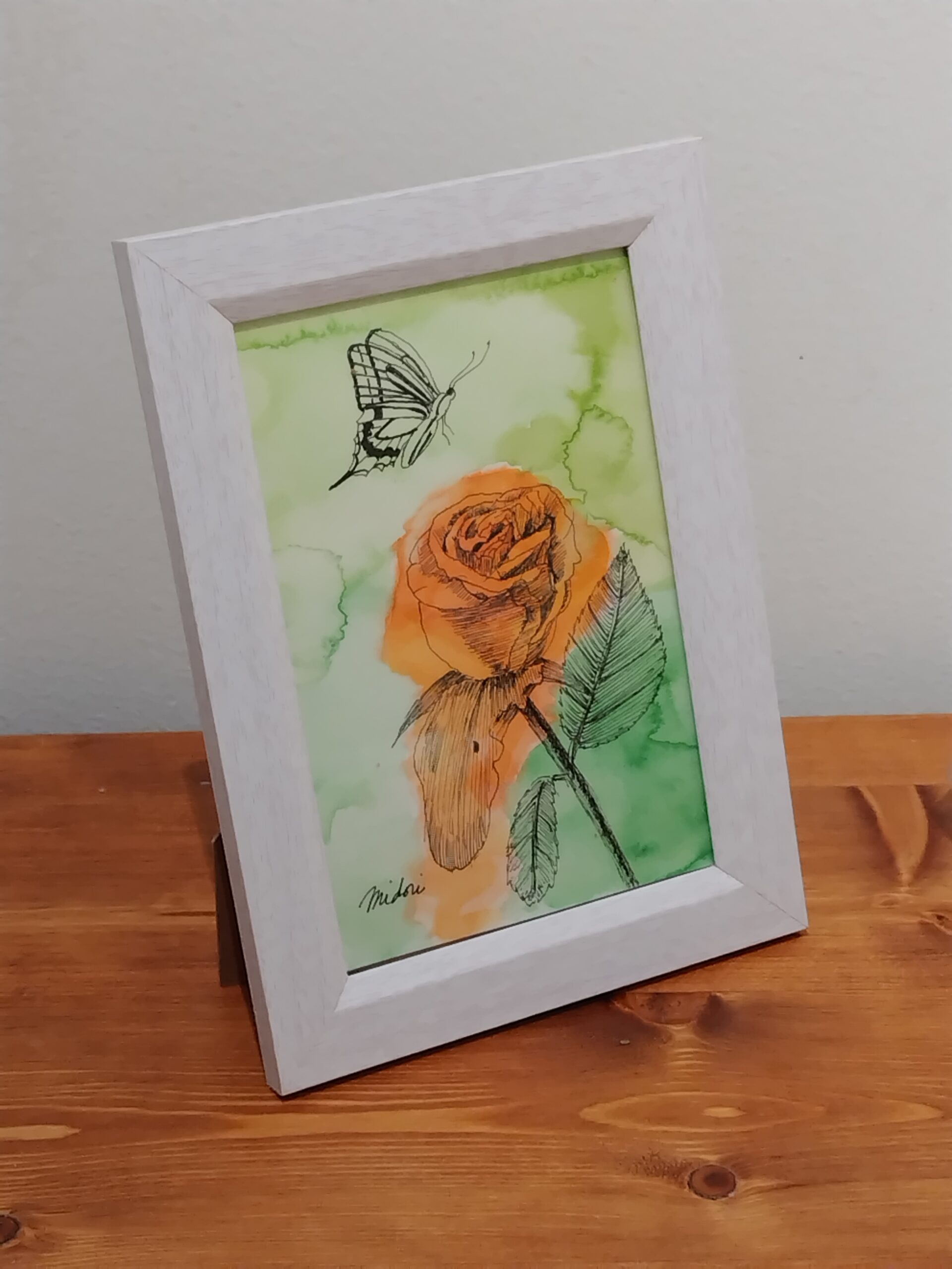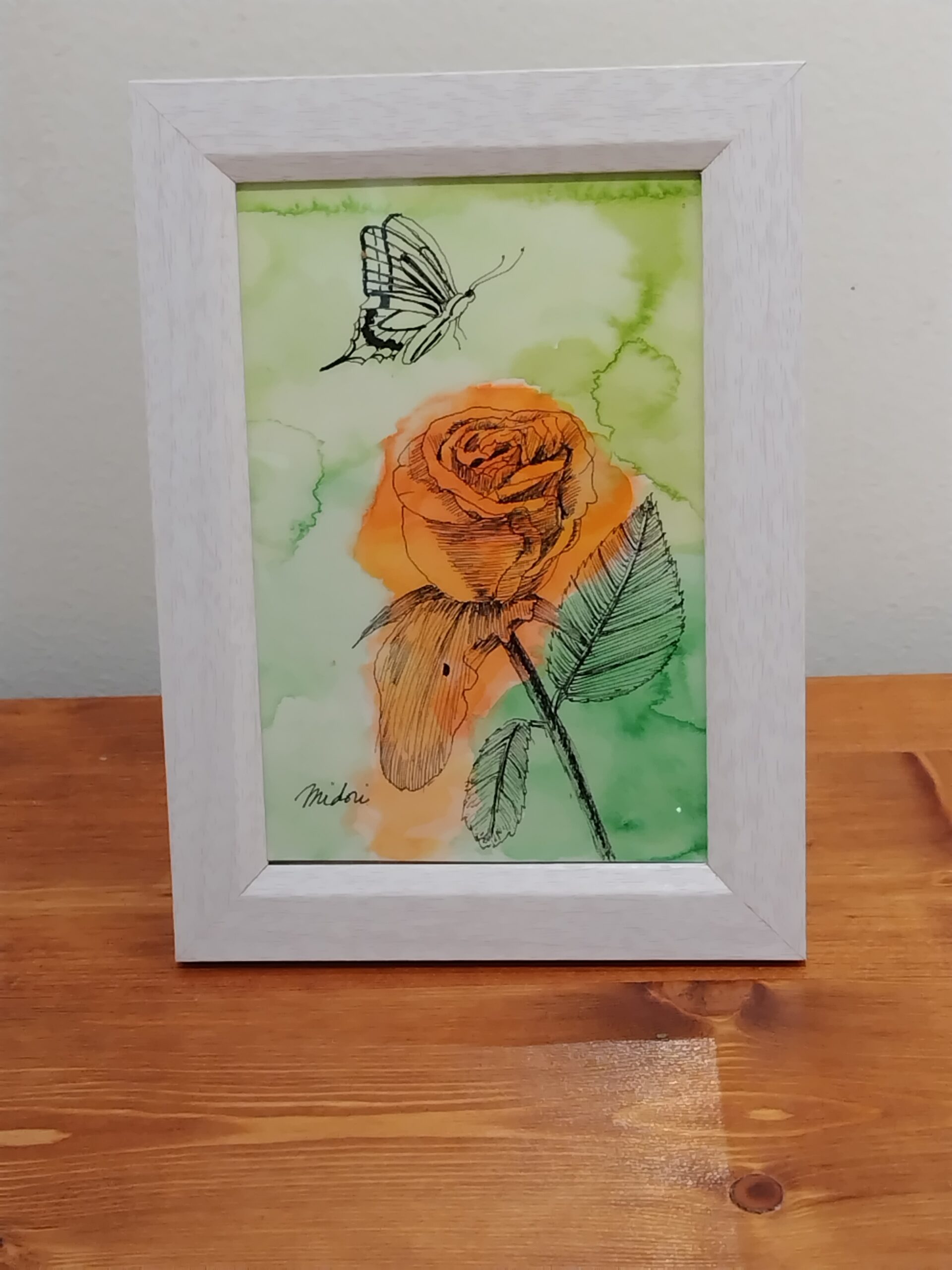 庭の薔薇の花びらが一枚剥がれているところに無常観を感じ、描きたくなりました。薔薇を追うように蝶が飛来した情景にしたくなり、蝶を描き込みました。お部屋に色味を加えるお手伝いが出来れば嬉しいです。