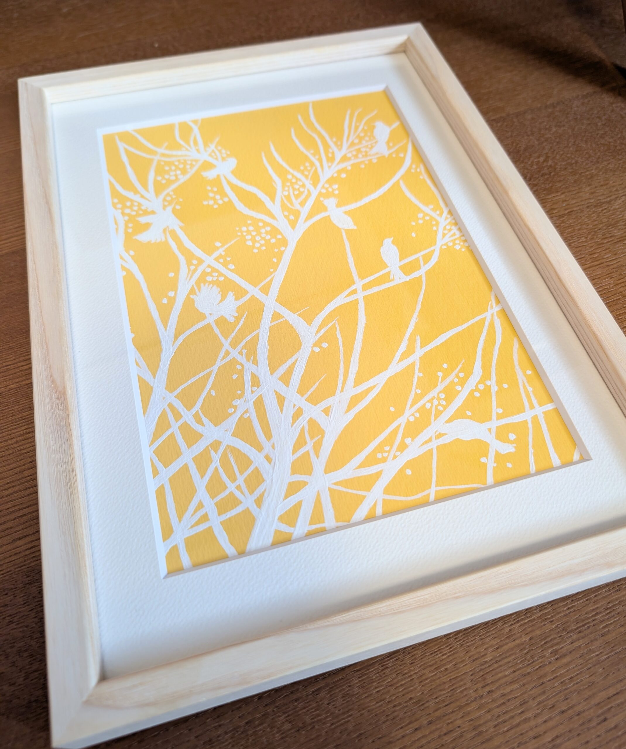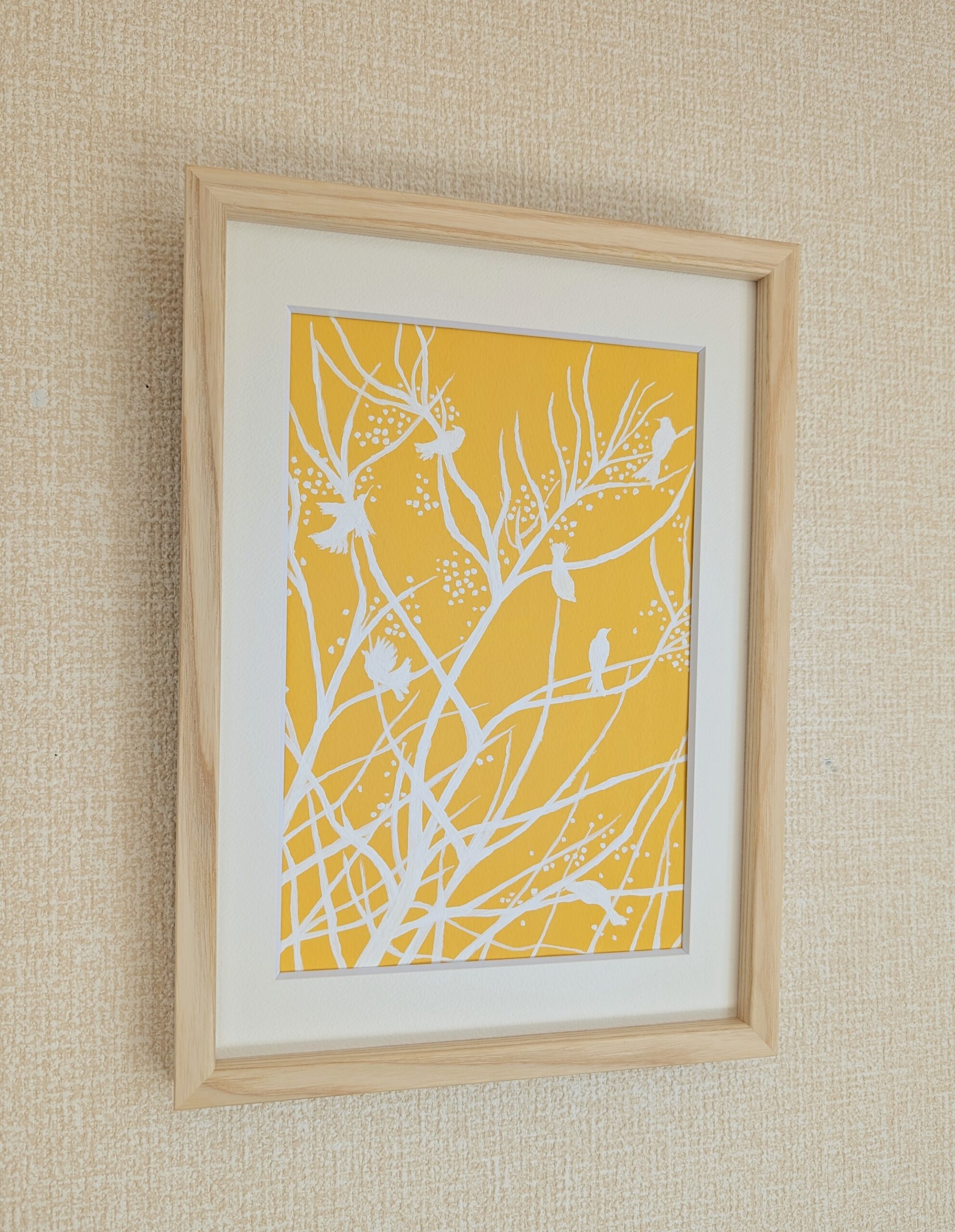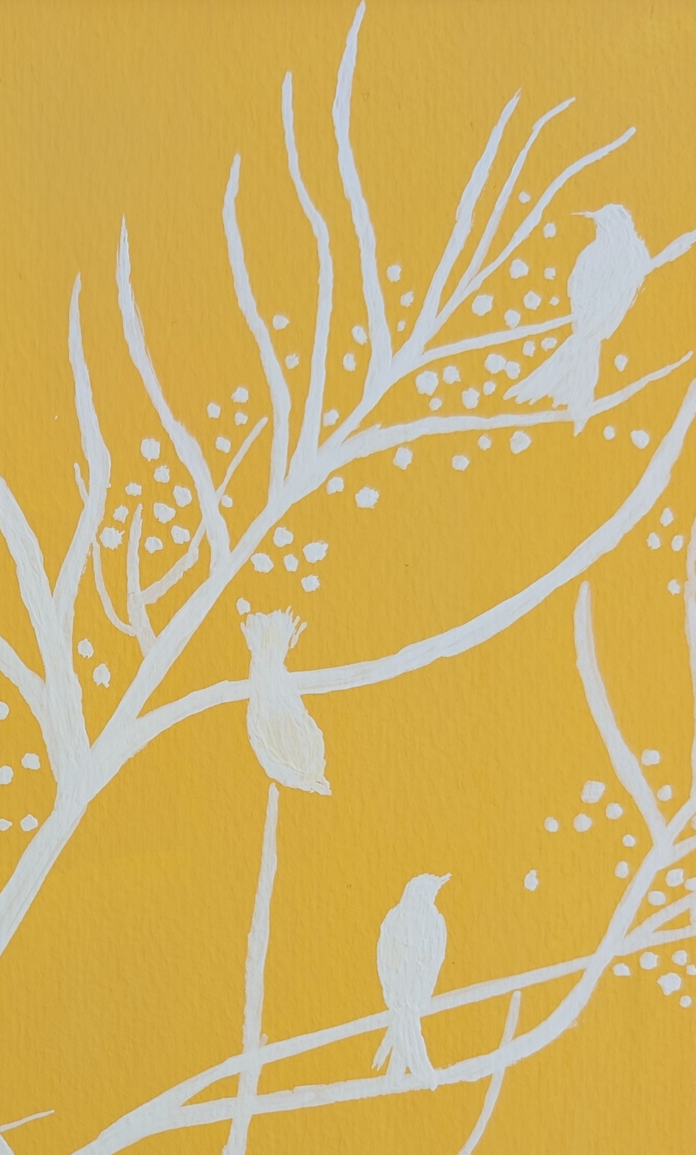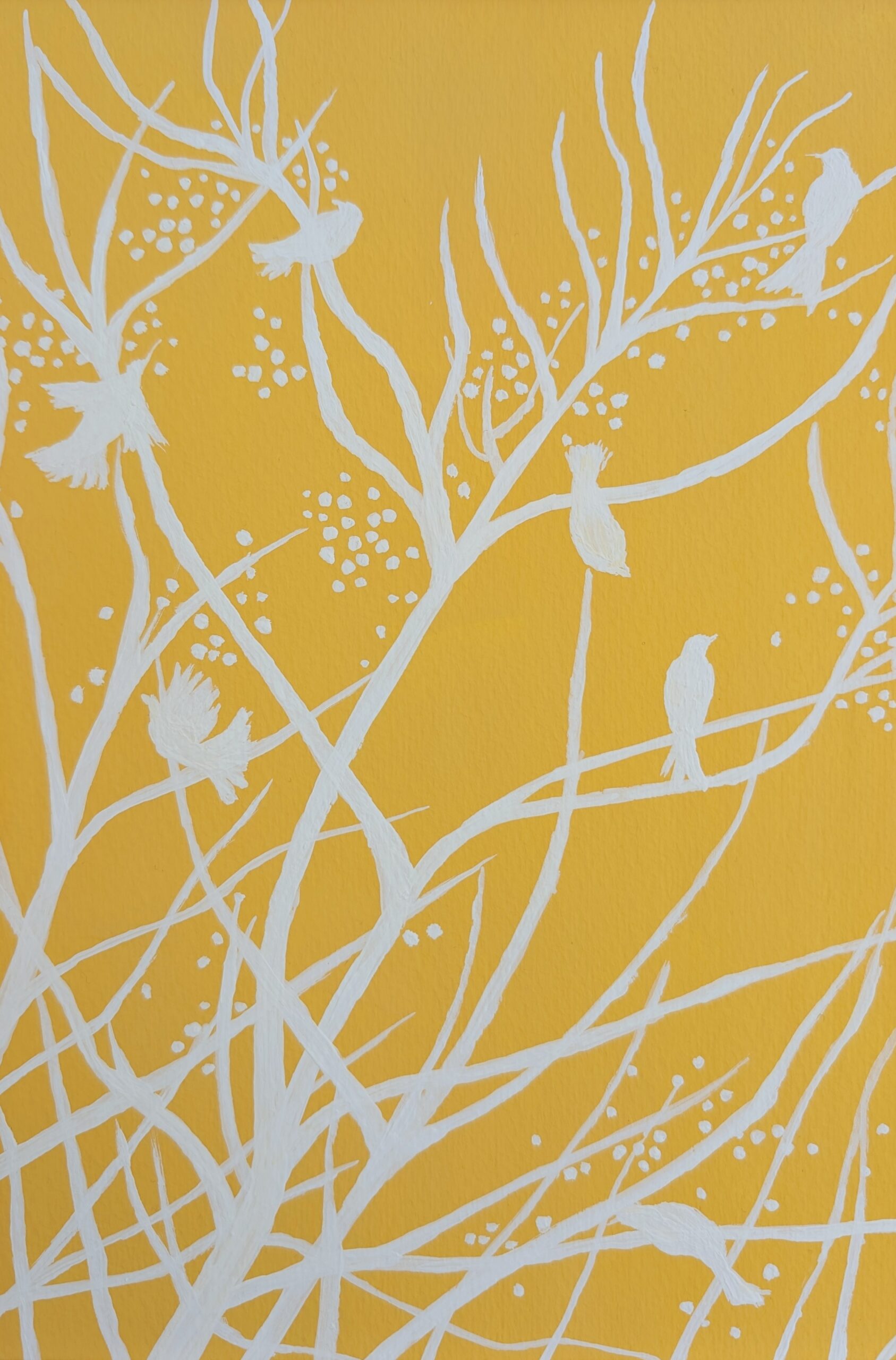 ※木と7羽のシルエットを、陶器に絵付けするような感覚で厚塗りに描いています