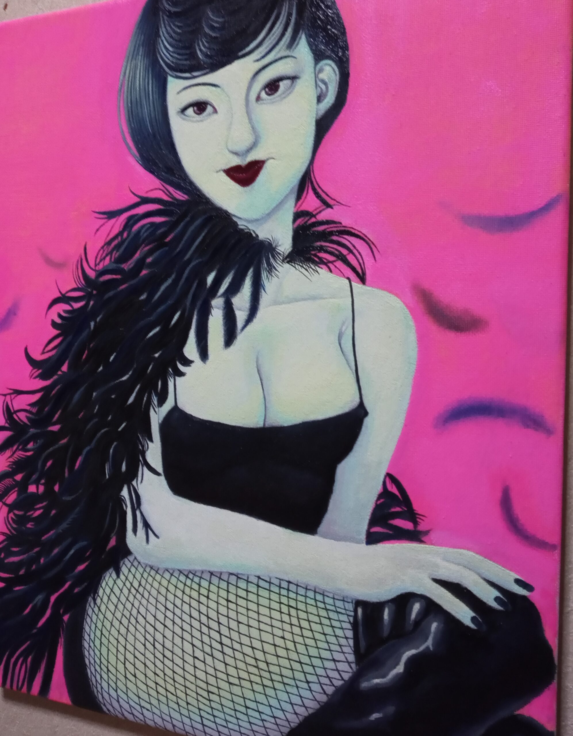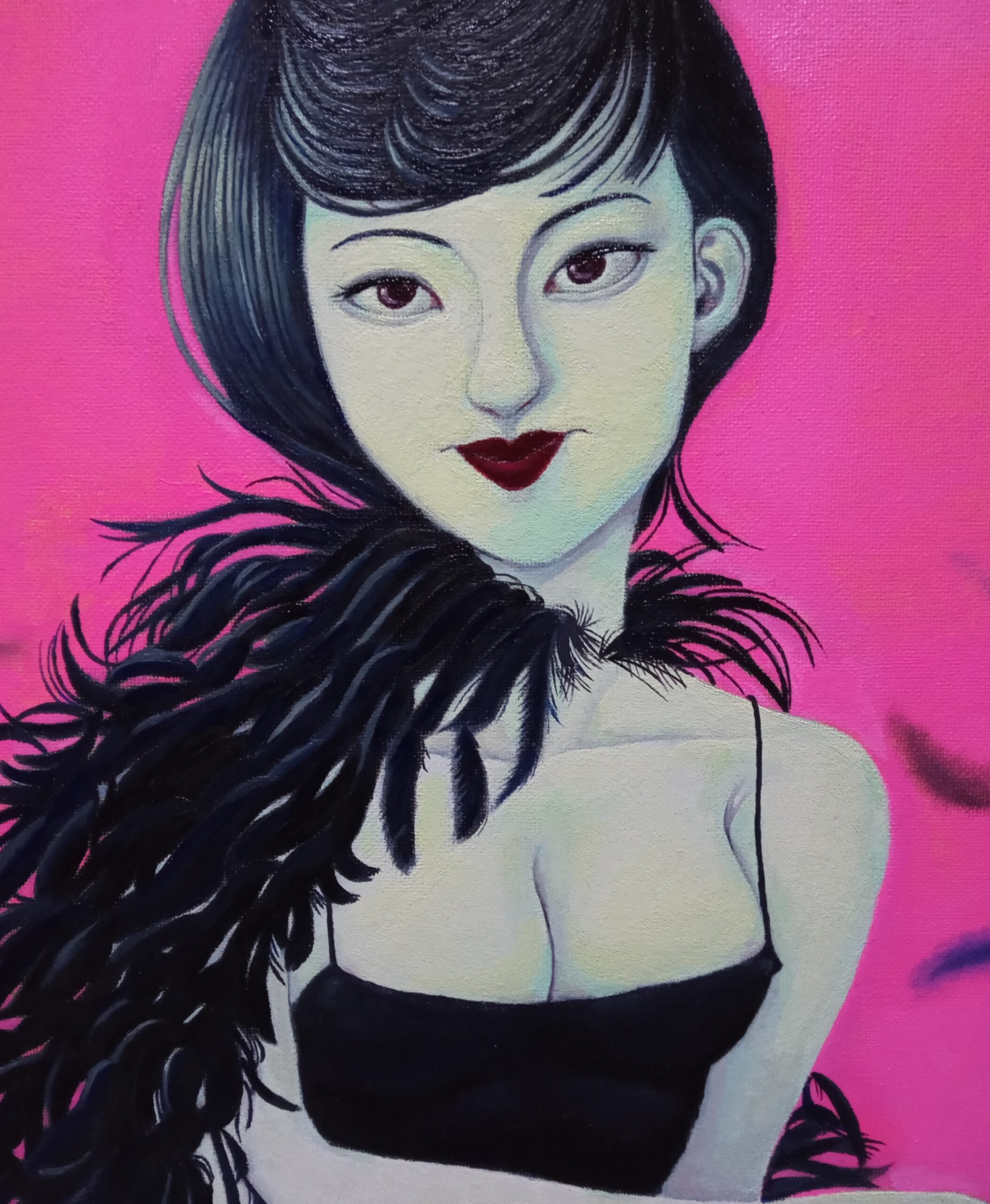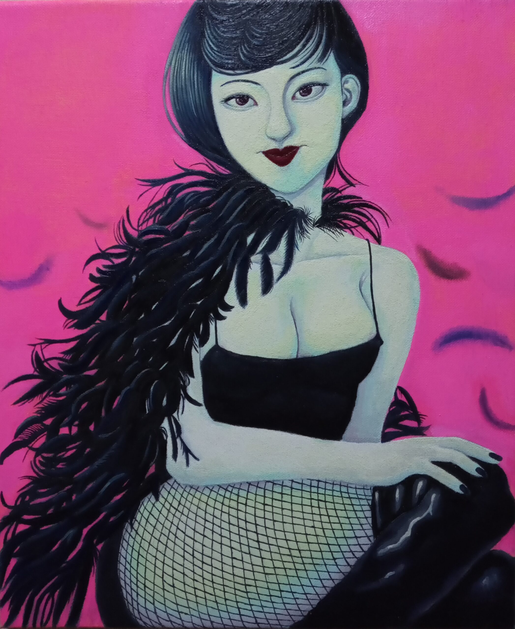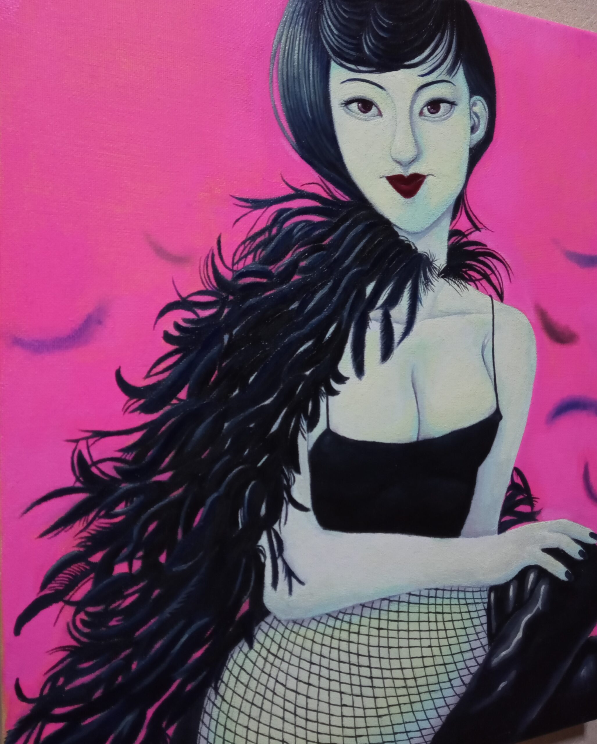 油彩画キャンバス series Monster&Fairy⑲ 伝説の妖怪や怪物、妖精などを現代風にアレンジして表現しました。 髪は烏の濡れ羽色、カラス娘のカー子ちゃん。自慢の御髪のお手入れも整い、何処かへお出かけでしょうか?