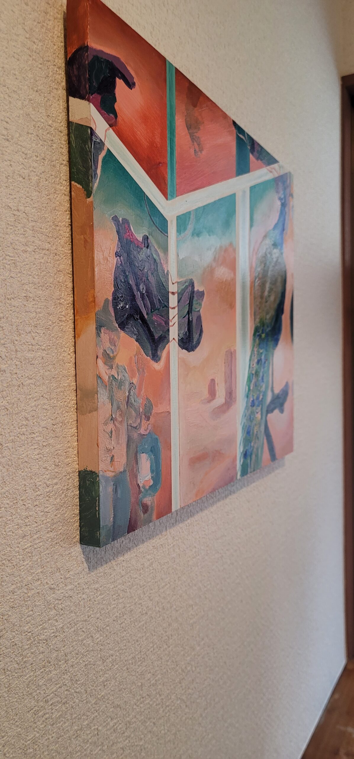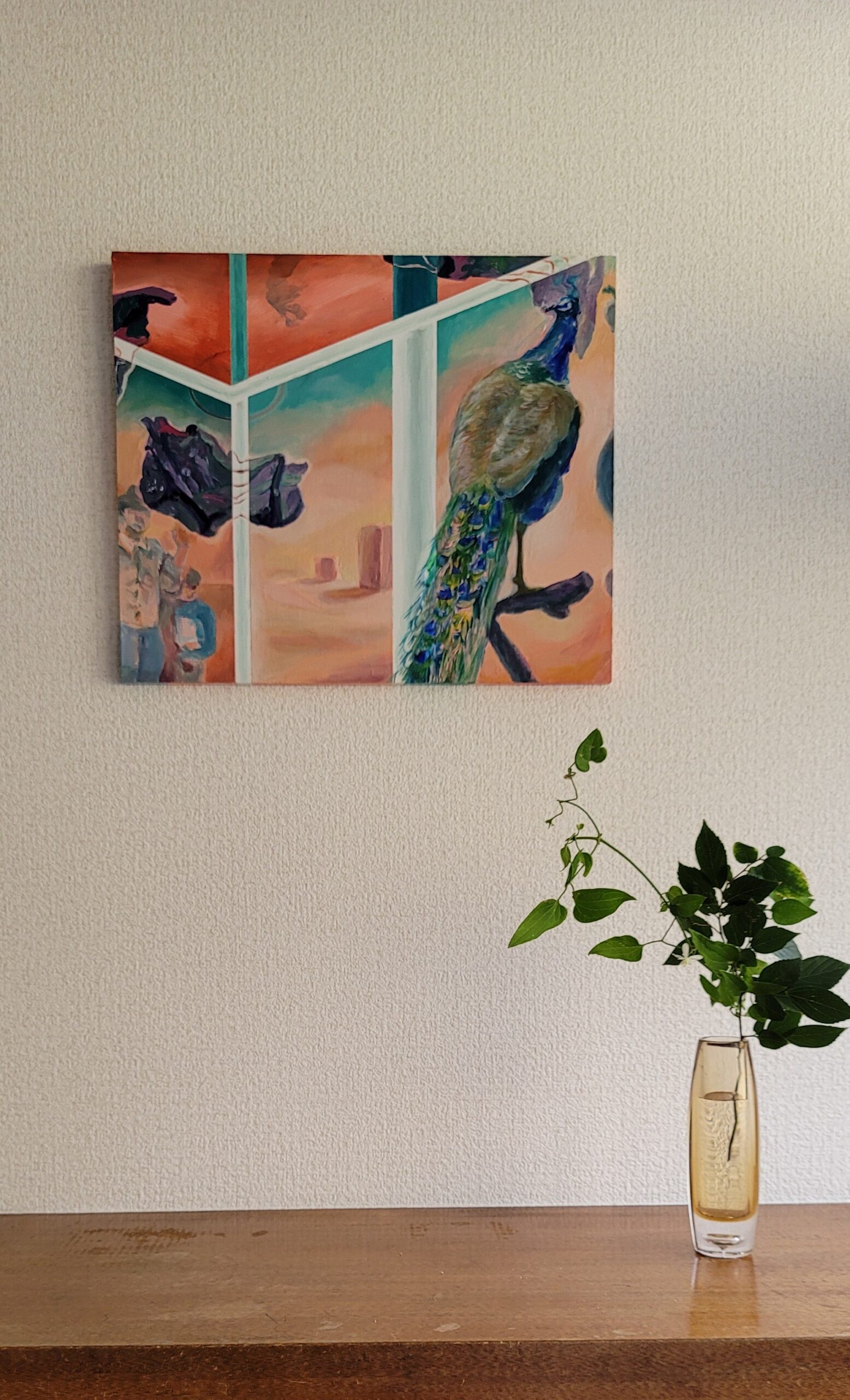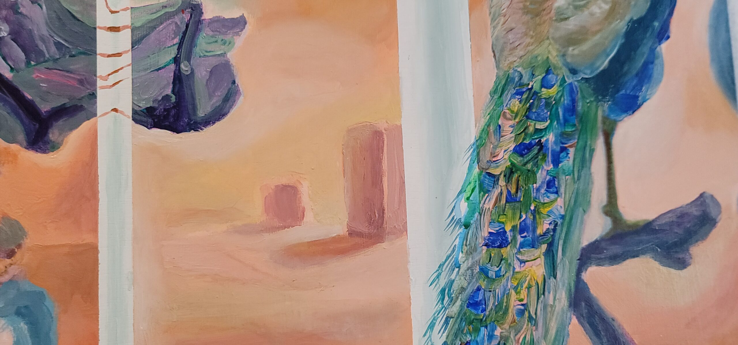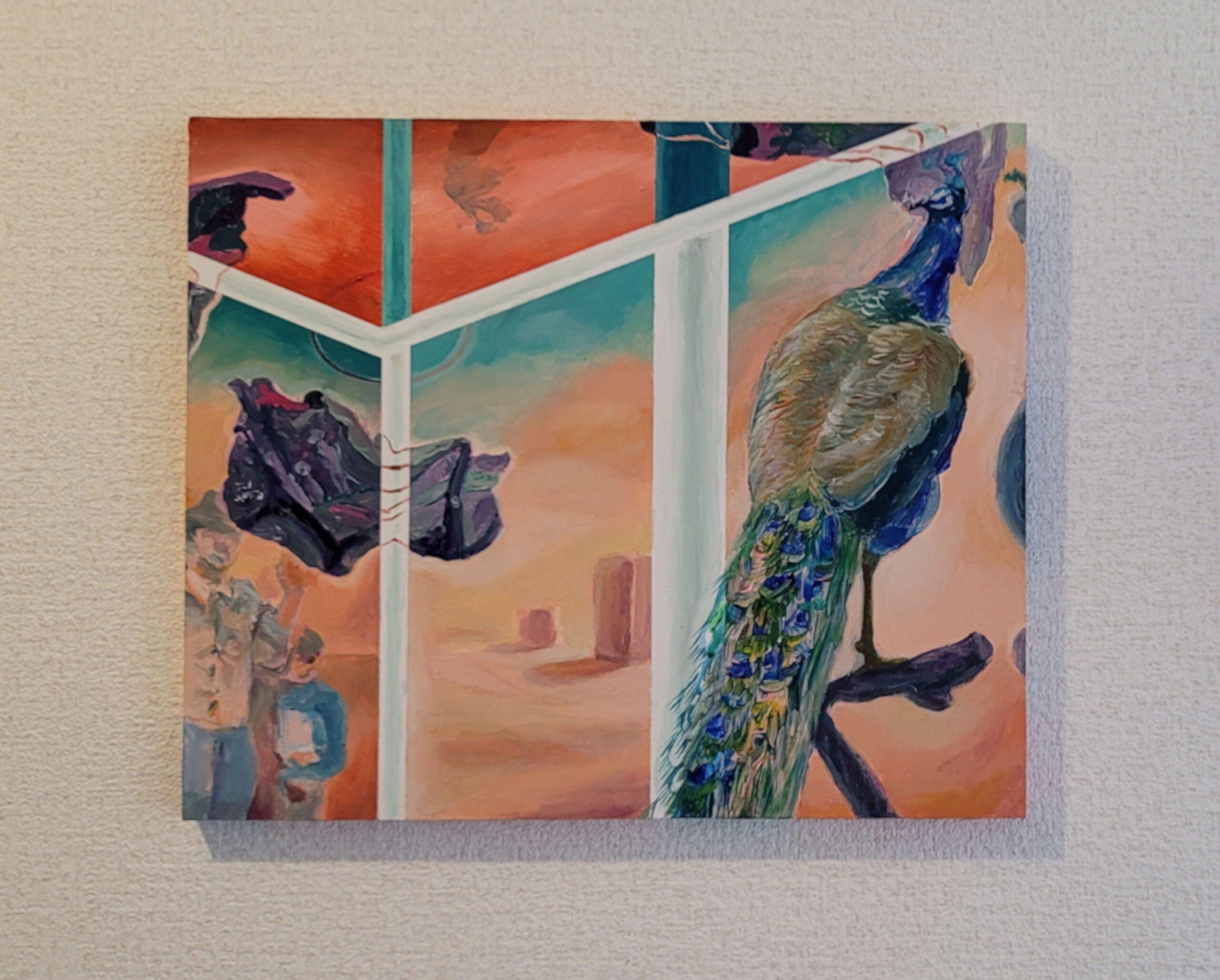 旅行先のホテルの回転扉に、クジャクの剥製がありました。玄関を通るたびに美しいクジャクと近づいたり離れたりして、何度も出会っては別れを繰り返しているような感覚にとらわれました。