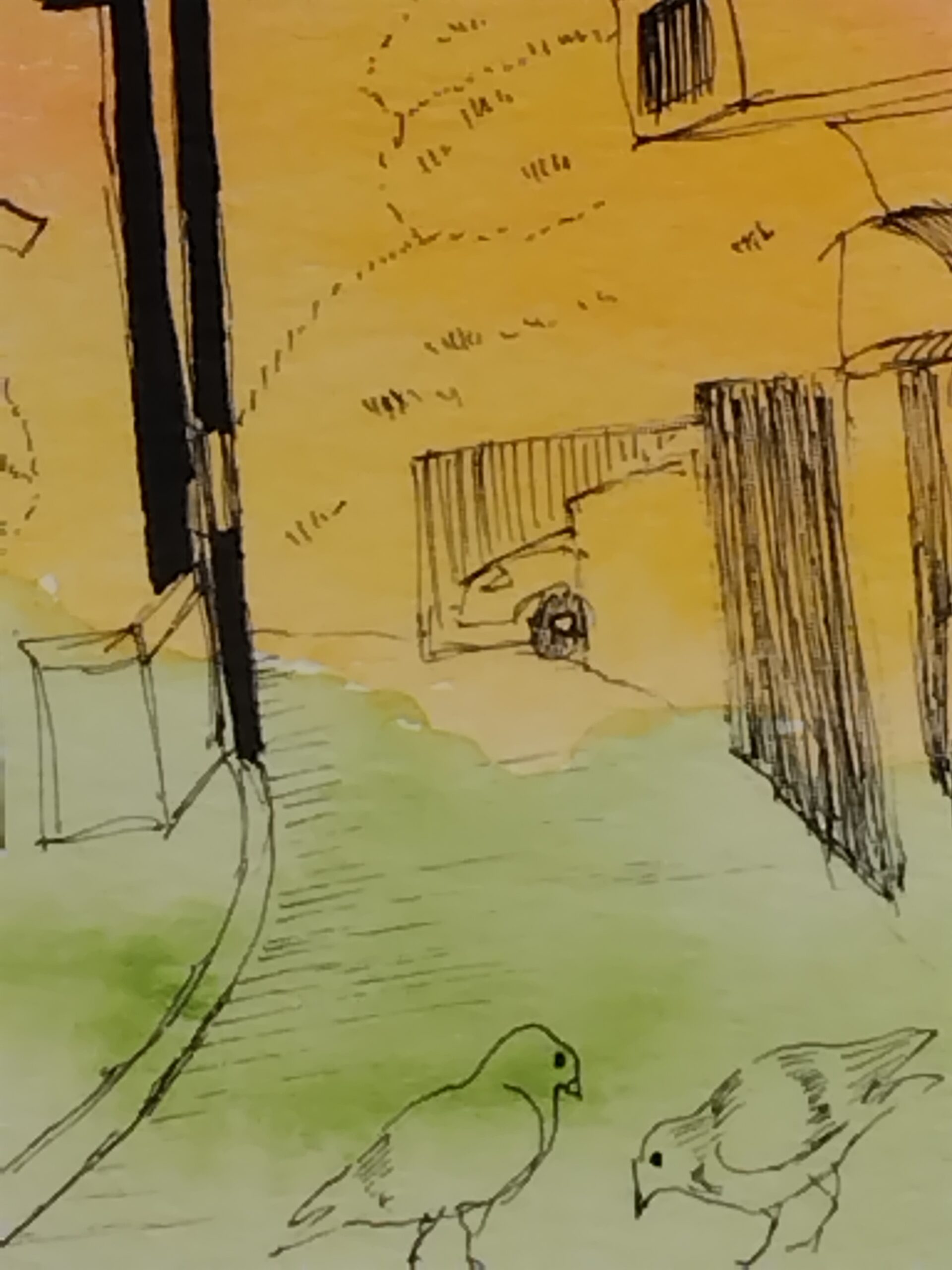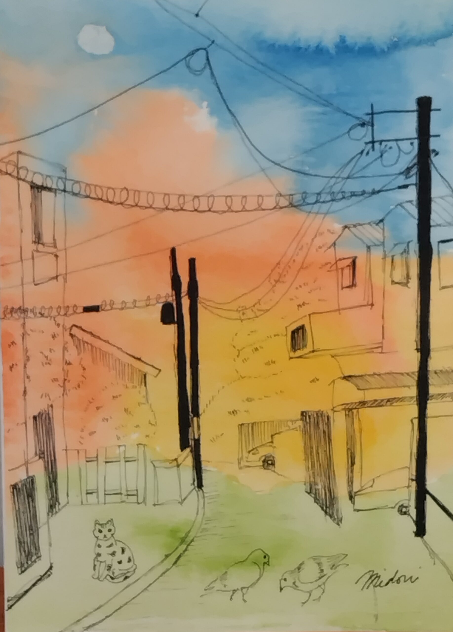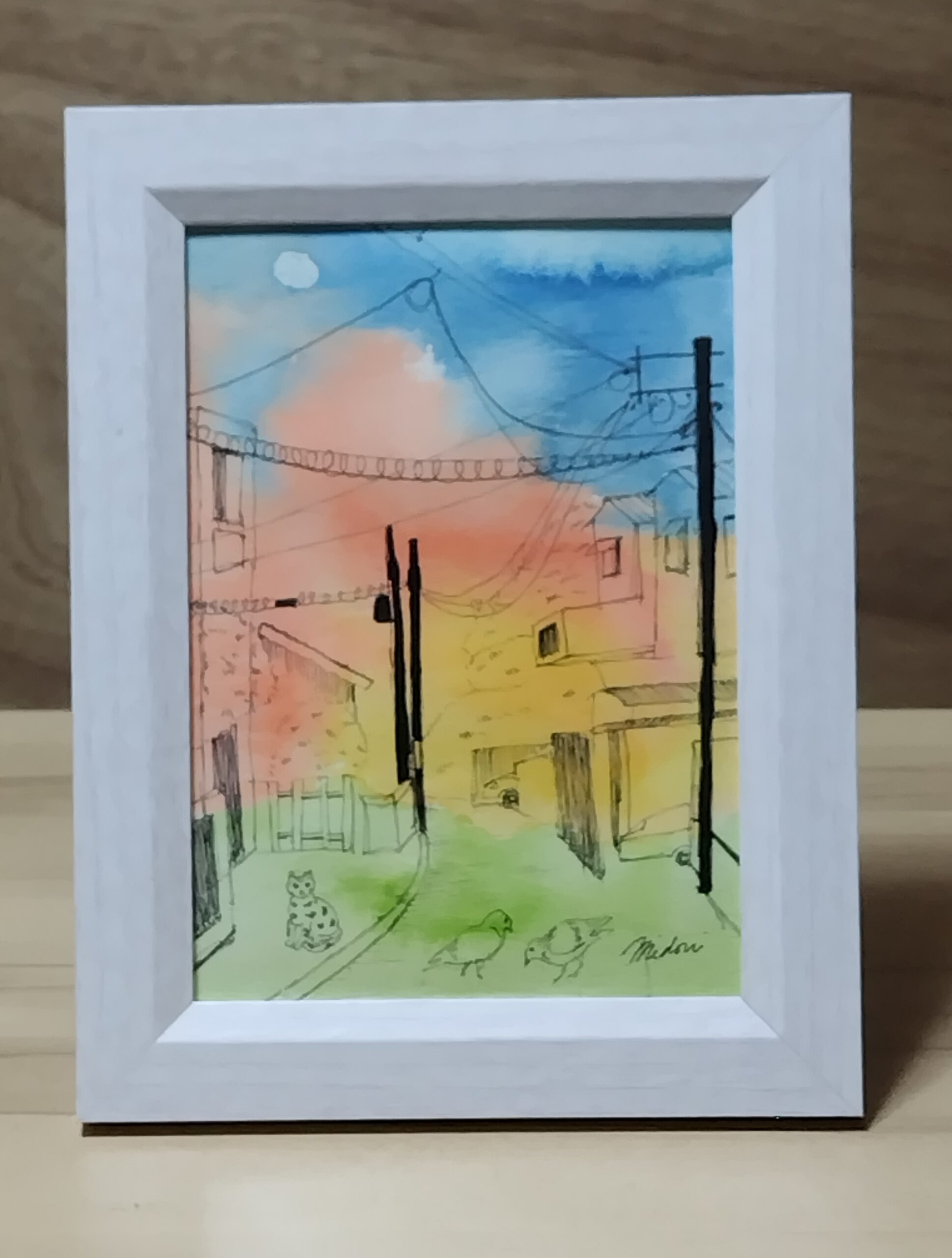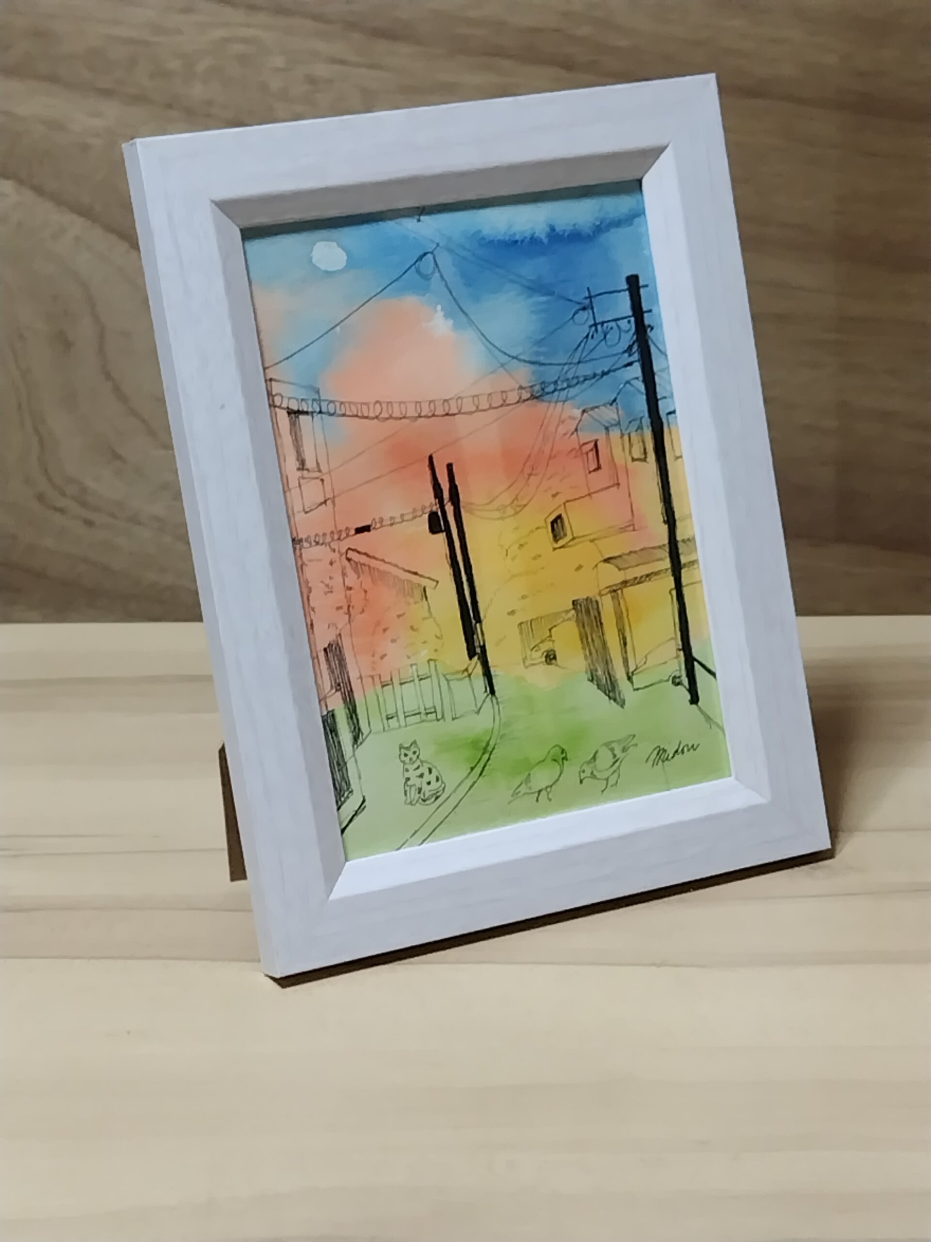 家路につくと、帰り間際に空を見ると夕焼けが美しく、思わずスケッチブックに水彩で書き留めました。そこに街並みがあればもっと美しくなるのではと思い、黒色のペンで建物を描き込みました。水彩の鮮やかさとペンの黒色の対比をお楽しみいただければ嬉しいです。お部屋に色味を加えるお手伝いが出来れば嬉しいです。