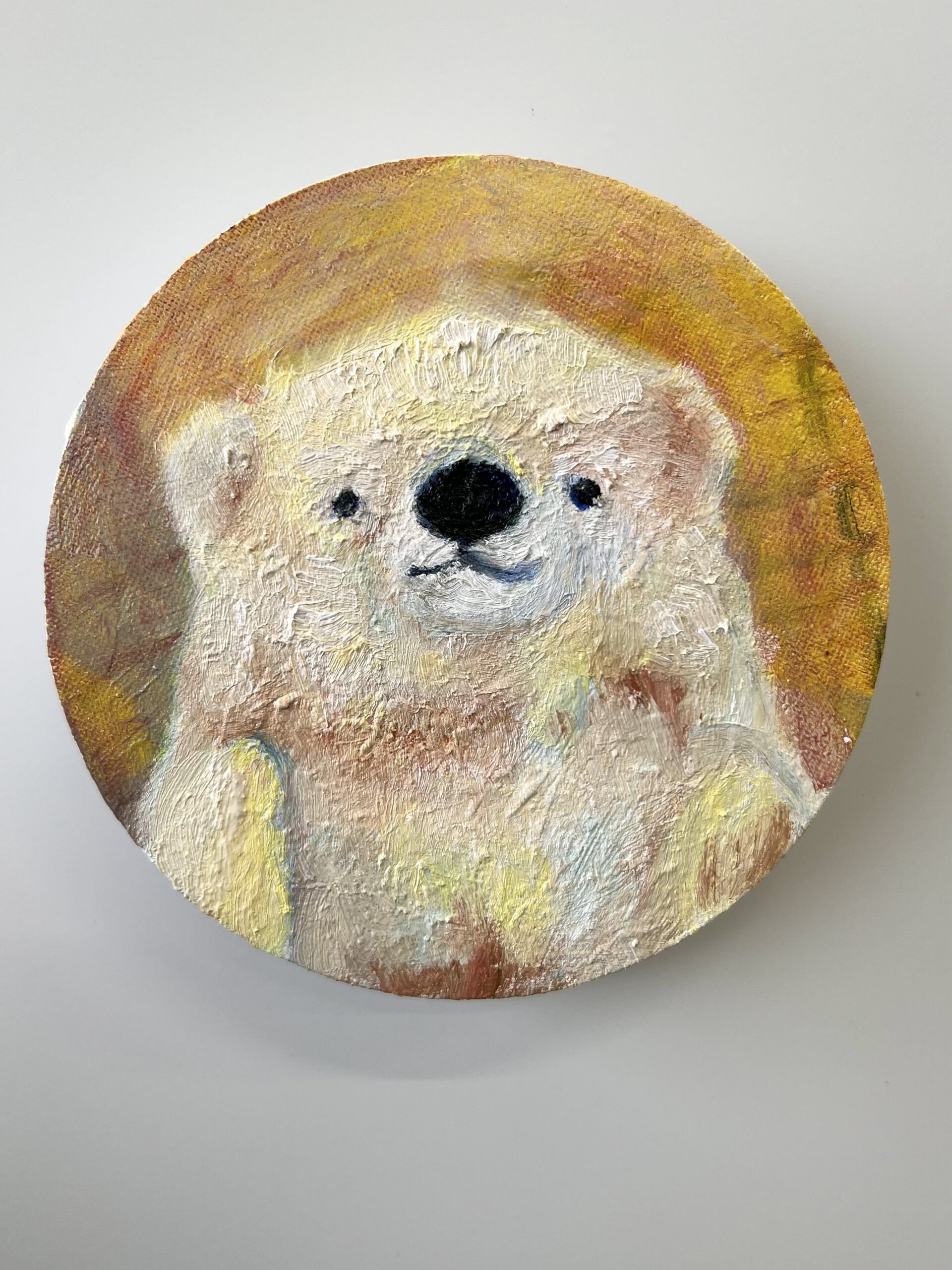 夕日の中で佇むしろくまのもんちゃんの姿を描きました