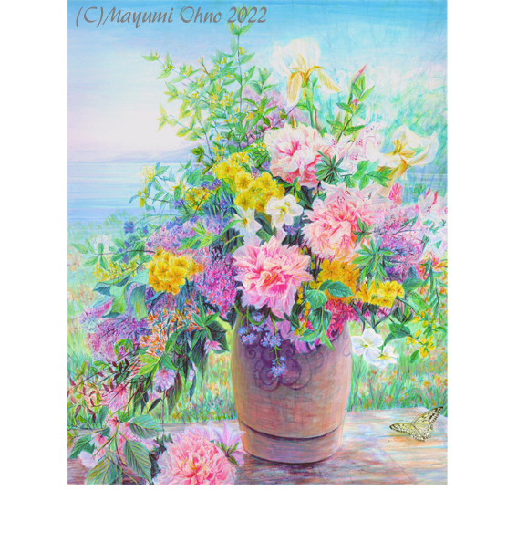 青い空、自然豊かな湖畔をバックに花を生けたら蝶々が遊びに来ました。私は花を飾るのが好きなのですが、生け花はすぐに枯れてしまいます。花の感動を絵にすれば、ずっと楽しめます。