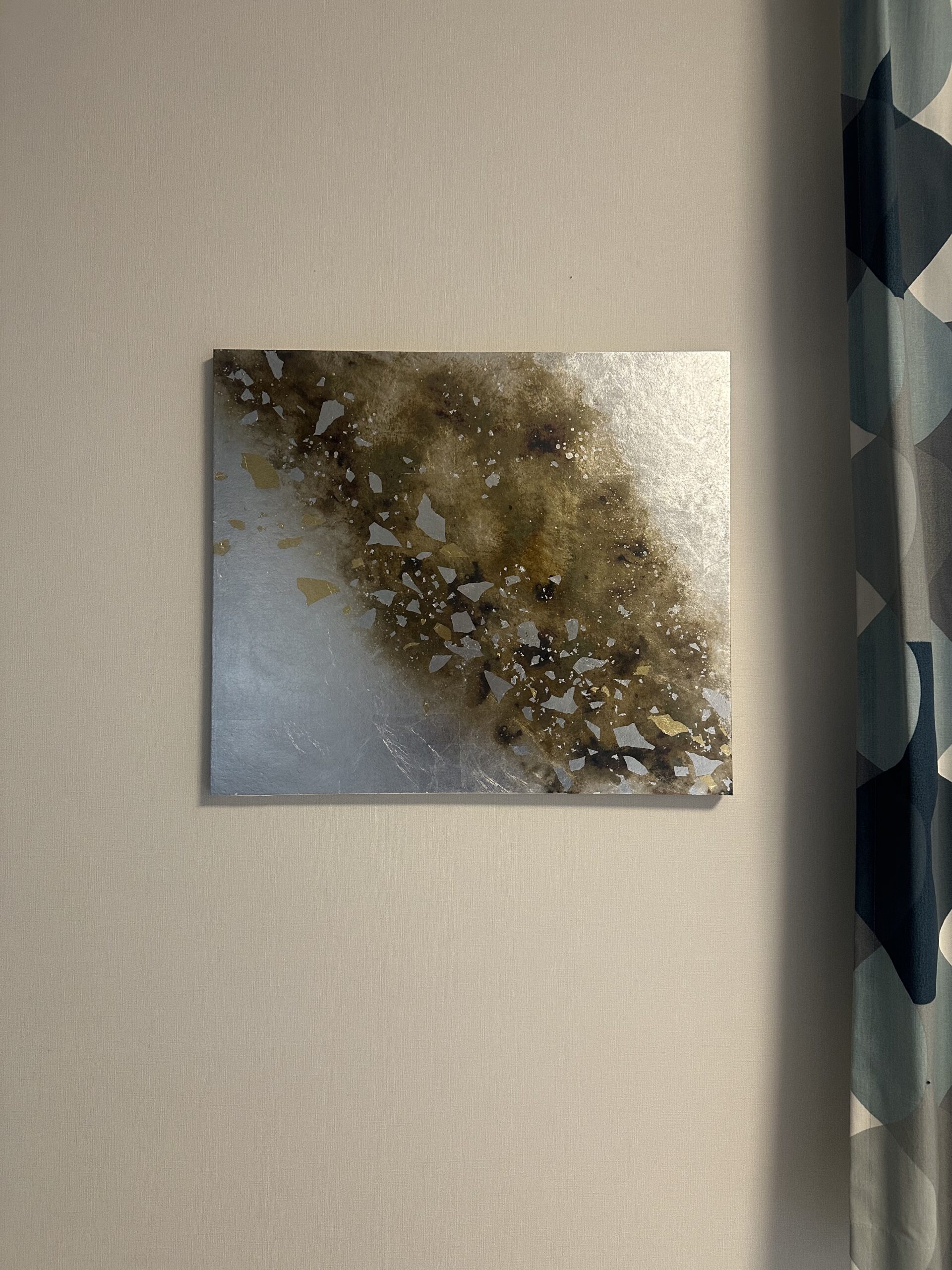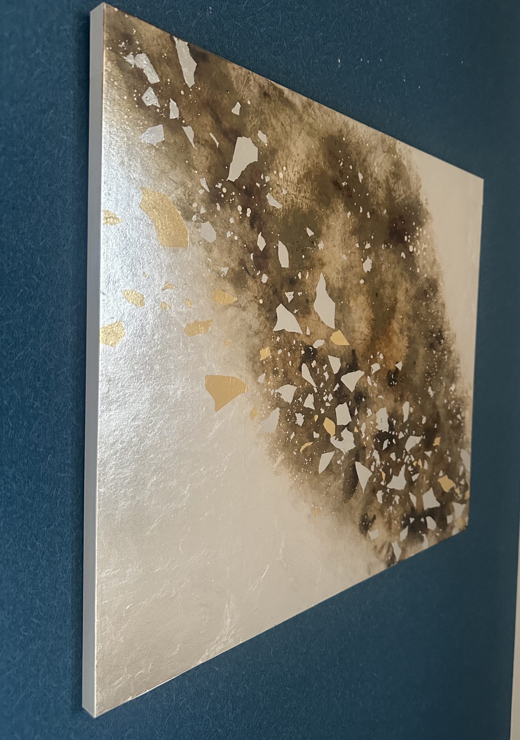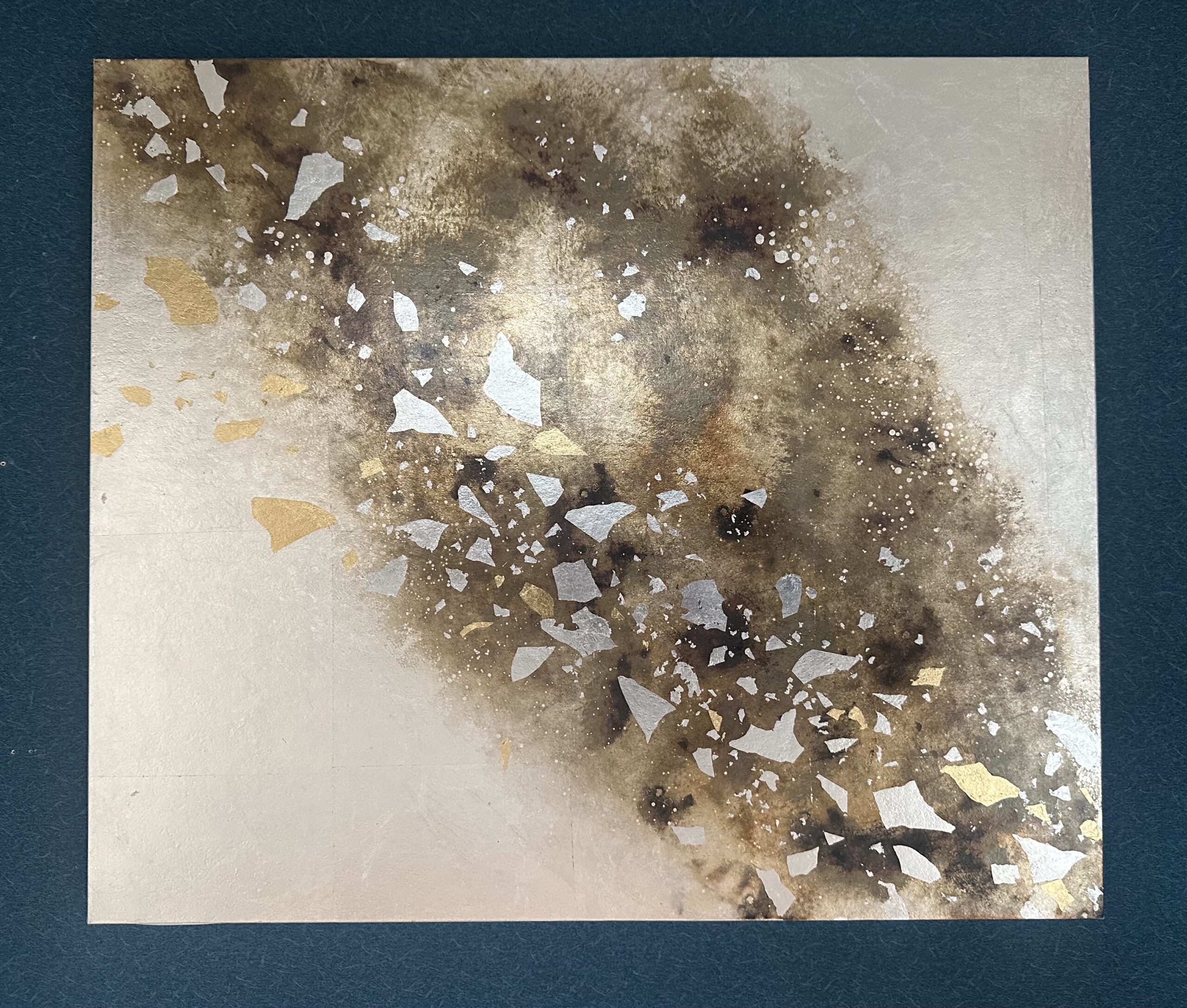 箔を使用した作品は、光のあたり方によって輝き方が変わります。日中の窓から入る自然光、夜の照明の光など、光の違いにより表情がかなり変わります。また、箔の変色を抑えるためのコーティングをしておりますが、時間経過とともに少しずつ色味が変化します。その変化もお楽しみいただけますと幸いです。