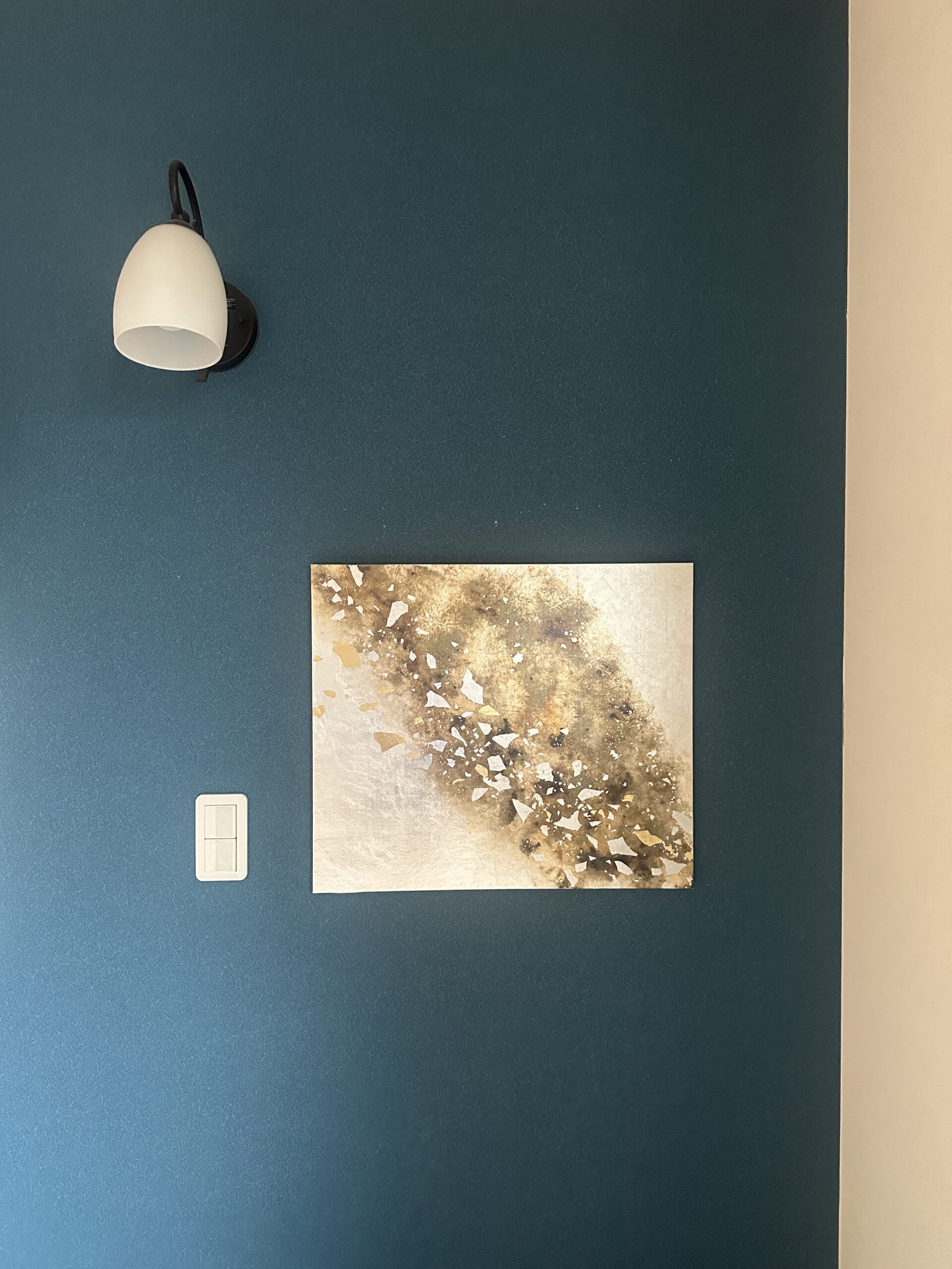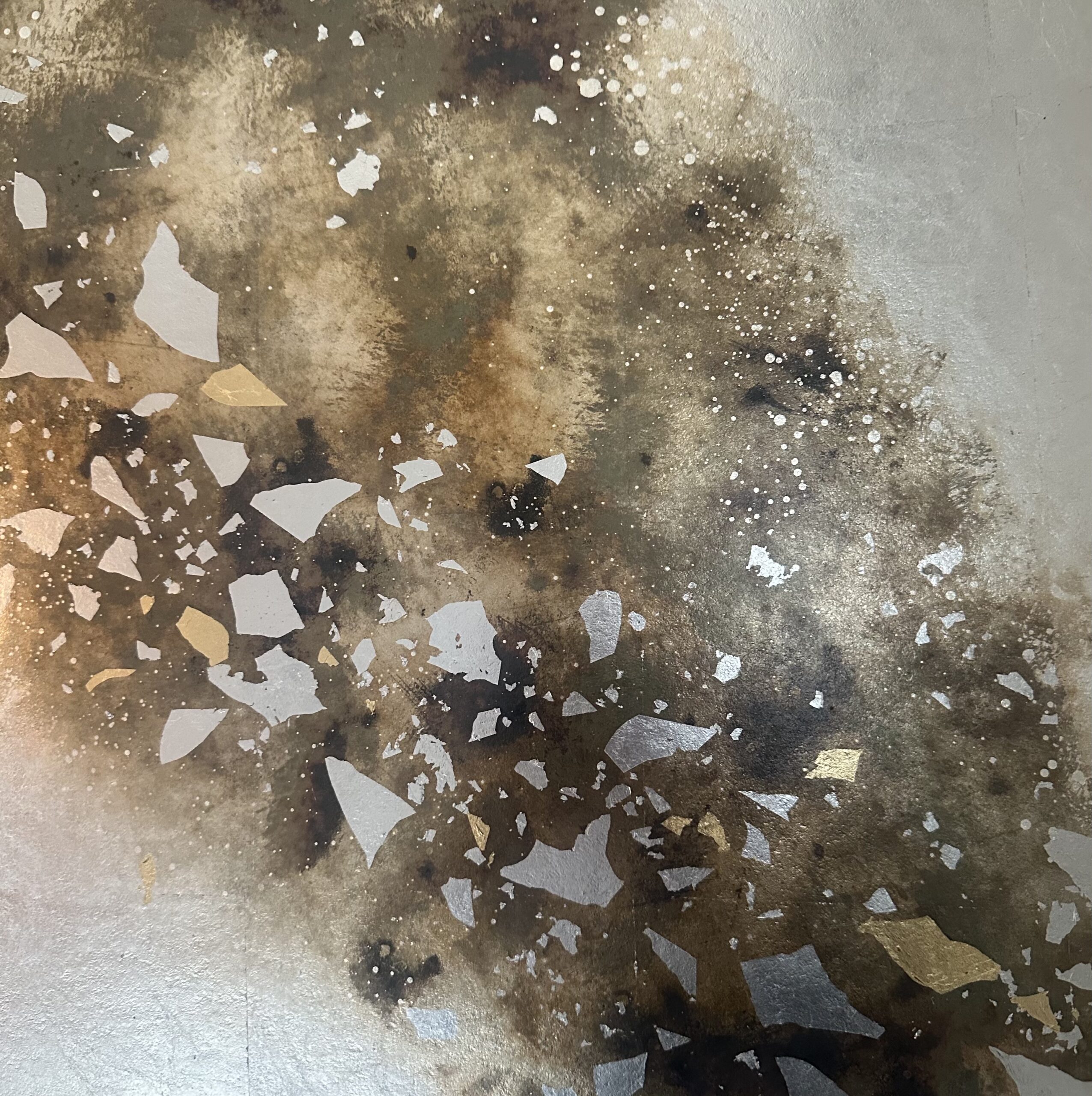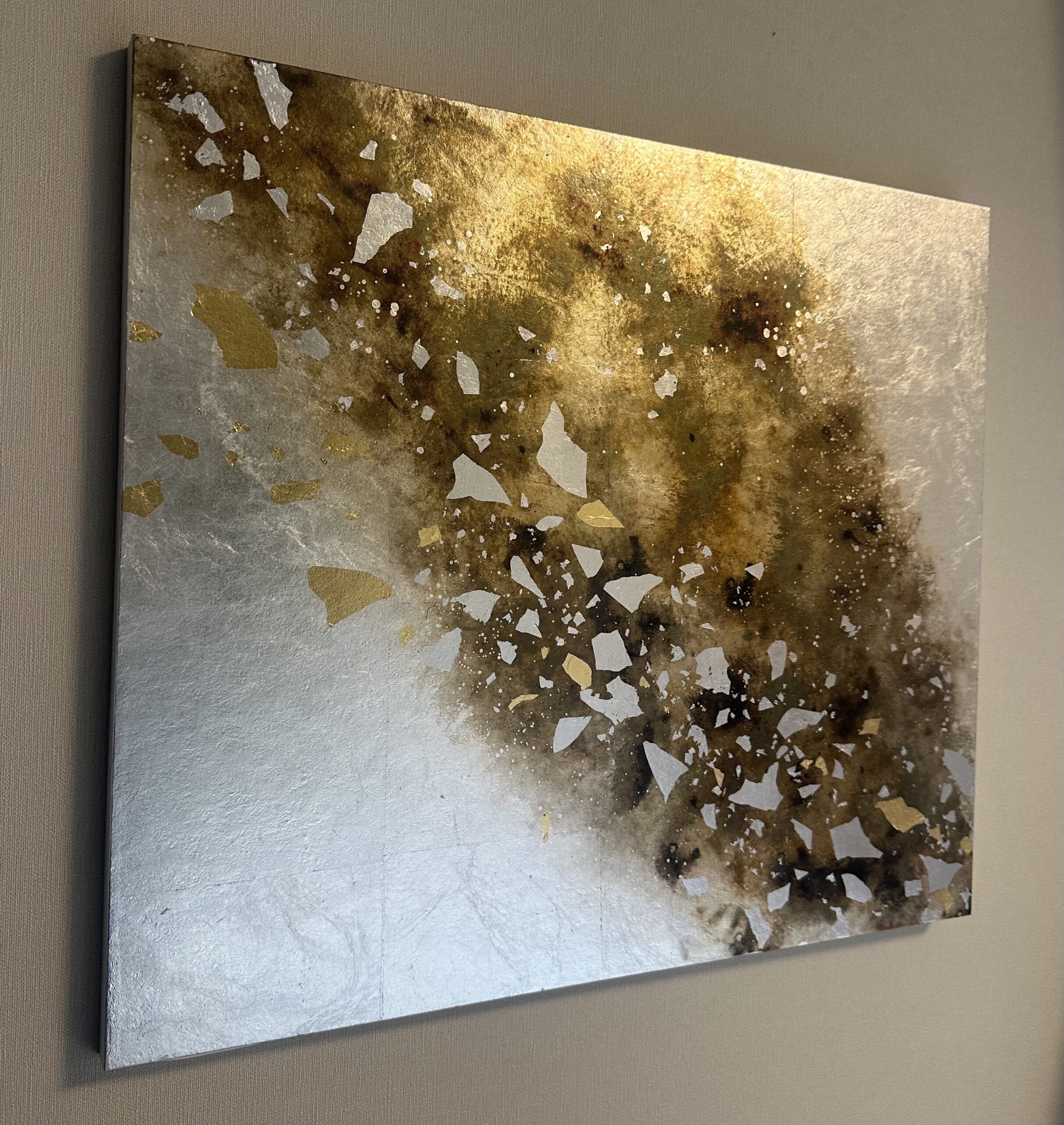 箔を使用した作品は、光のあたり方によって輝き方が変わります。日中の窓から入る自然光、夜の照明の光など、光の違いにより表情がかなり変わります。また、箔の変色を抑えるためのコーティングをしておりますが、時間経過とともに少しずつ色味が変化します。その変化もお楽しみいただけますと幸いです。
