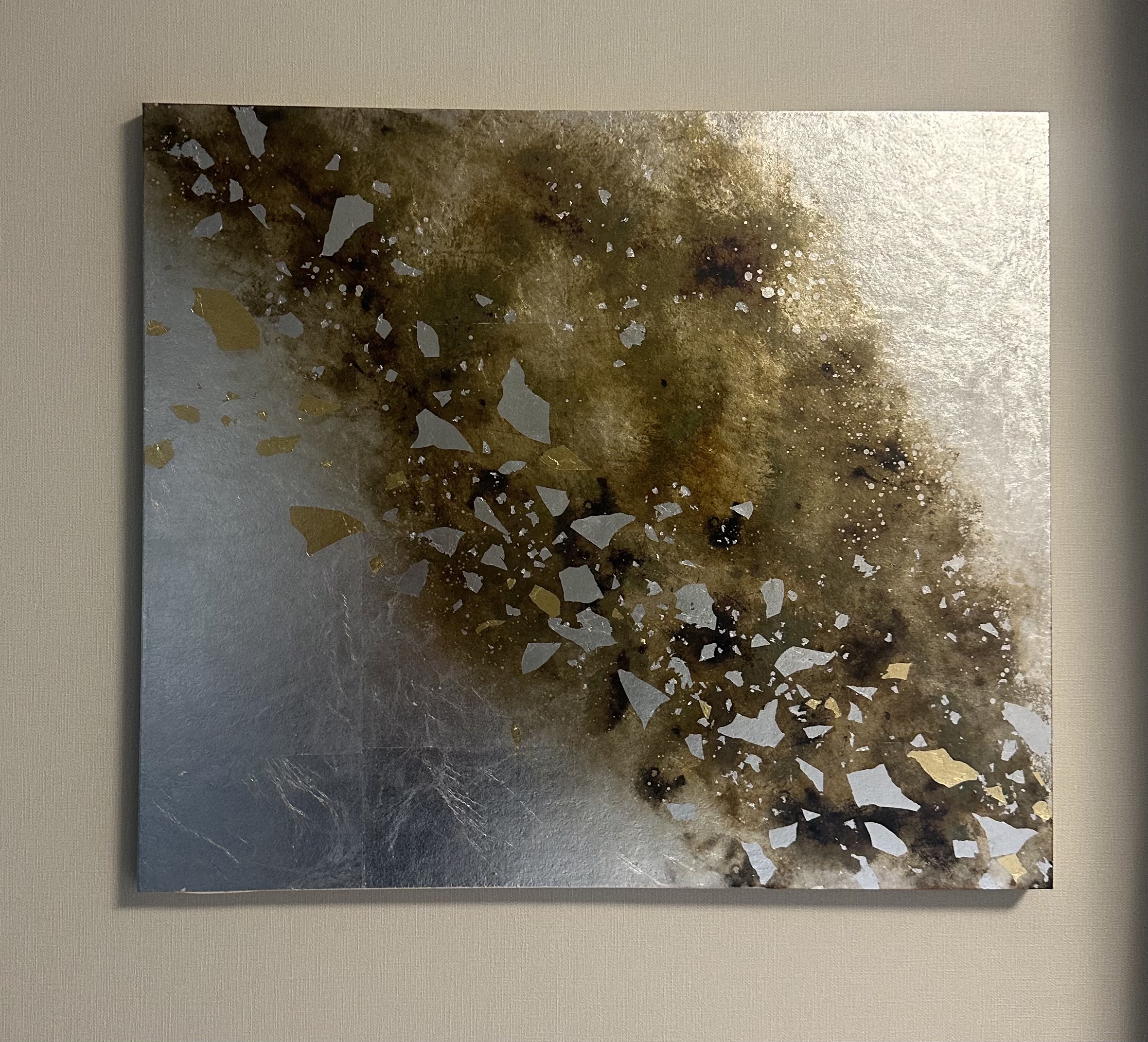 希望や願い、遠い記憶までもそっと語りかけてくれるような星空をお部屋に… 銀箔を貼り、一部を硫化してブロンズ色へ変化させた上に金属箔をのせて、彼方まで広がる星空を表現しました。 光のあたり方によって輝き方が変わります。日中の窓から入る自然光、夜の照明の光など、光の違いにより表情がかなり変わります。