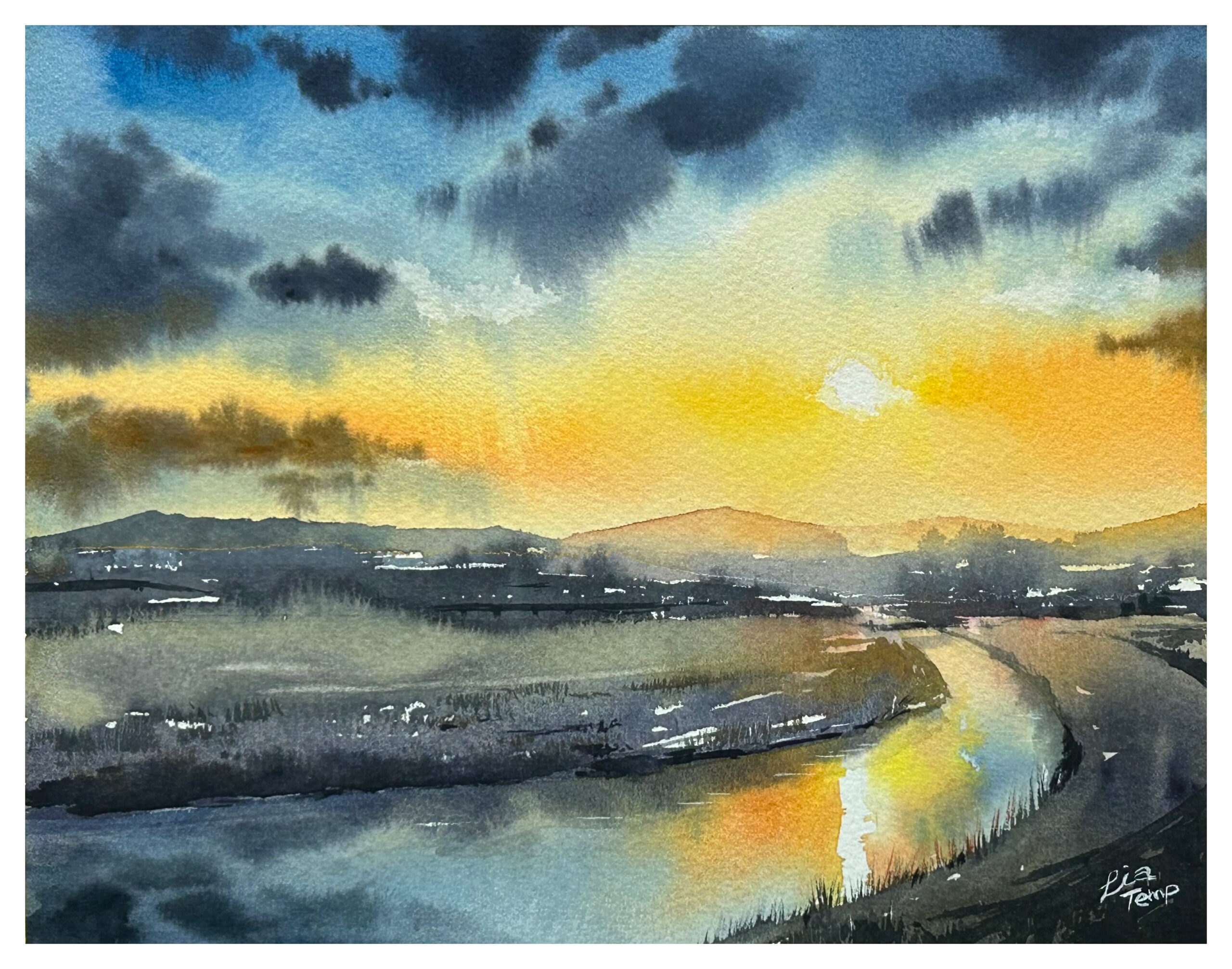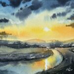 水彩画です。いつもの散歩コースの夕暮れを、私なりにアレンジして描きました。
