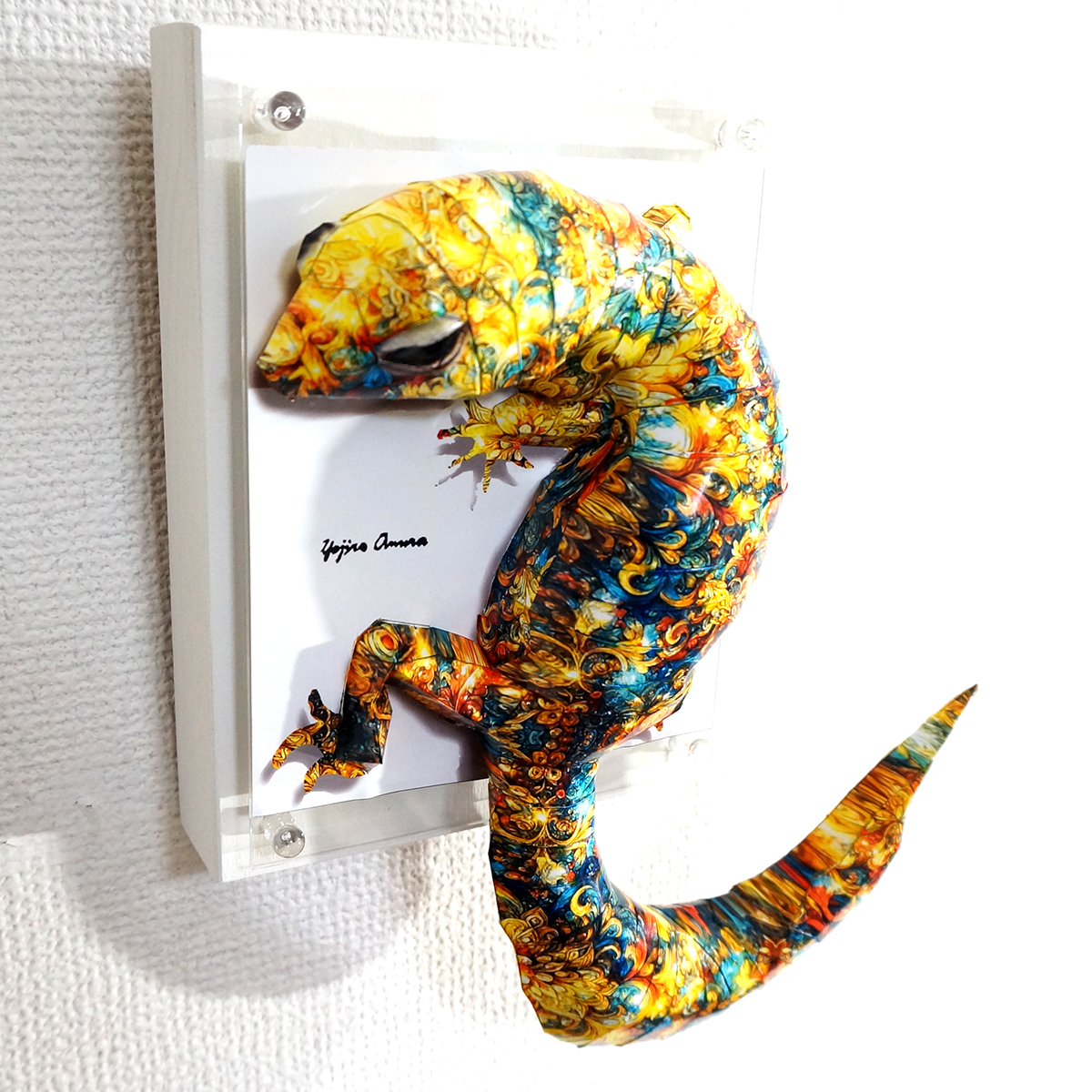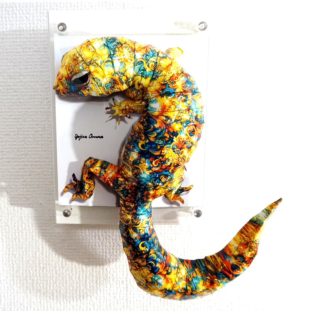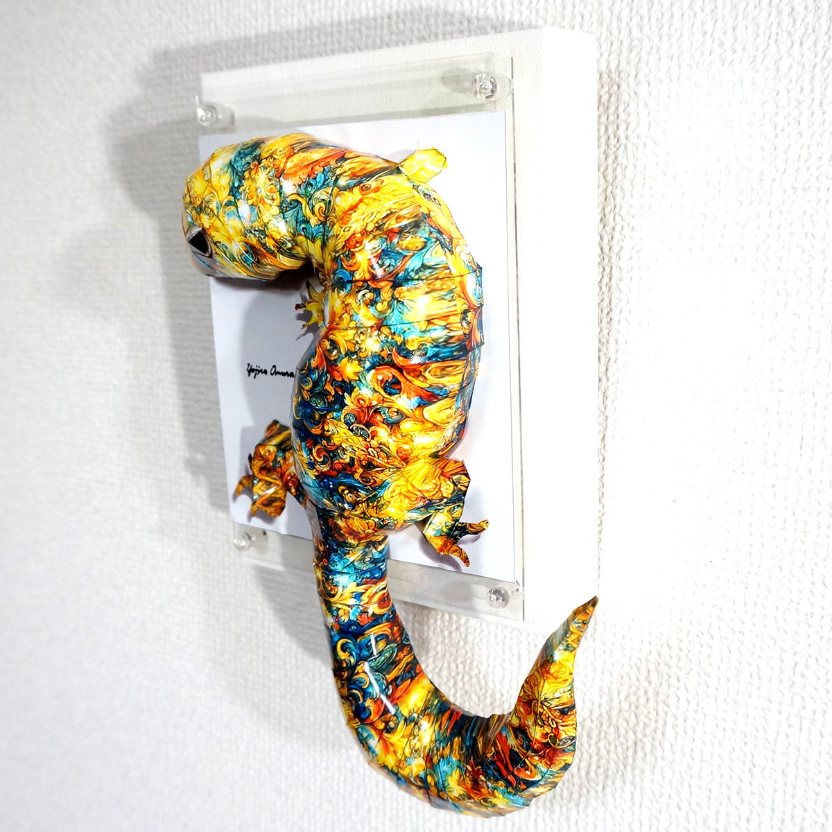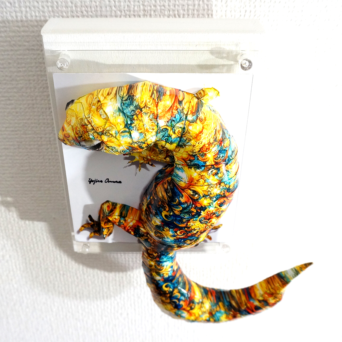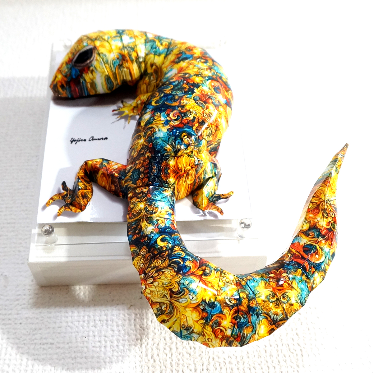 トカゲのコラージュ画像を作成し、ペーパークラフト技術を用いて立体的に表現した作品です。