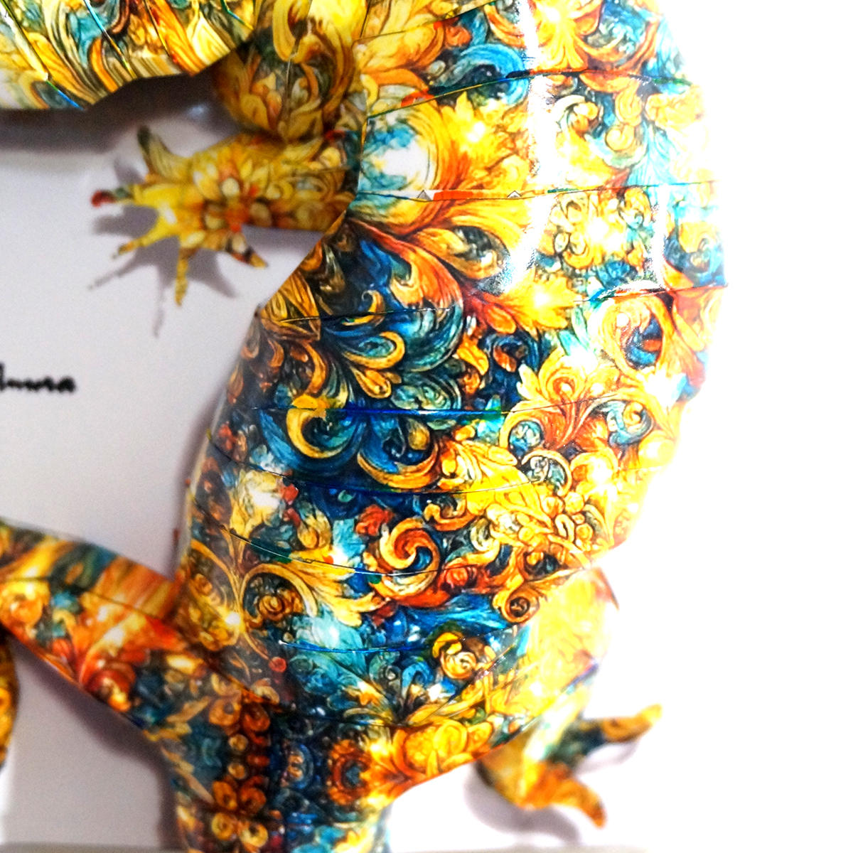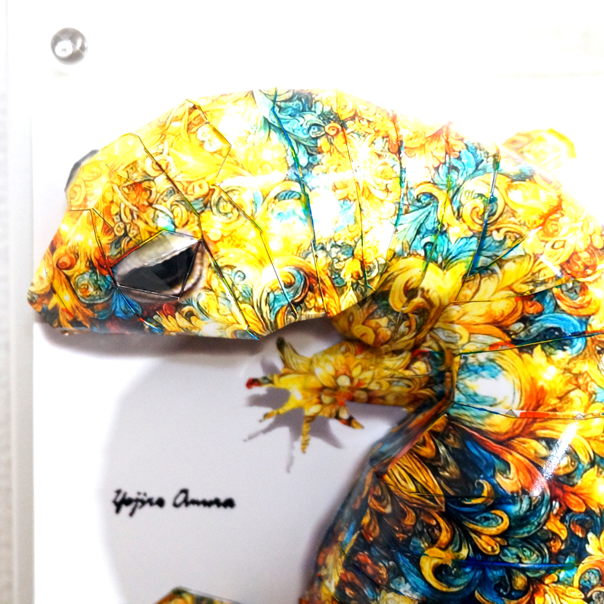 光をまばゆく放つシャイニーなイメージ模様を作成し、トカゲ本来の表情と重ね合わせてデザインいたしました。表面上は光沢紙の艶のある質感となっております。