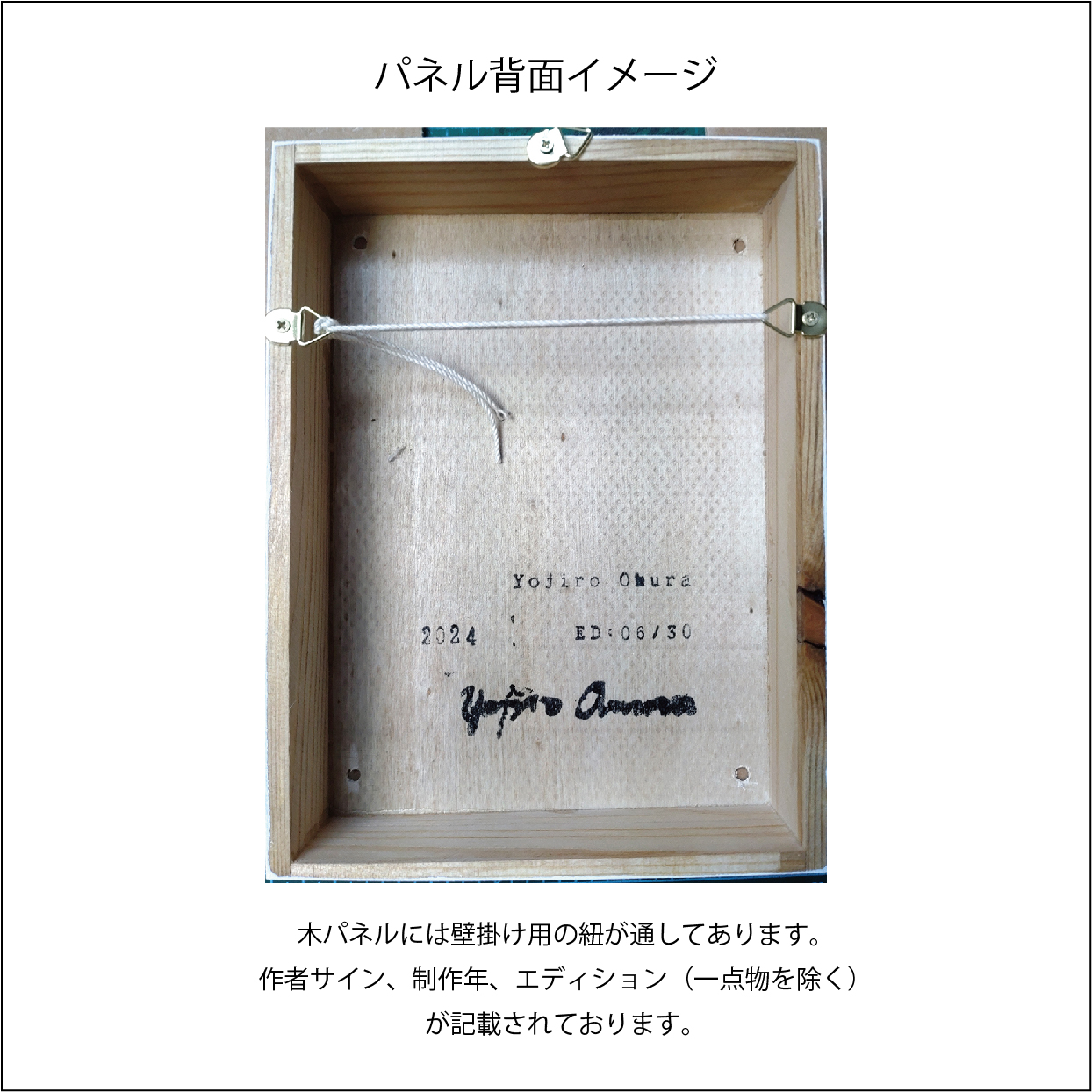 パネルの裏面には紐掛け用のフックを取り付け、制作年、作者サインを記しております。