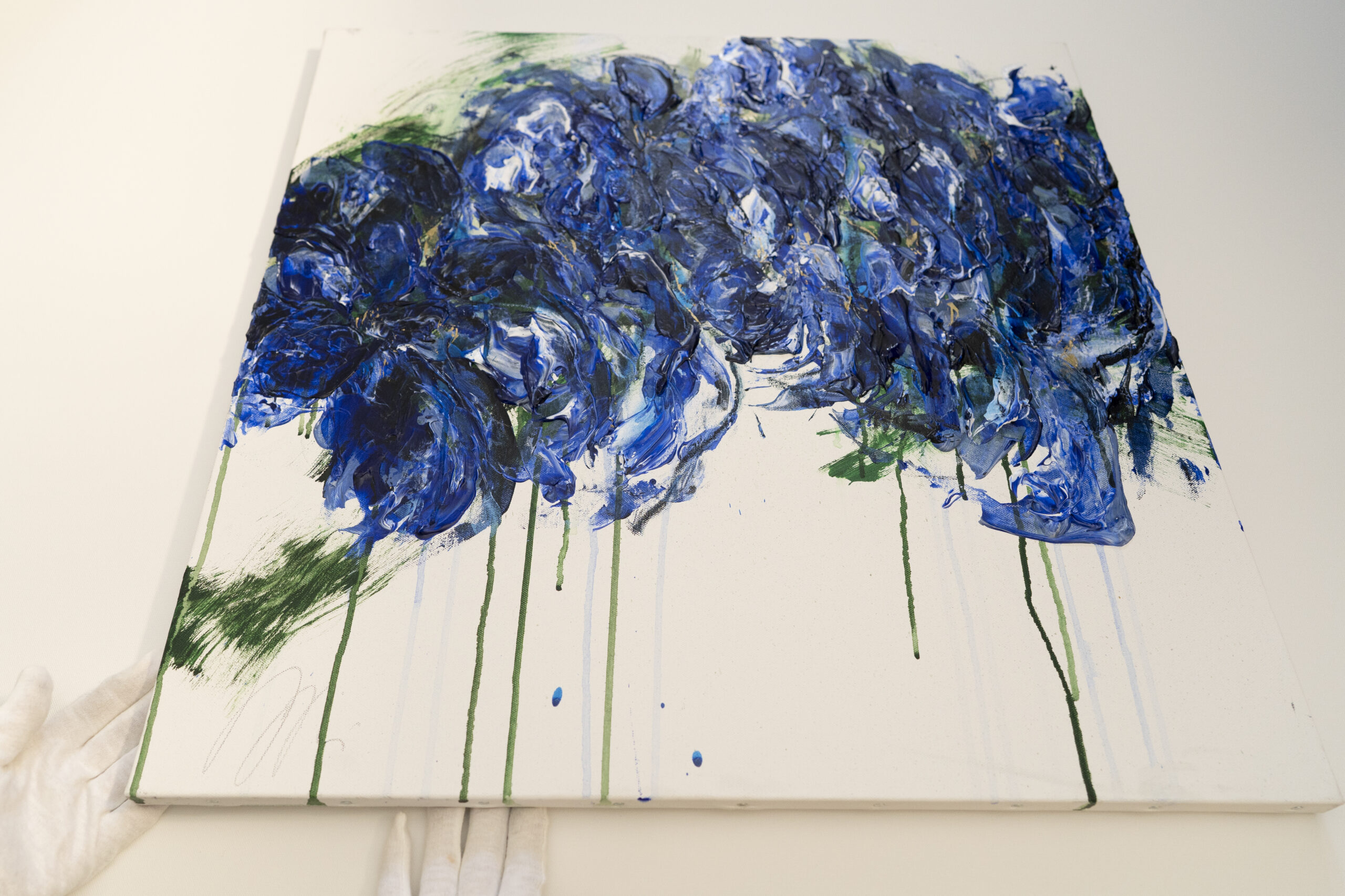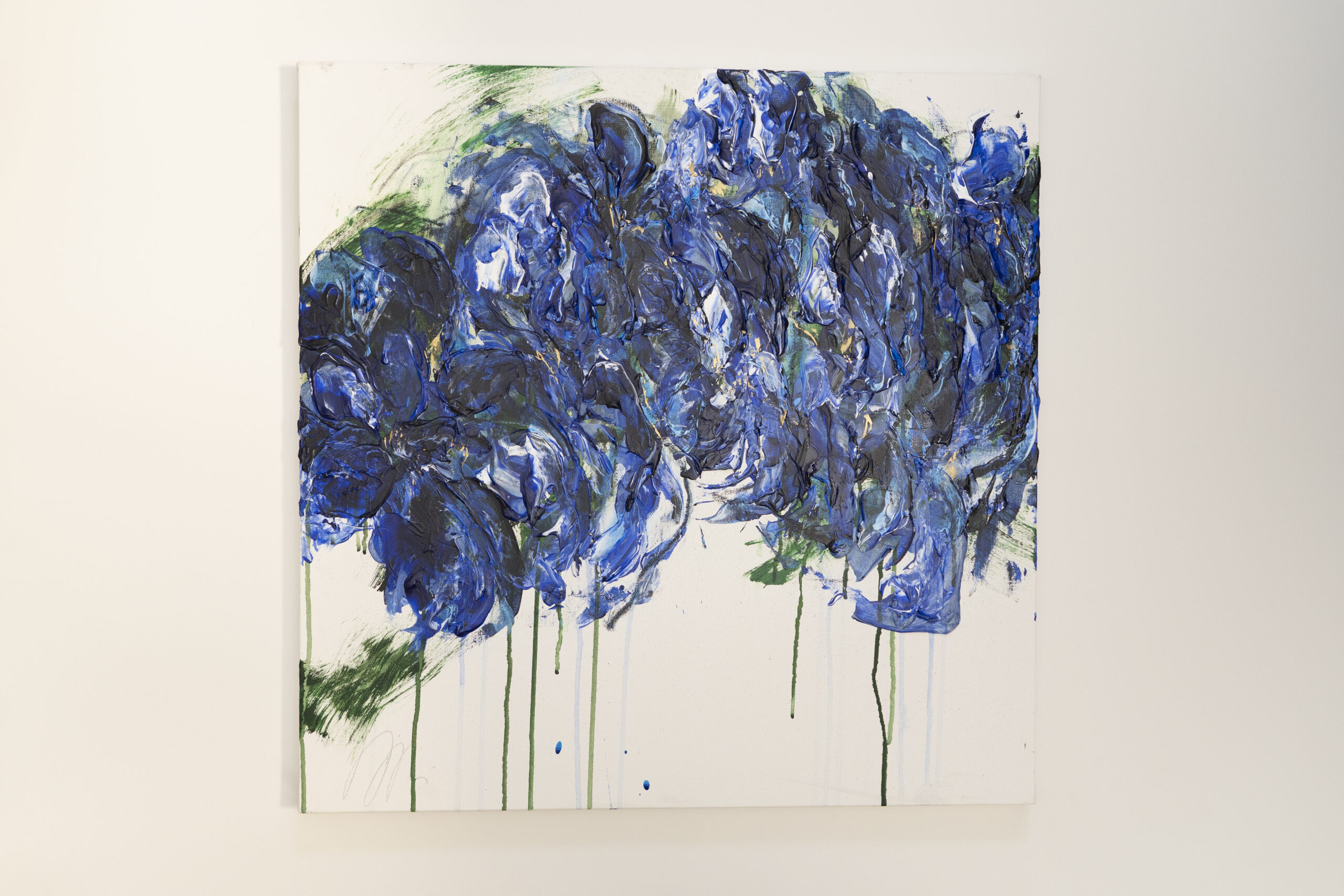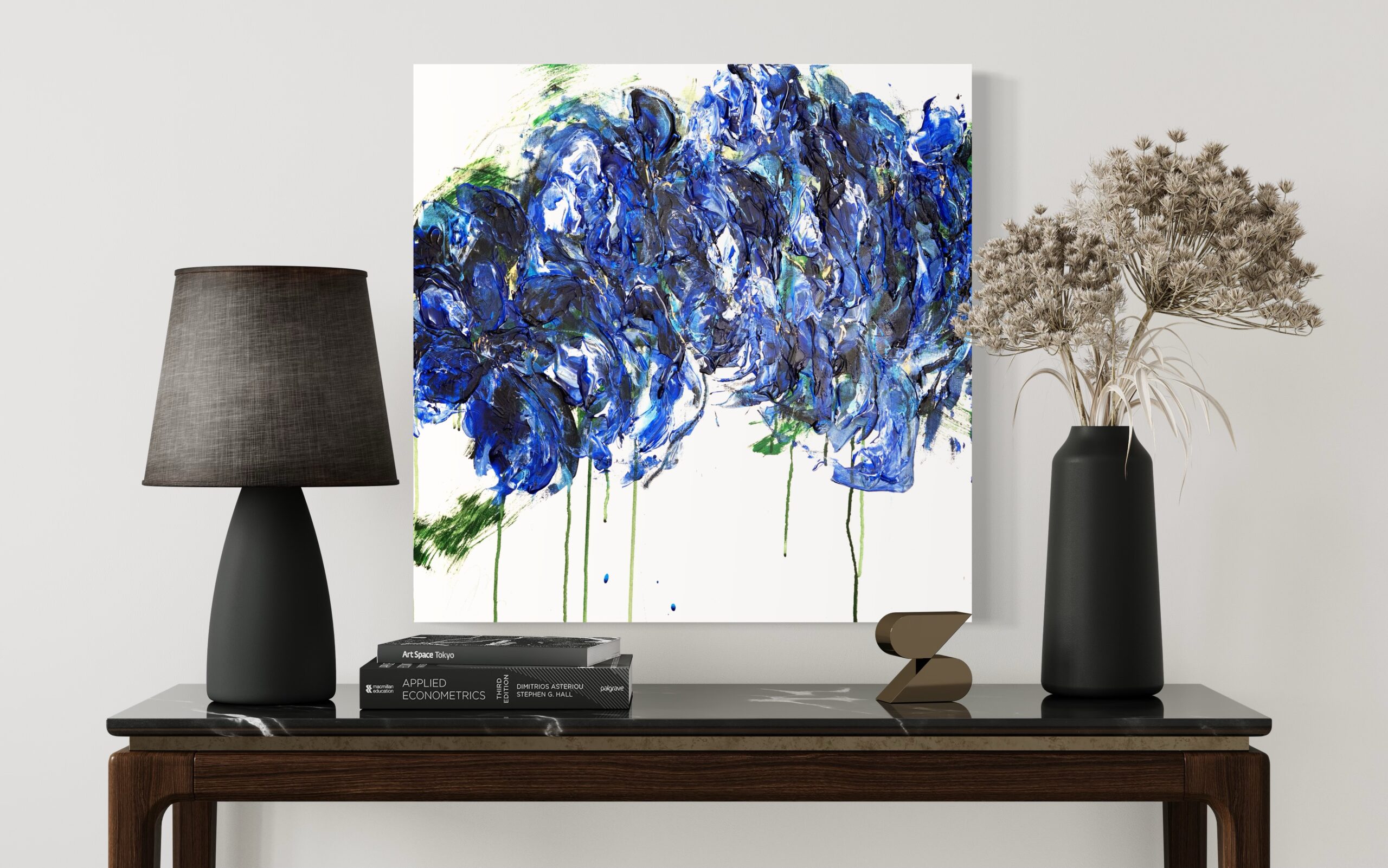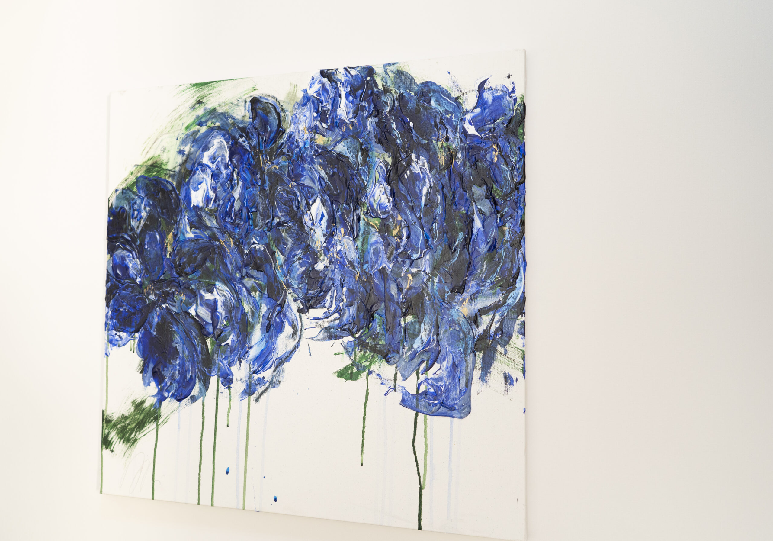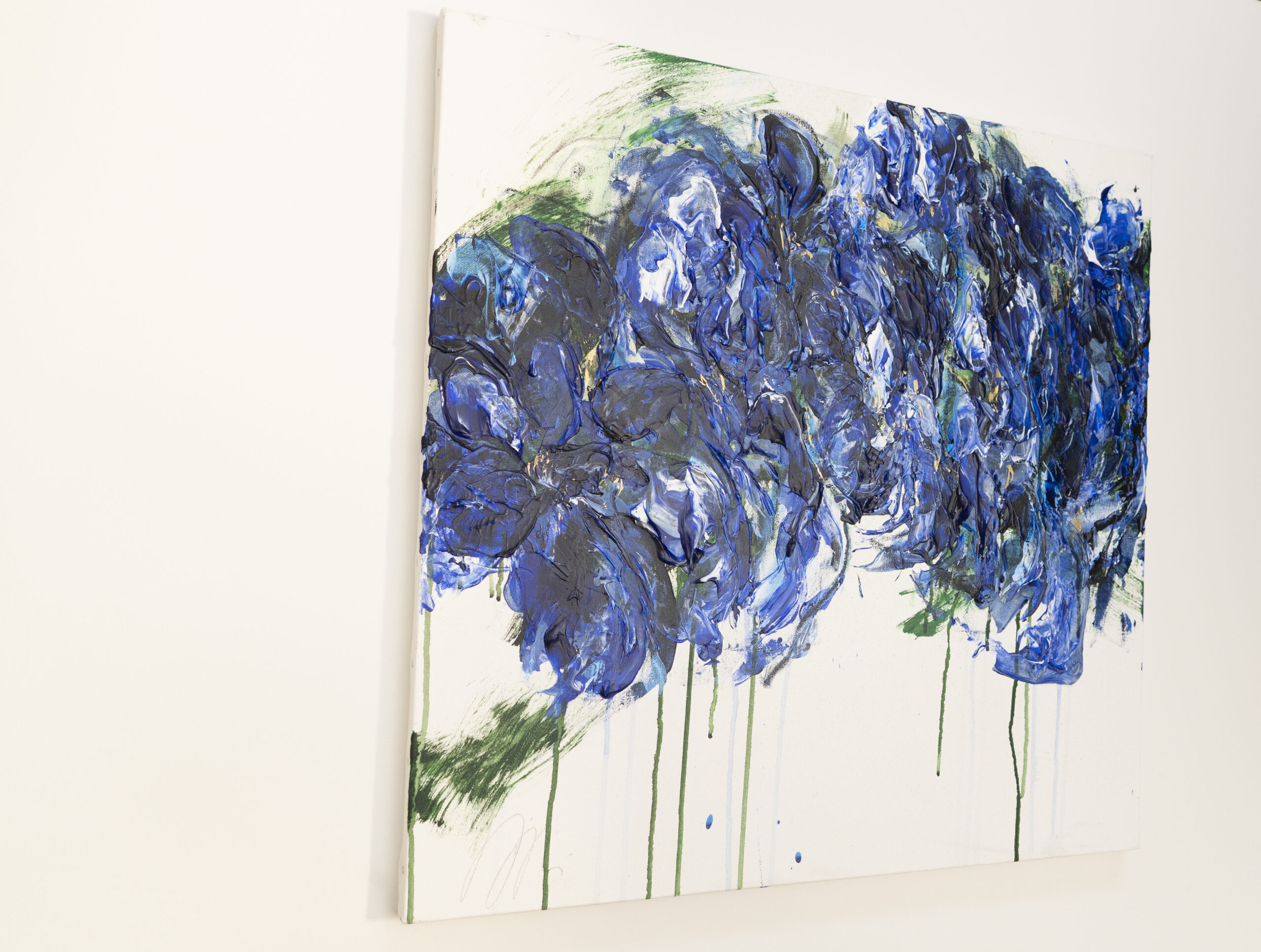 青い花を抽象的に美しく描いた作品。いくつものブルーを重ねとても存在感があり綺麗です。