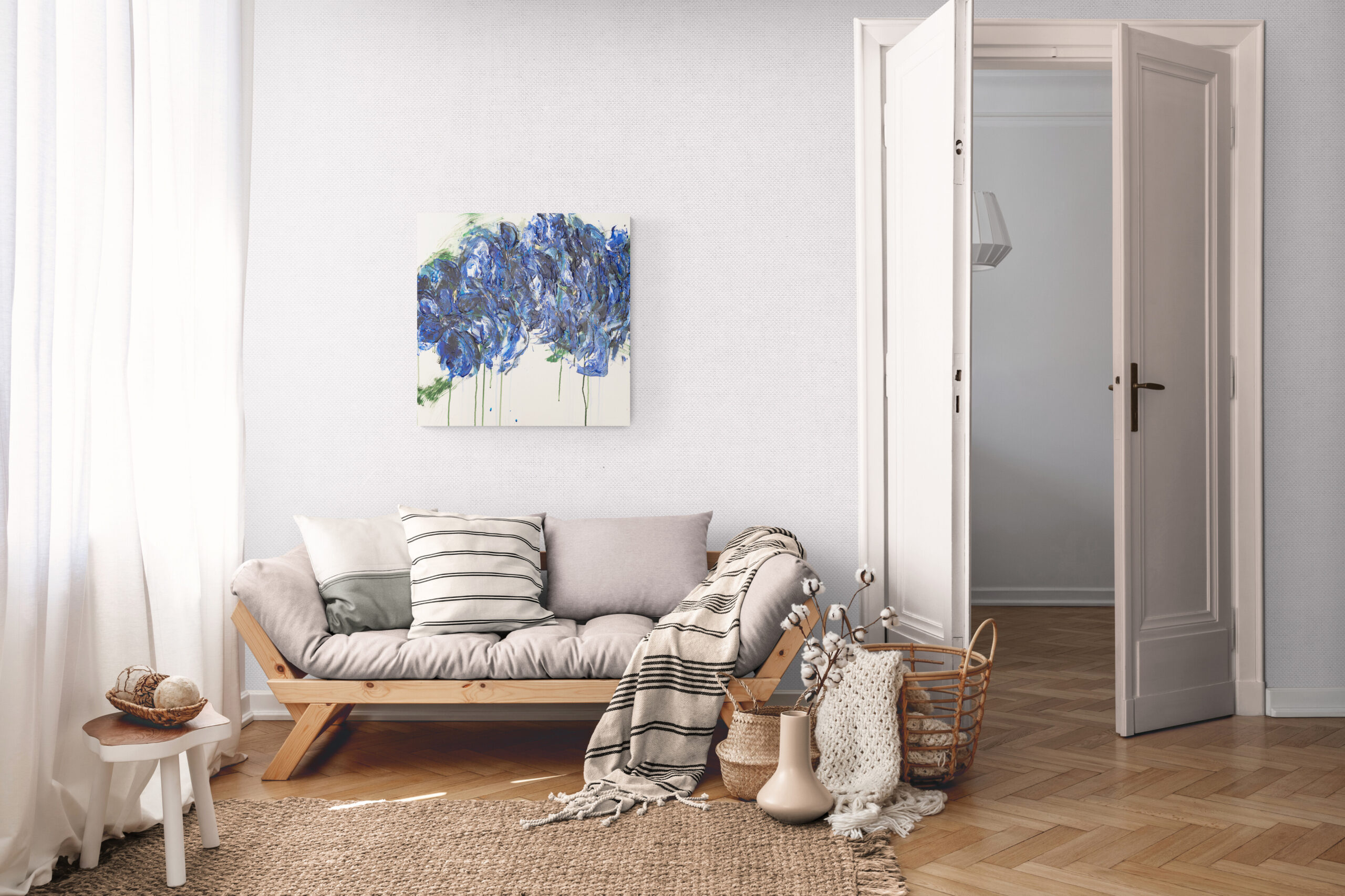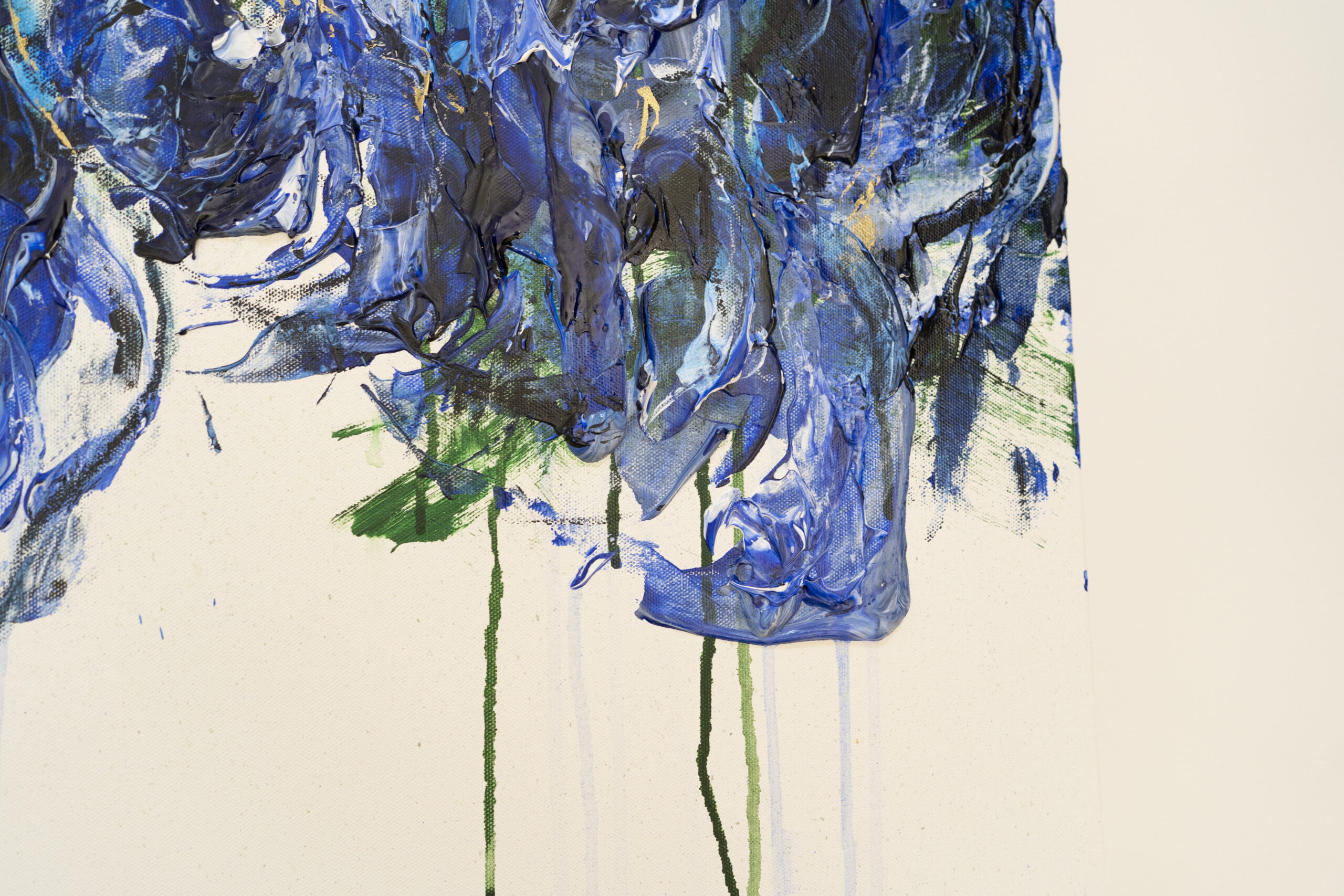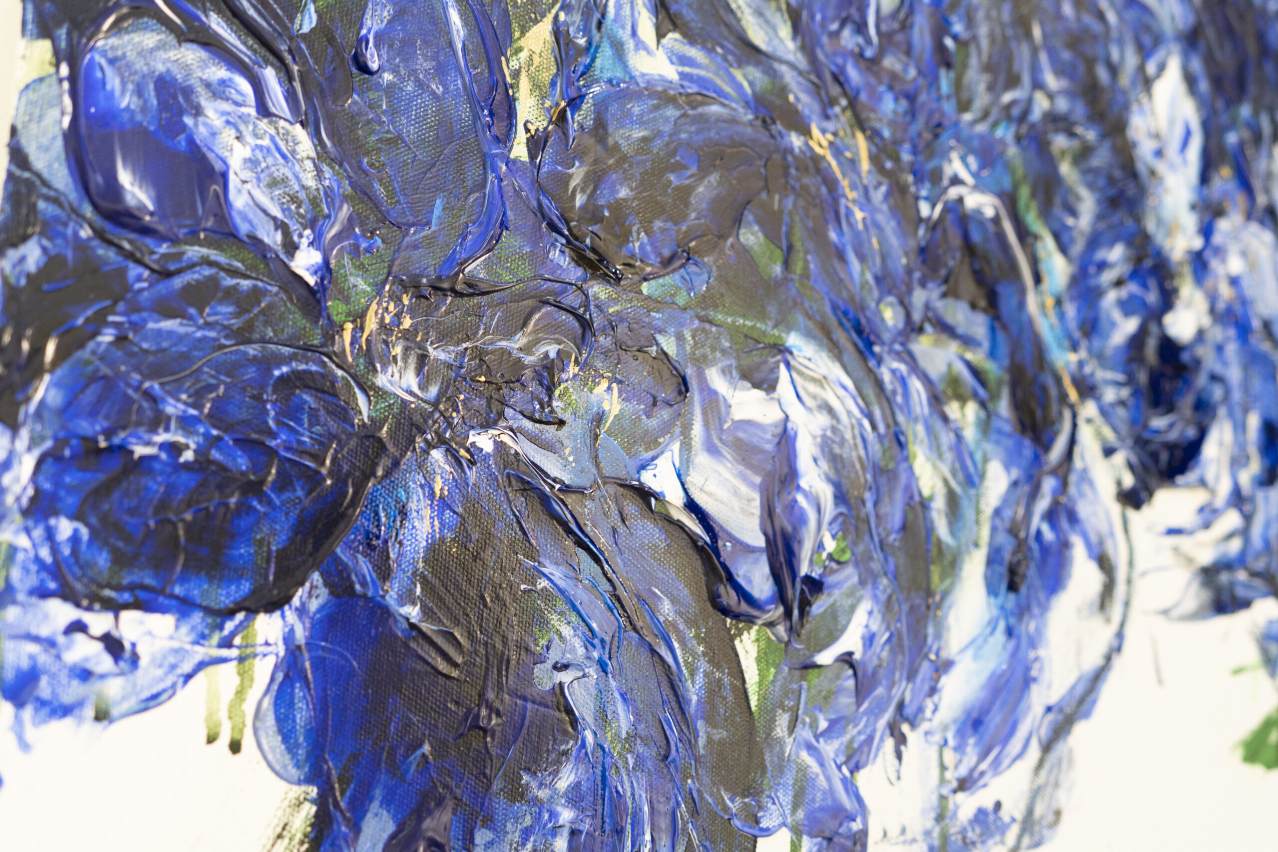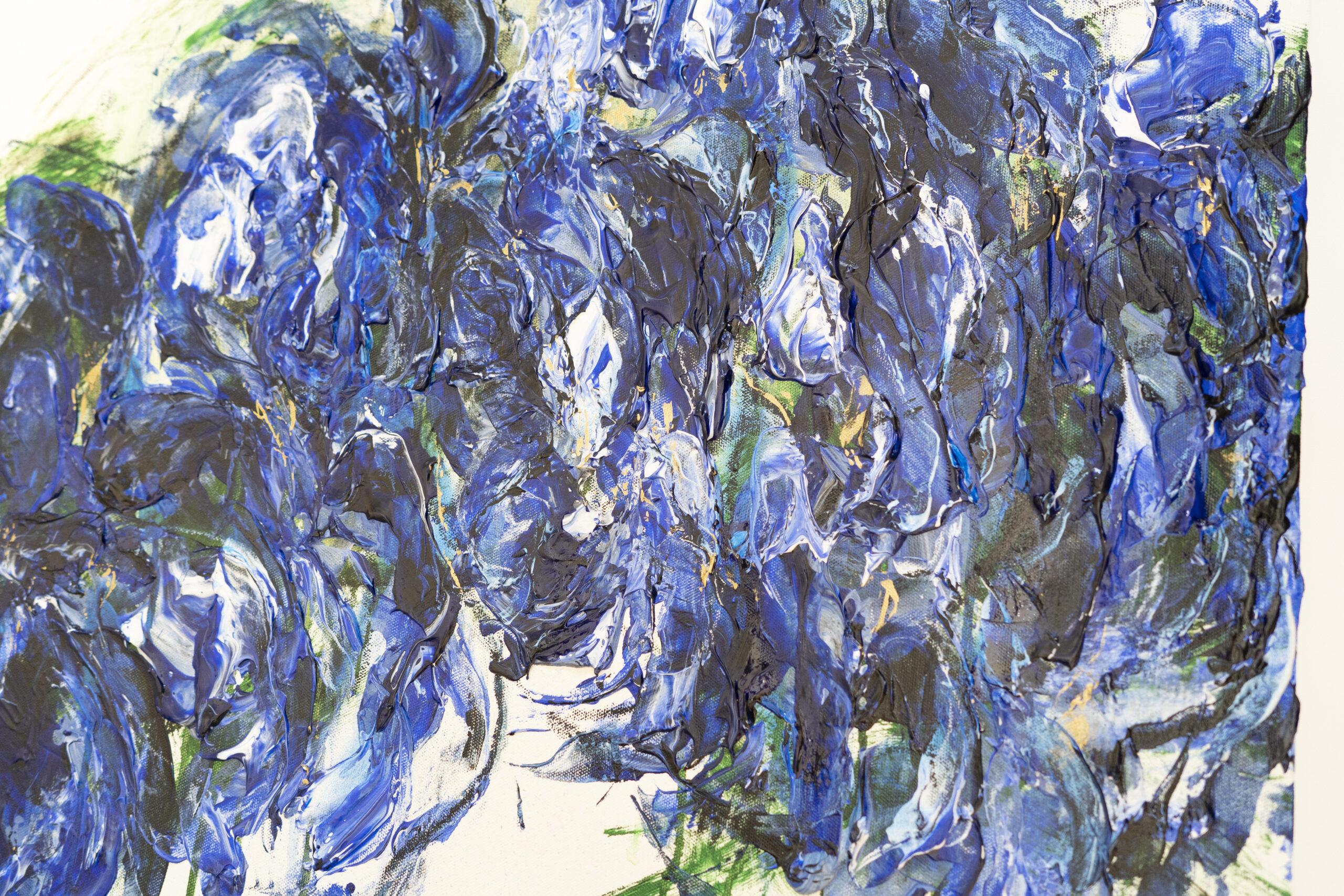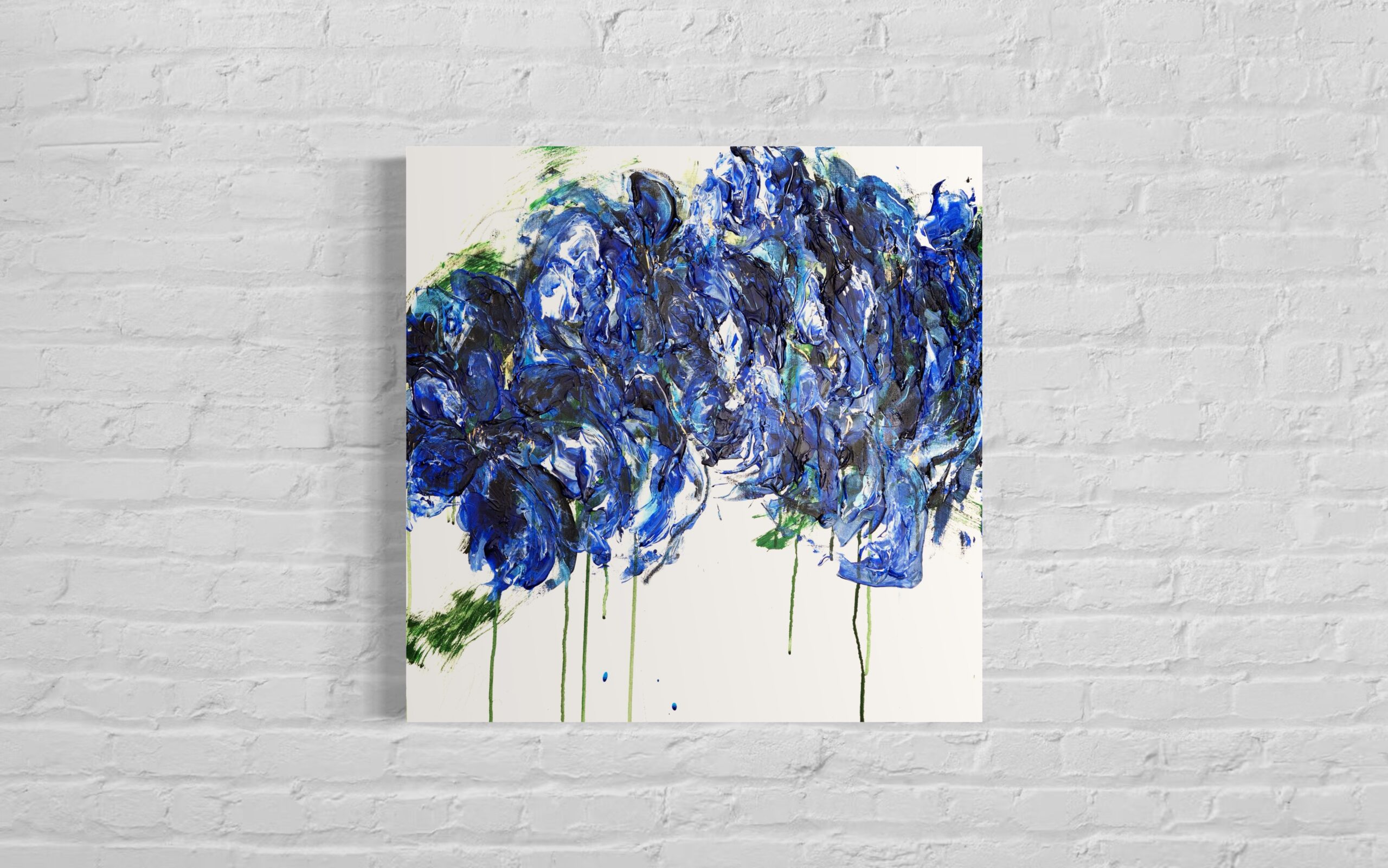 青い花を抽象的に美しく描いた作品。いくつものブルーを重ねとても存在感があり綺麗です。