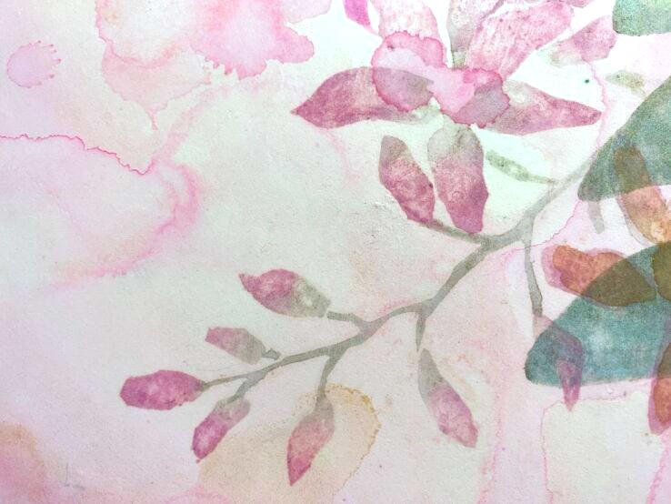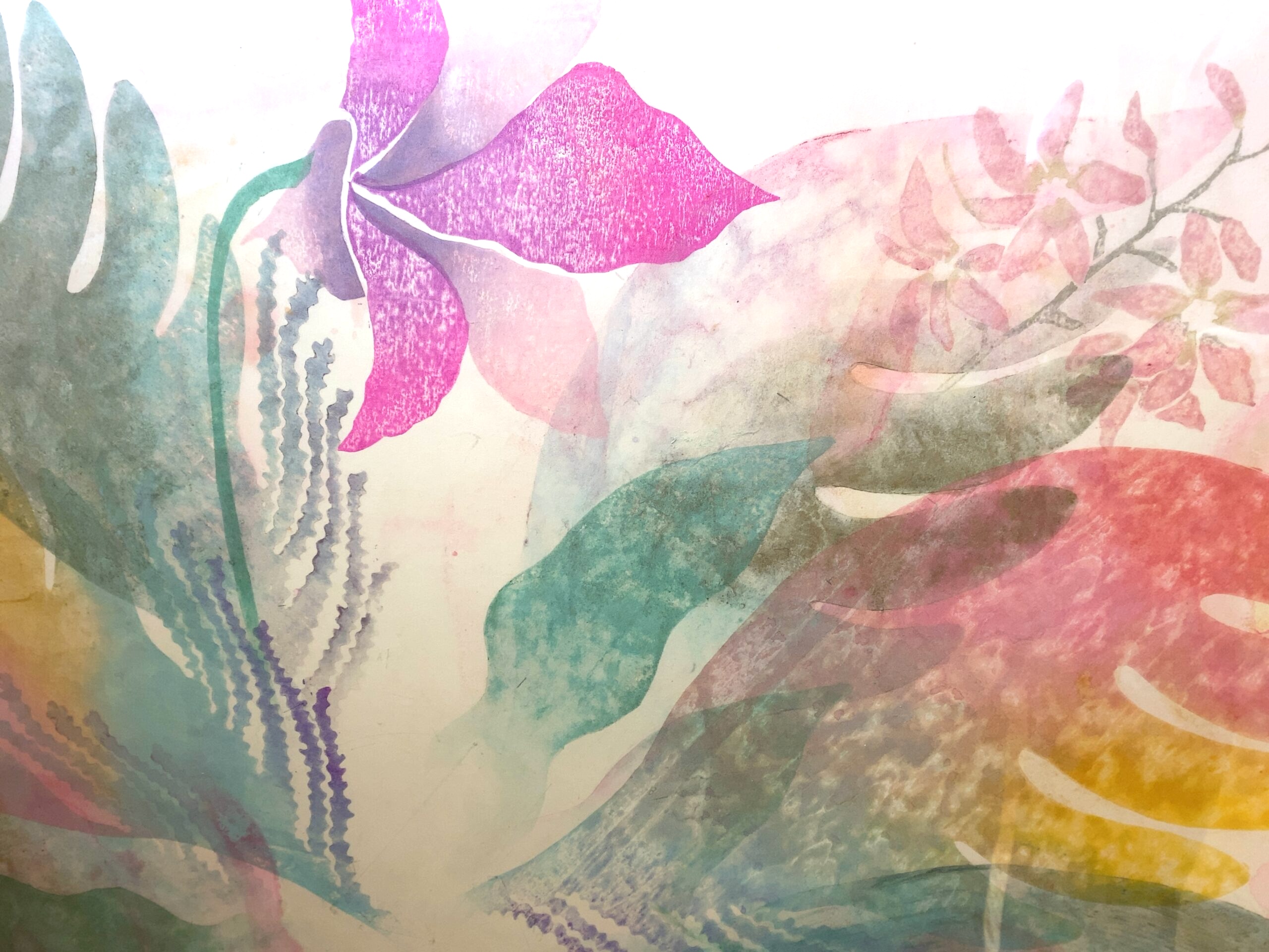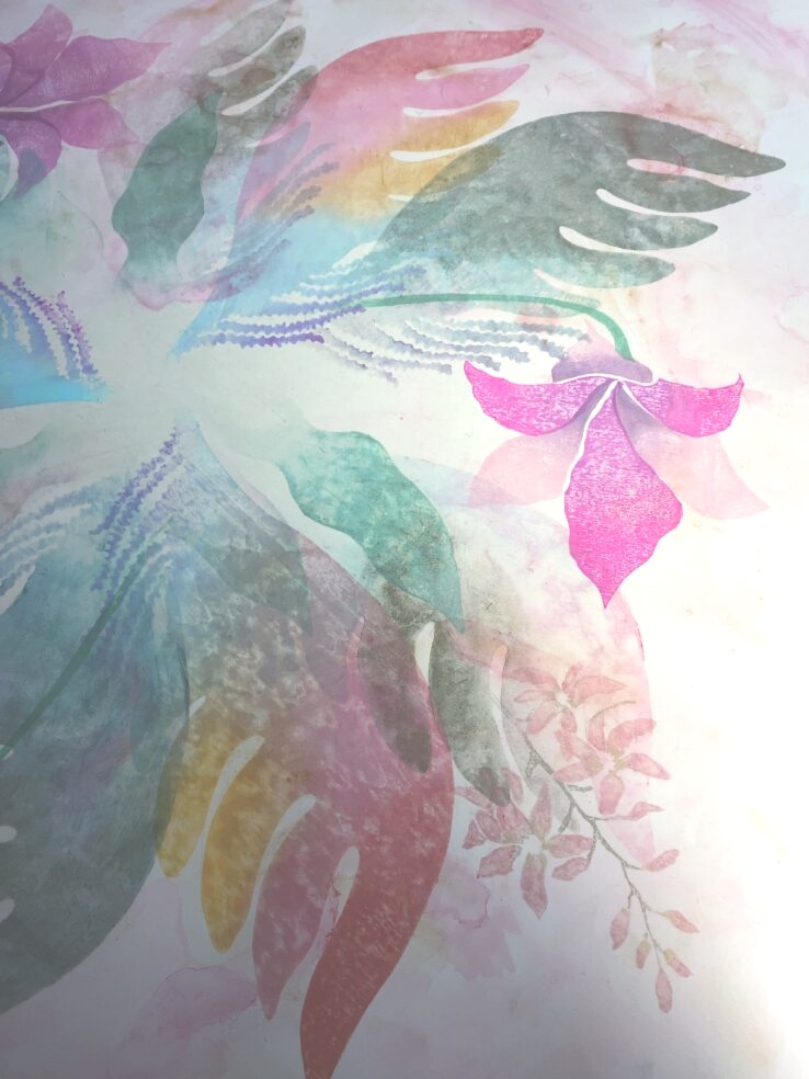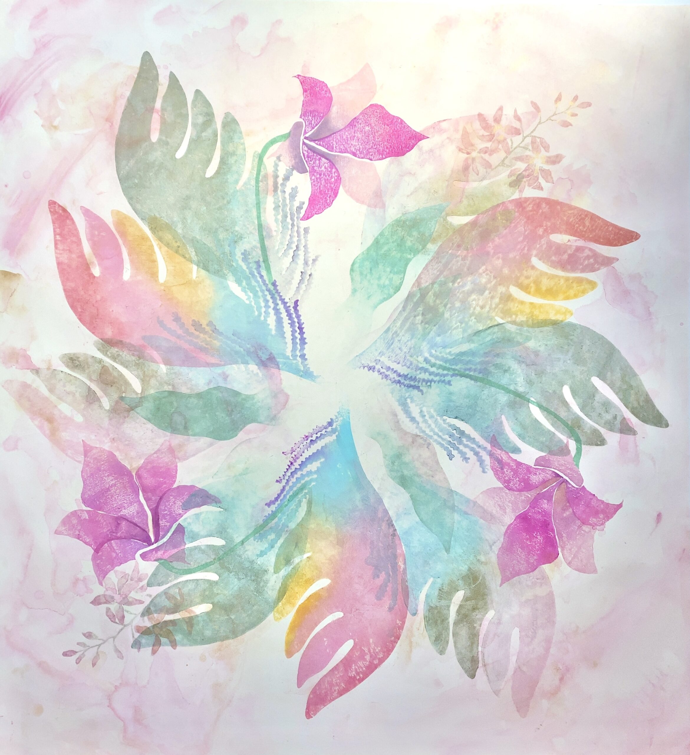 透明感のある花弁や葉、カラフルなパステルカラーの羽根が、エネルギッシュに開いてゆく朝のイメージ