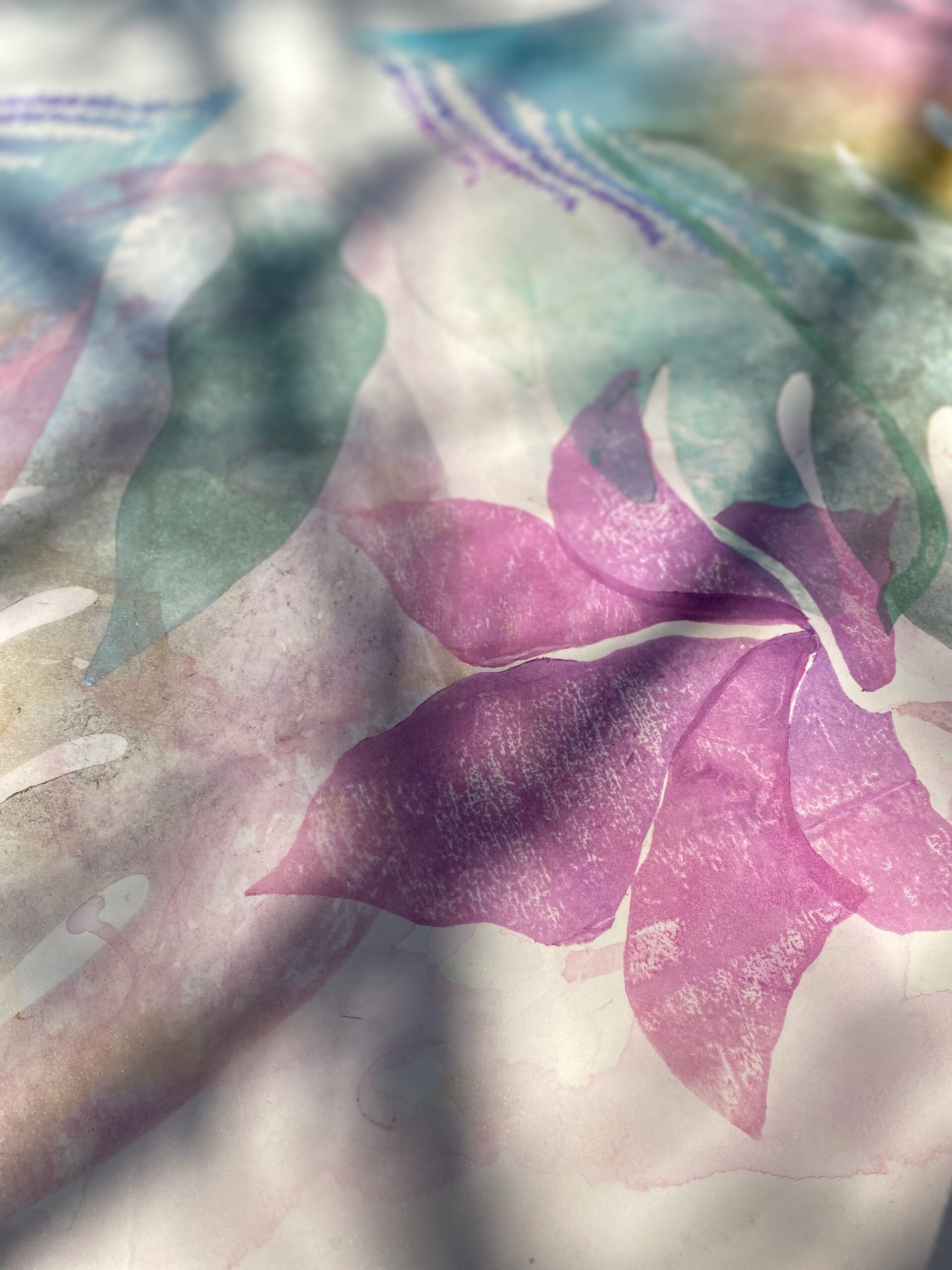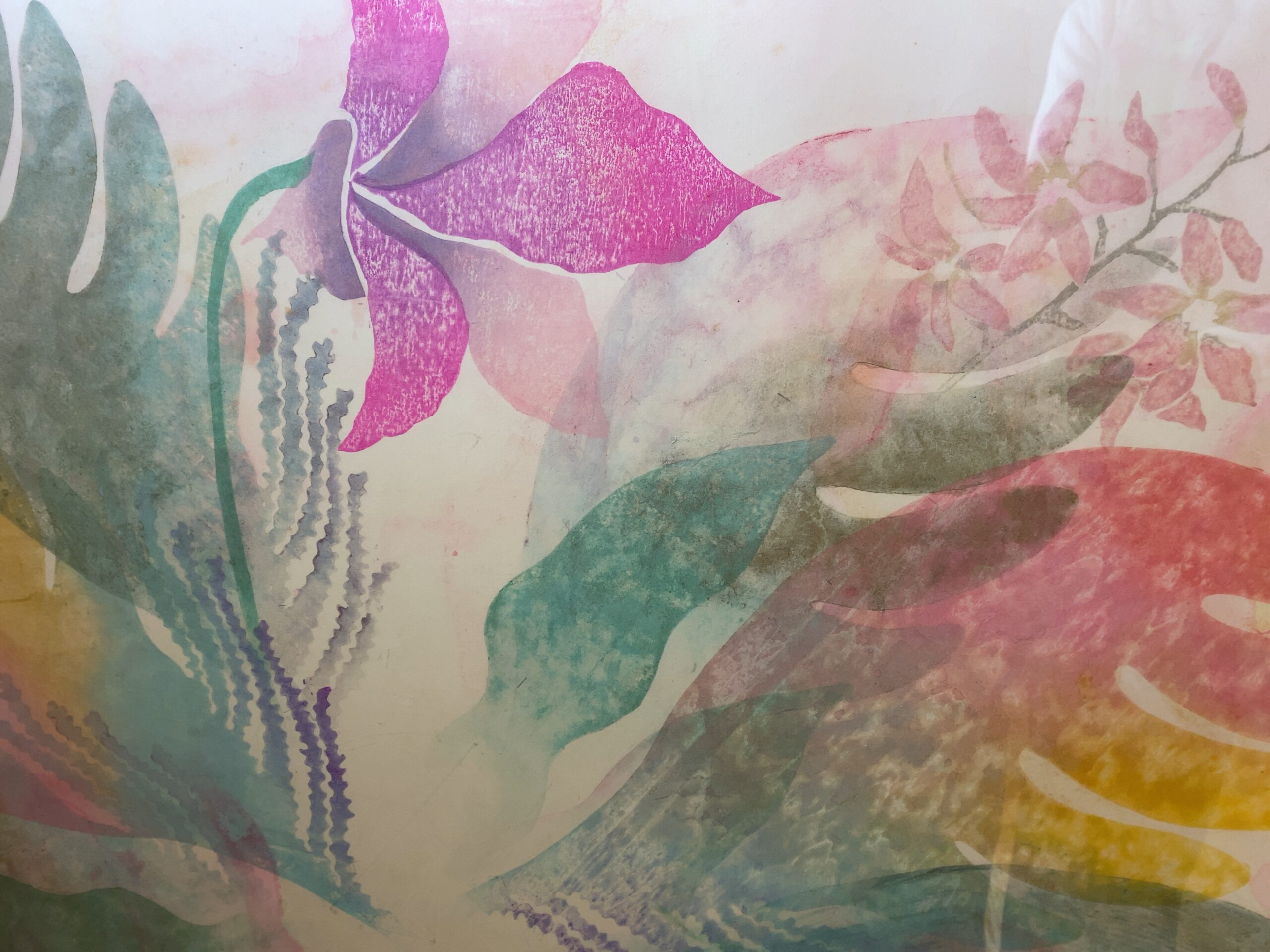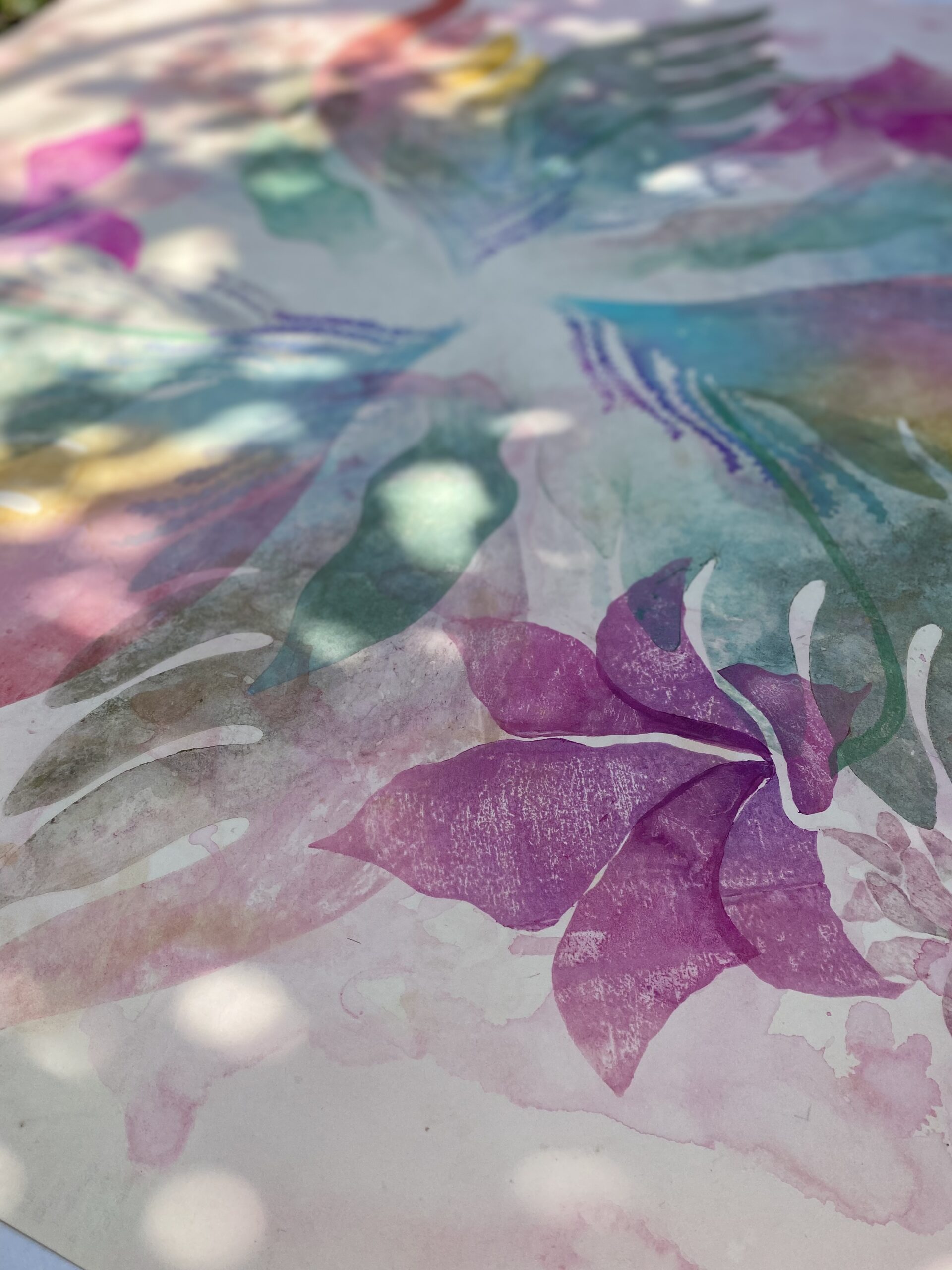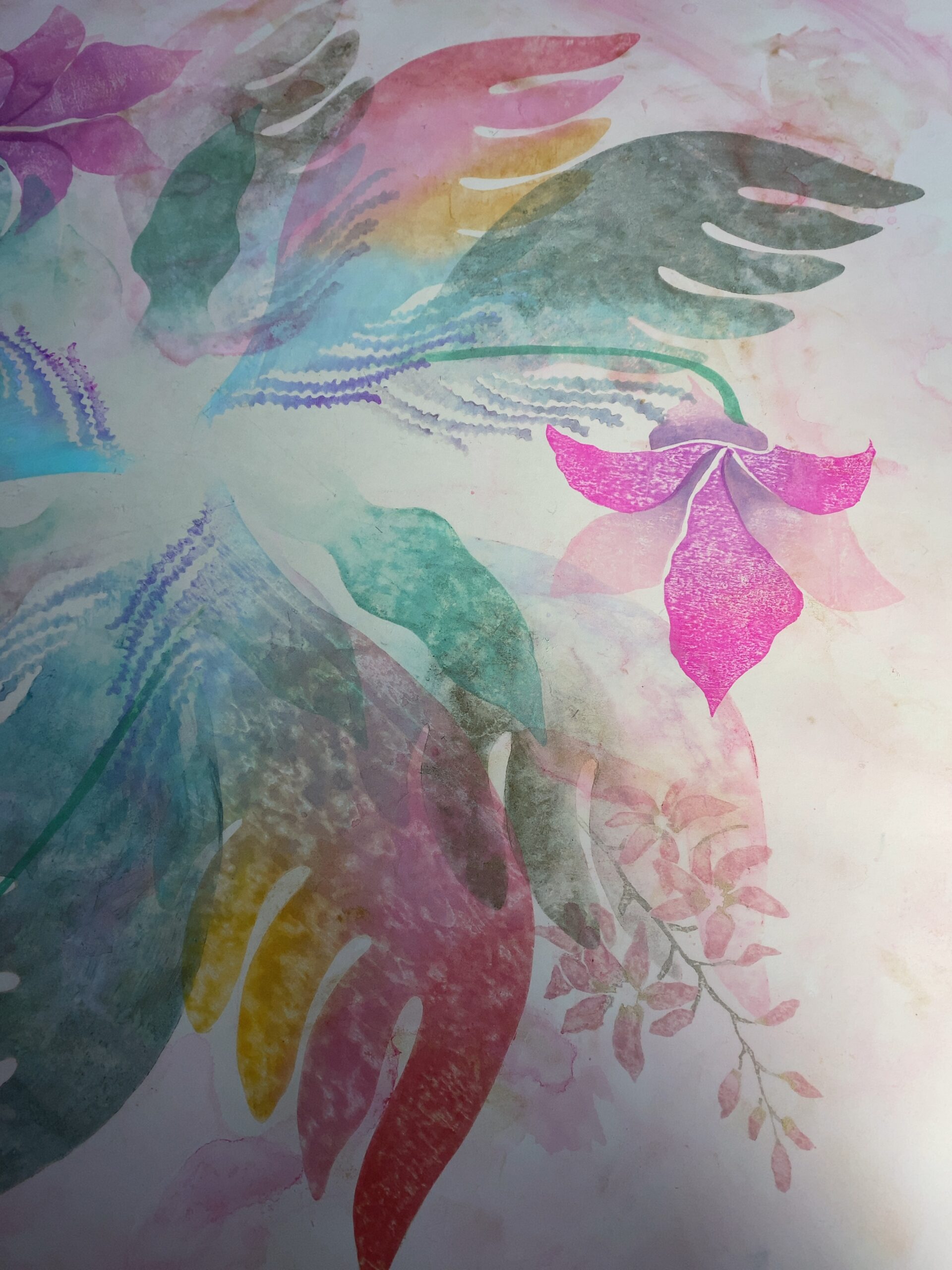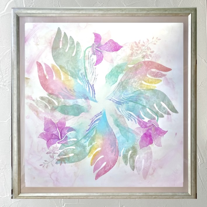 透明感のある花弁や葉、そしてカラフルなパステル系の羽根が、ふわりと開いてゆくような