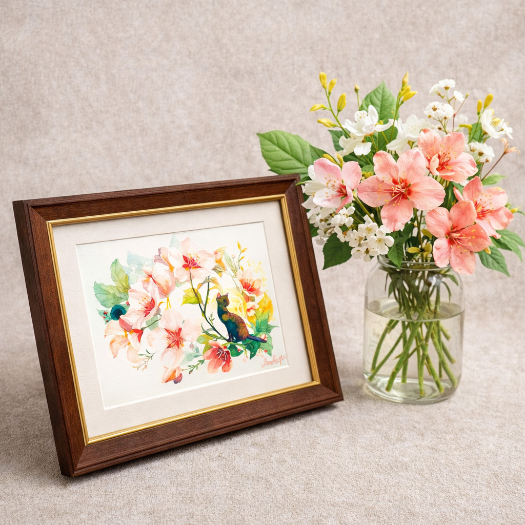 透明水彩の滲みの中に、Dr.マーチンのインディアインクによる鮮やかな発色を効かせ、宝石のような深みを生み出しました。色鉛筆を重ねることで、花びらの柔らかさと猫の幻想的な質感を細部まで丁寧に描き込んでいます。