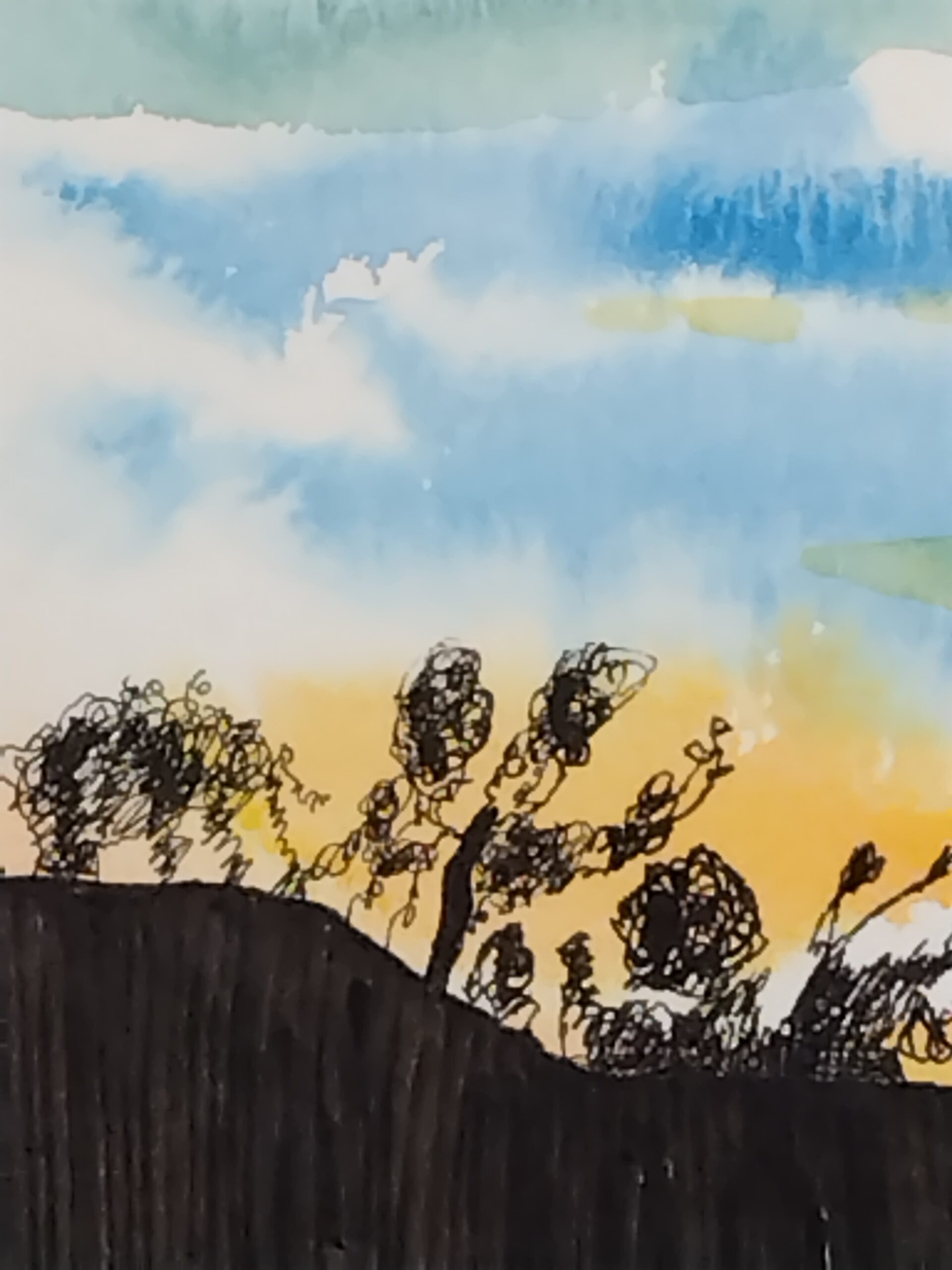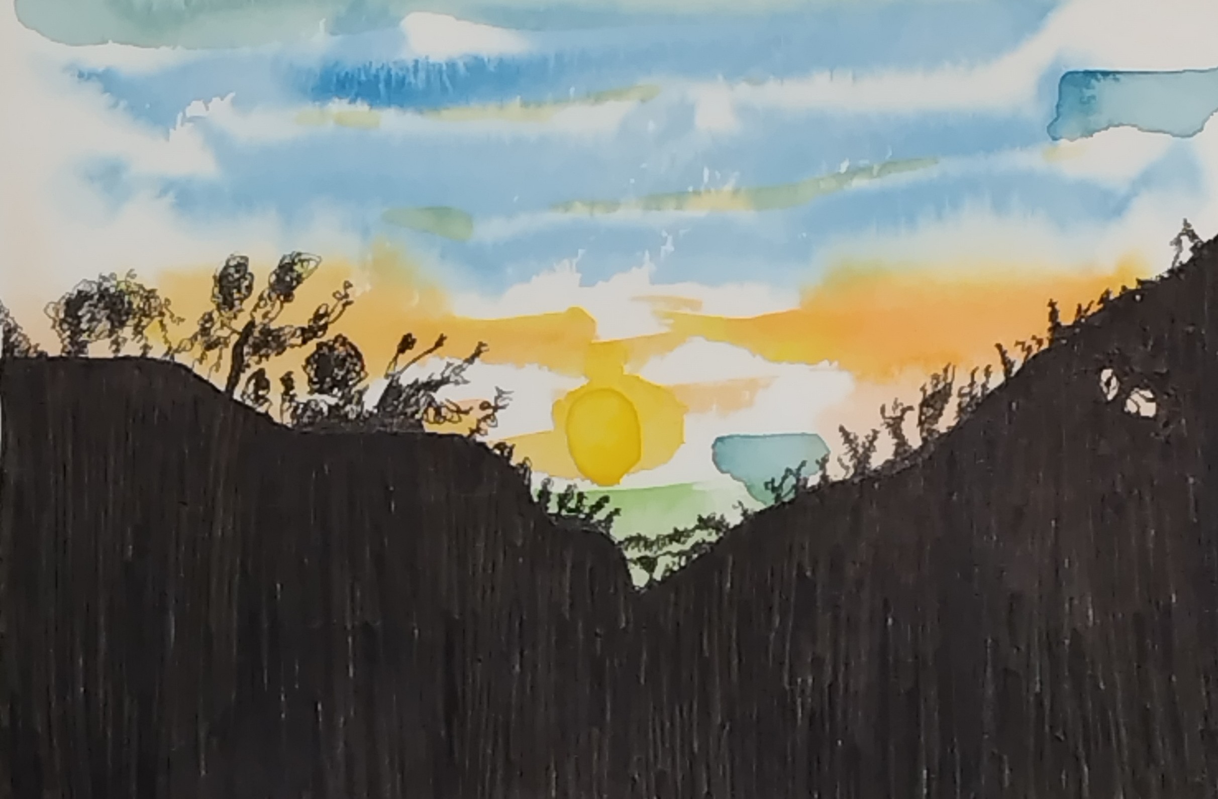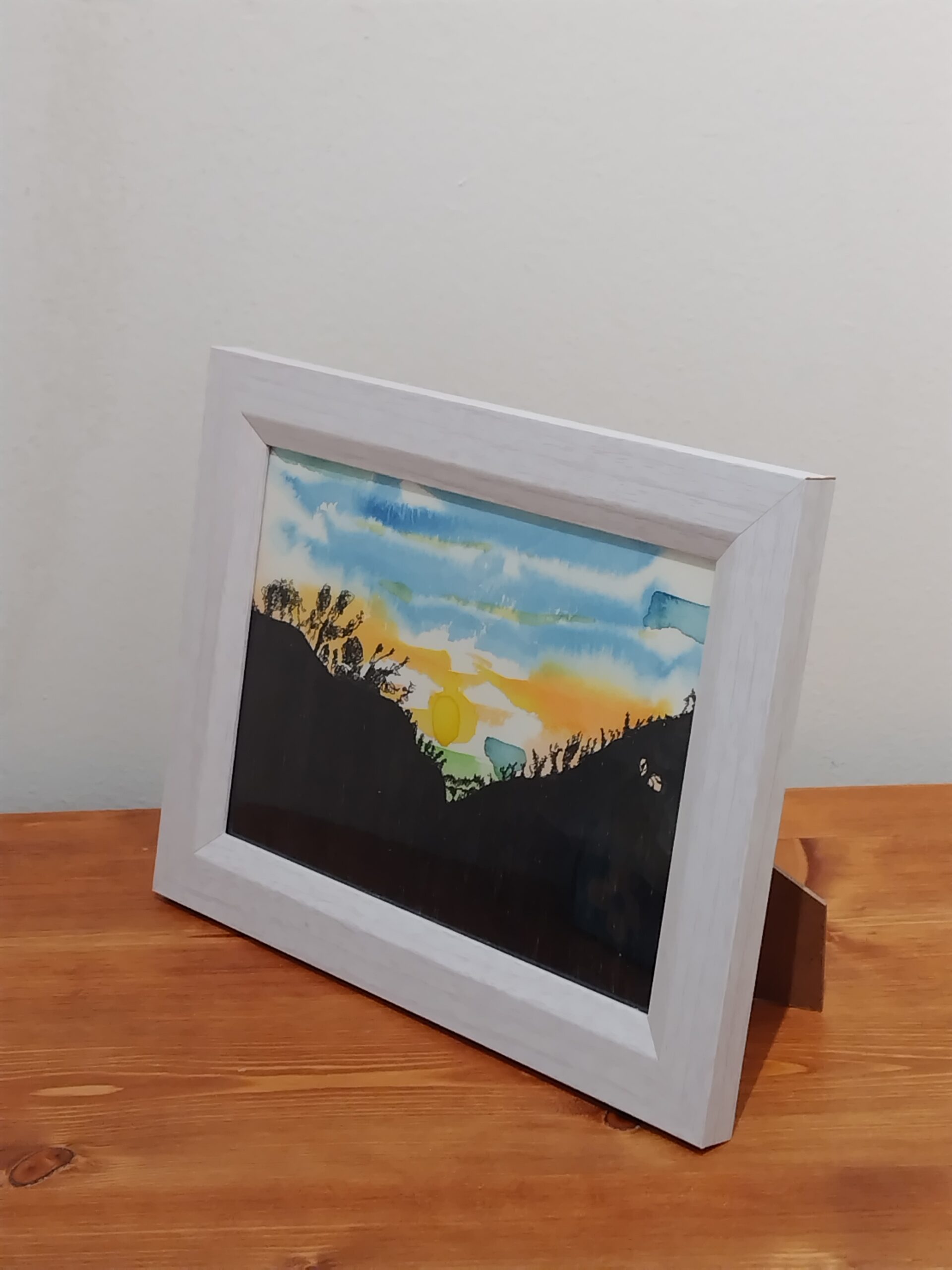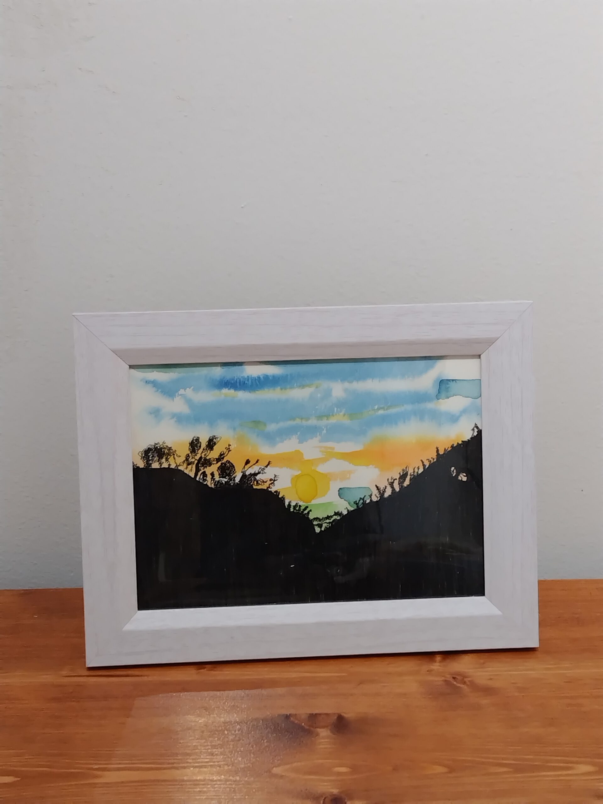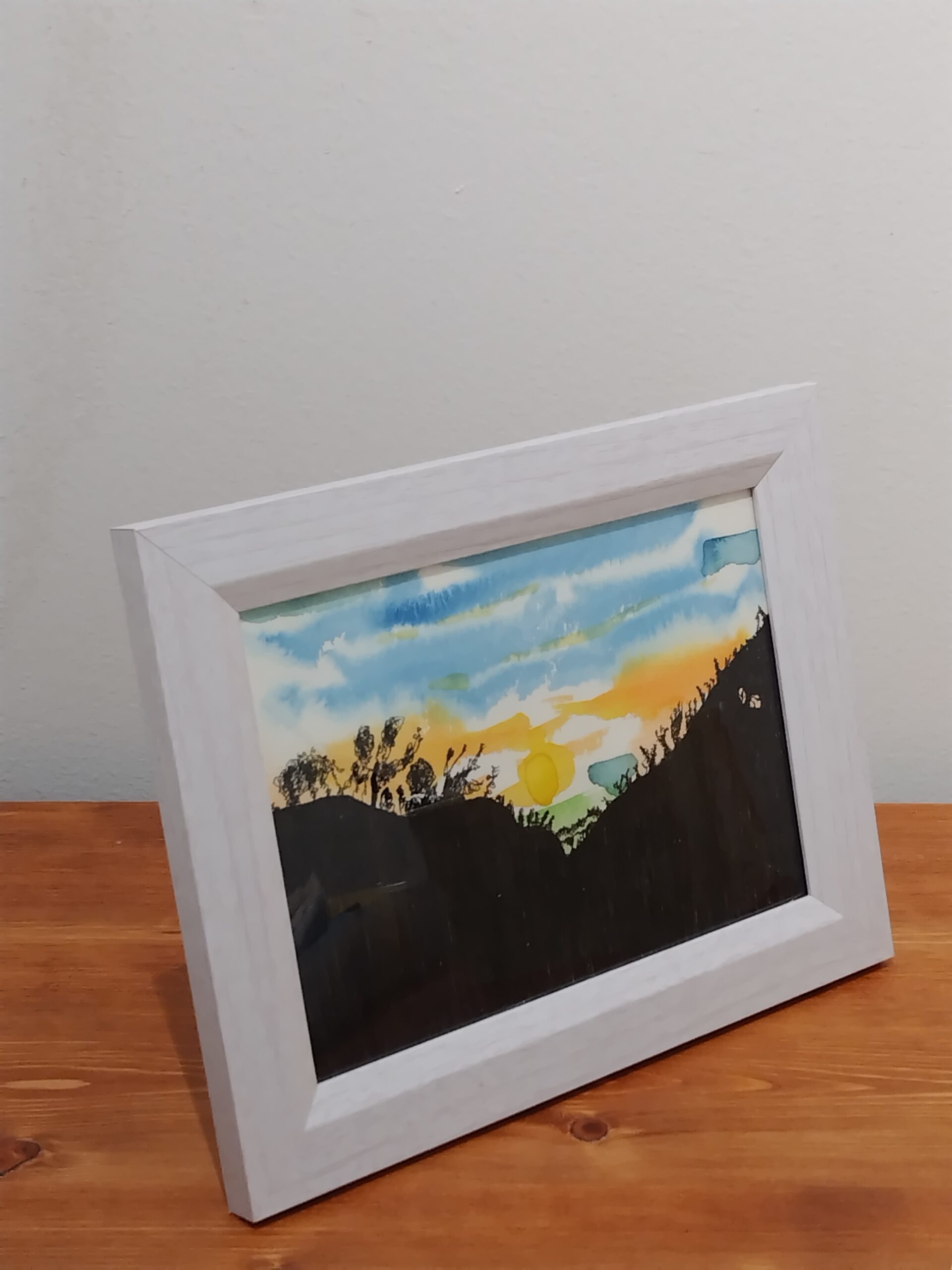 夕陽の中に山のシルエットが浮かび上がる様子を描きました。お部屋に色味を加えるお手伝いが出来れば嬉しいです。