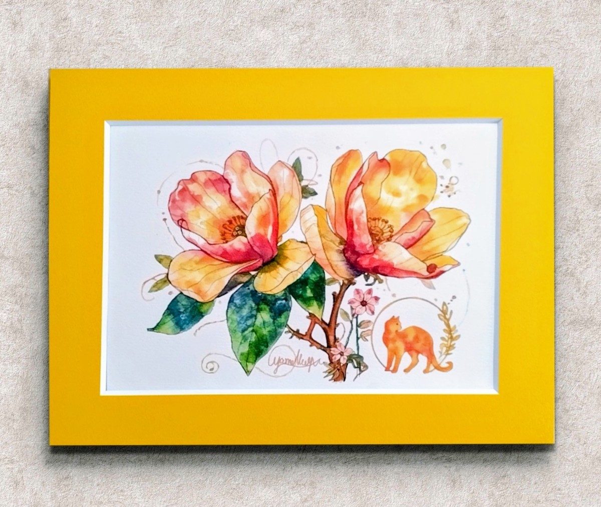 イエローからオレンジへと続く暖かなグラデーションを主軸に、インディアインクの繊細なラインで花の生命力を縁取っています。