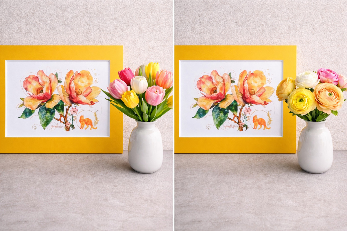 「窓から差し込む柔らかな午後の光。その中で黄金色に輝く花々と、静かに寄り添う猫の姿を描いた物語性豊かな一作です」