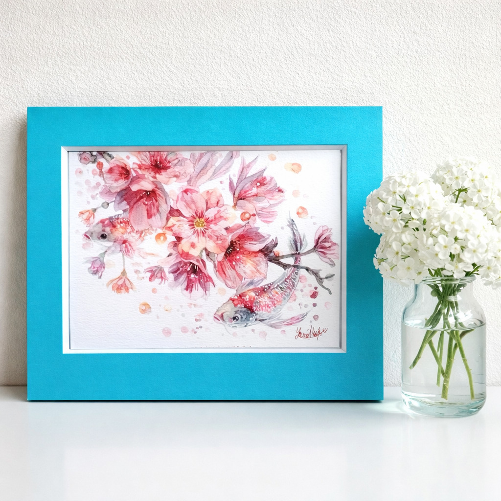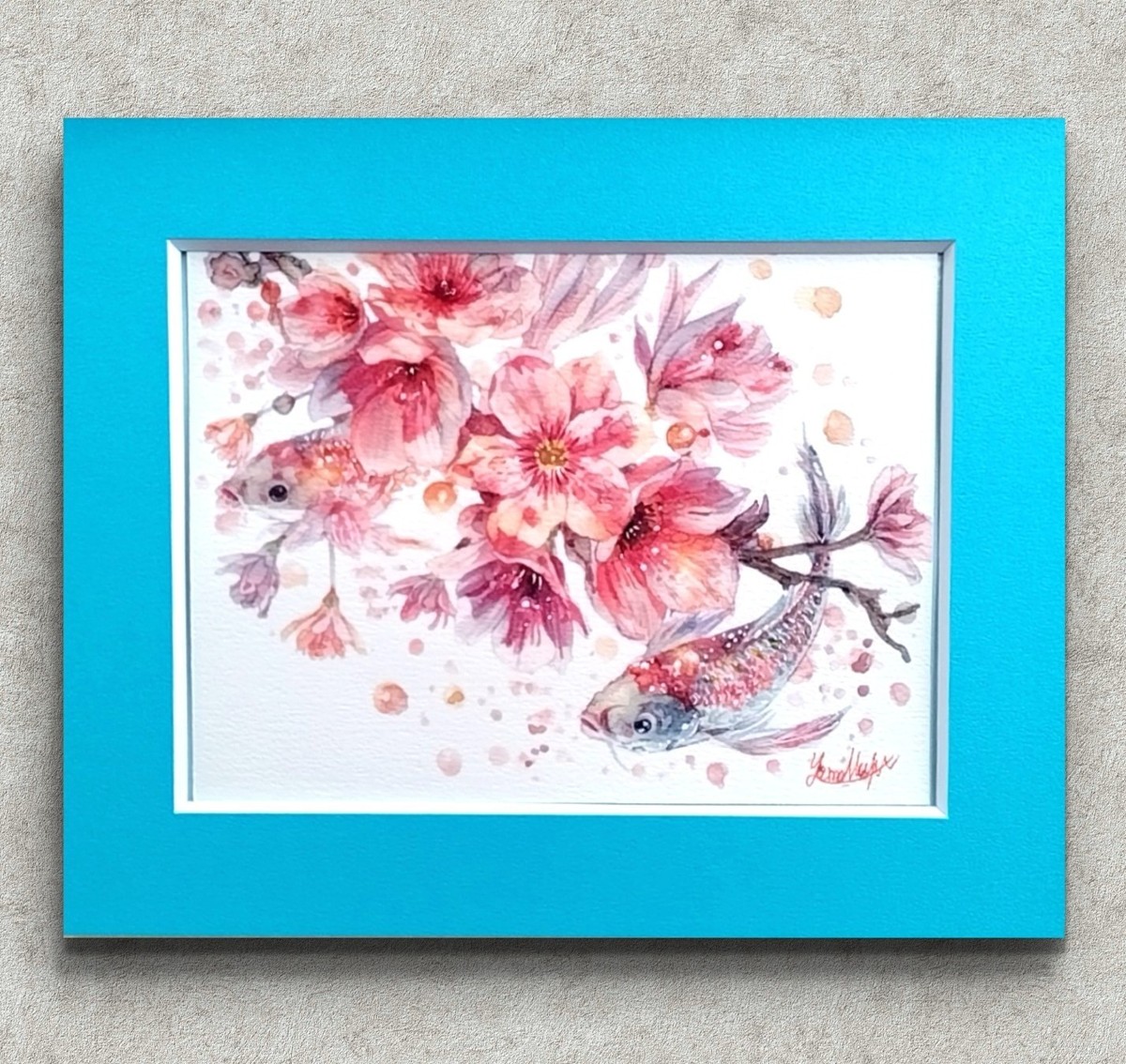 「春の陽光に溶け出すような桜の花びらと、その下を優雅に泳ぐ魚たちの姿を描きました。」