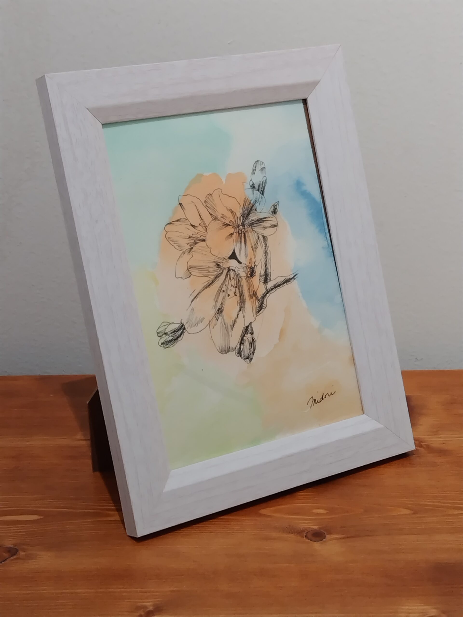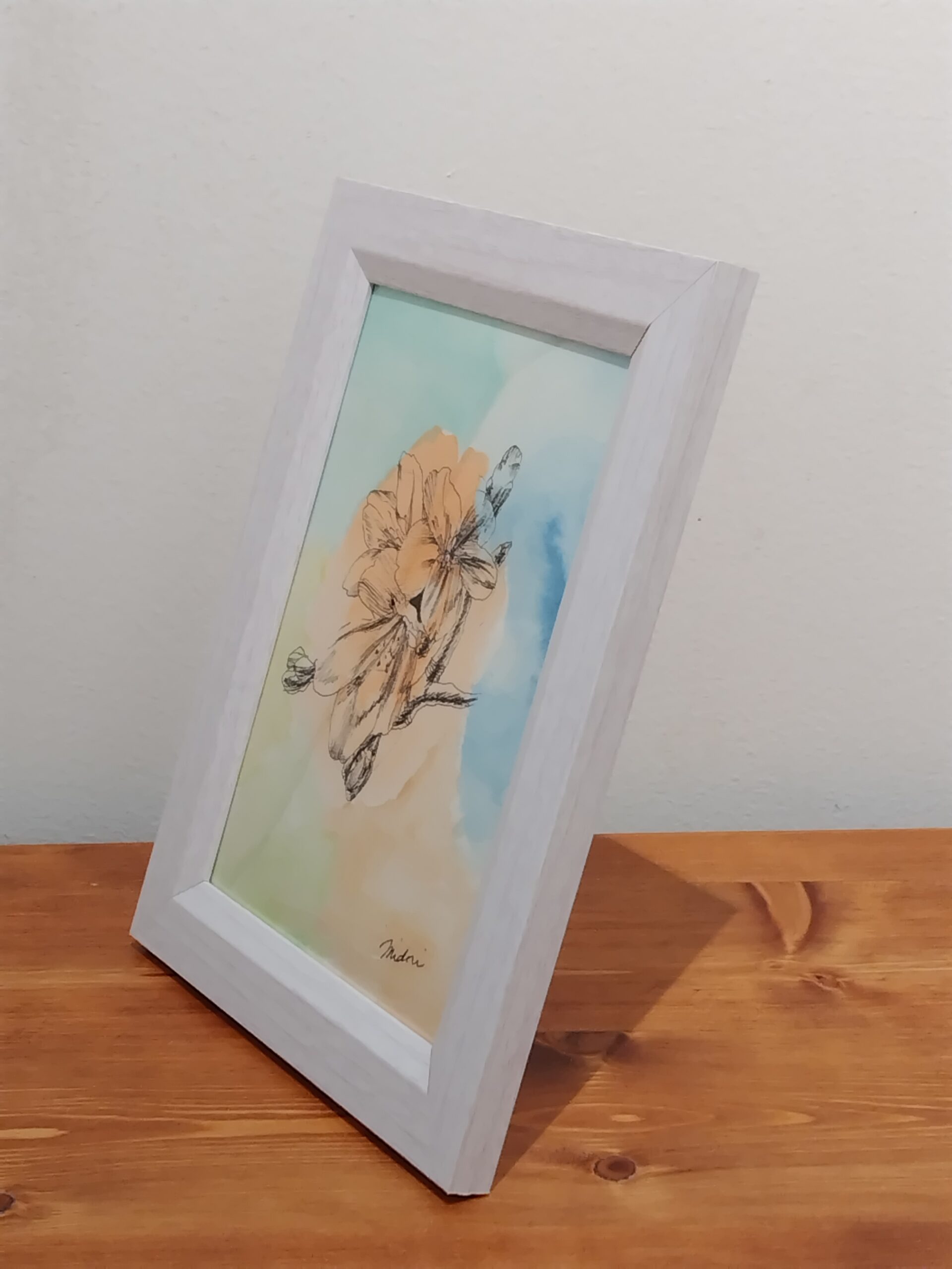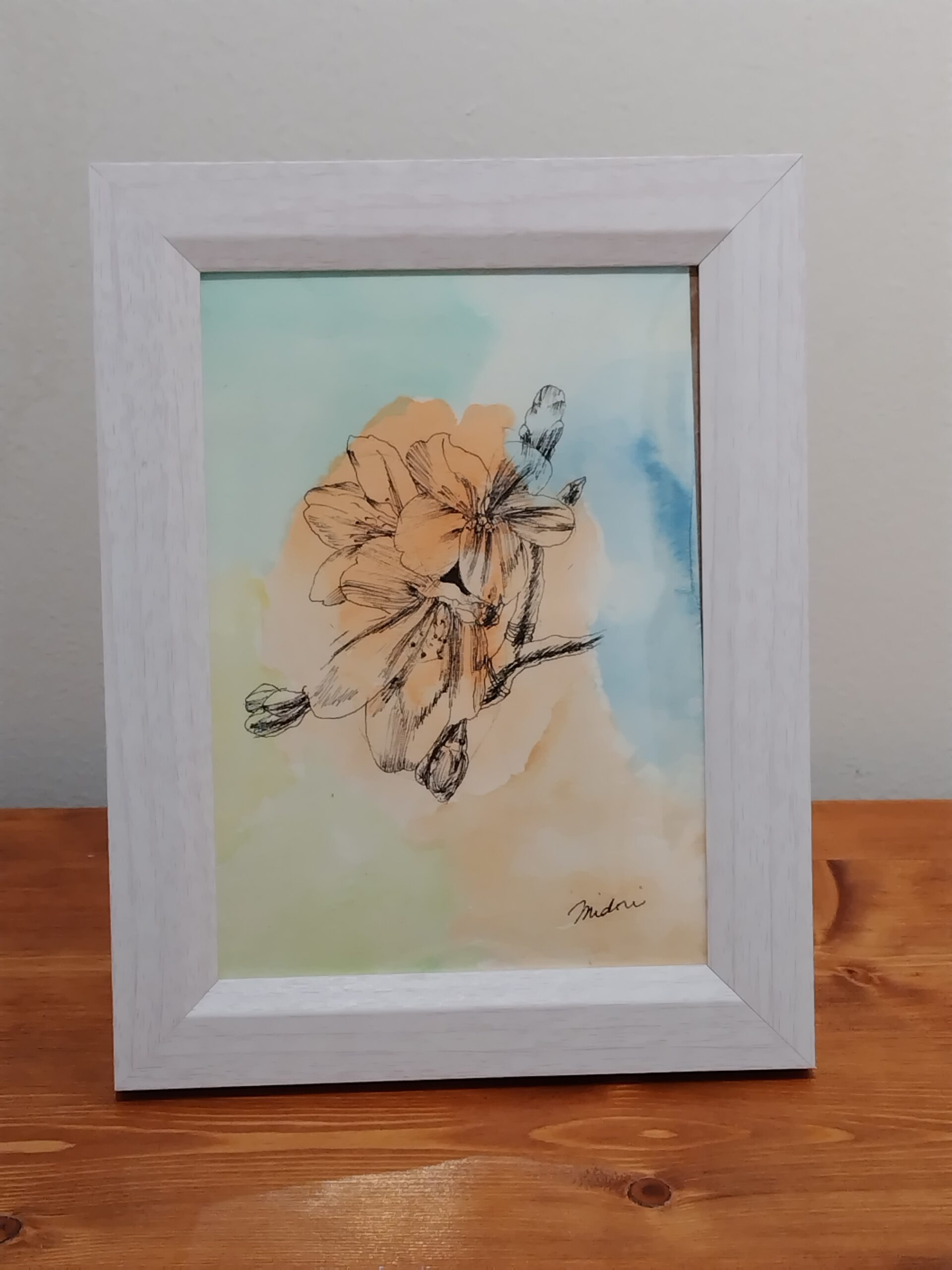 鮮やかな水彩の上に黒色のペンで桜の花を描きました。水彩の鮮やかさとペンの黒色の対比をお楽しみいただければ嬉しいです。