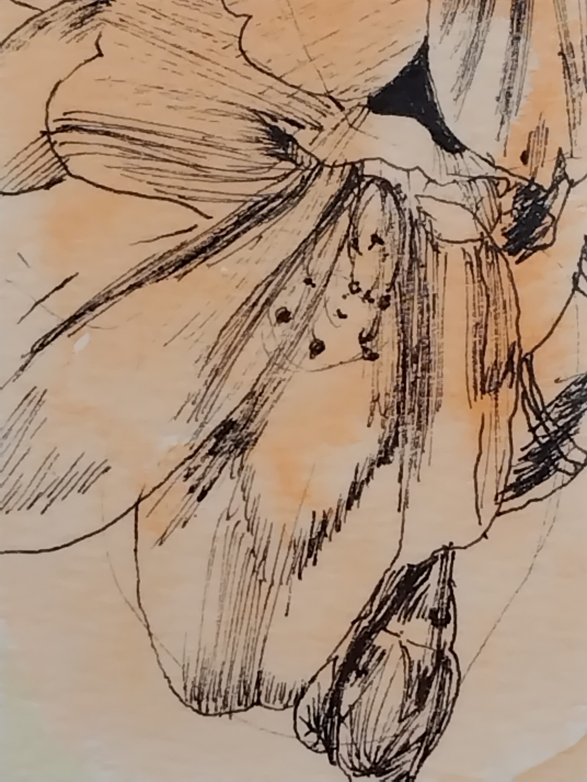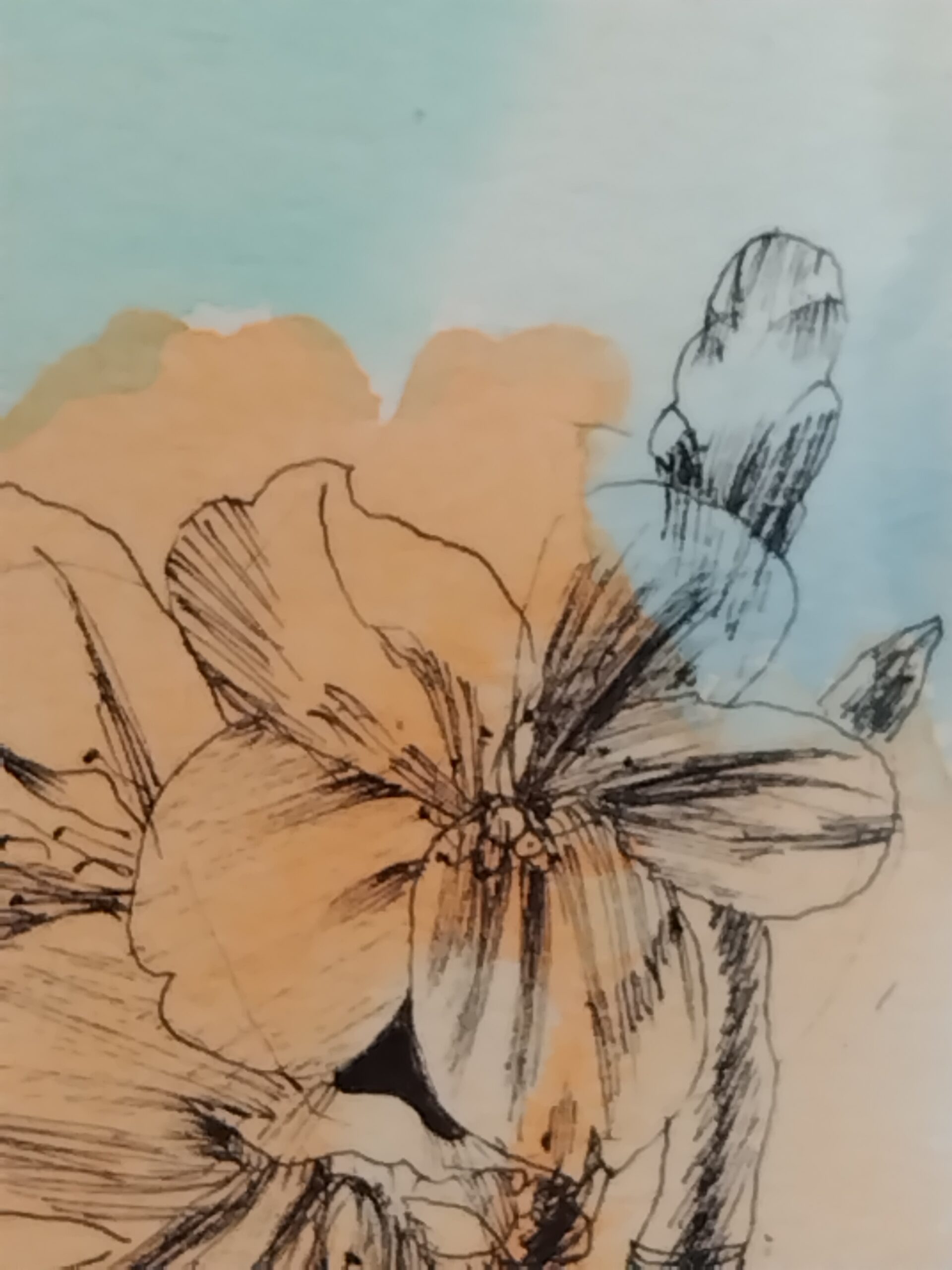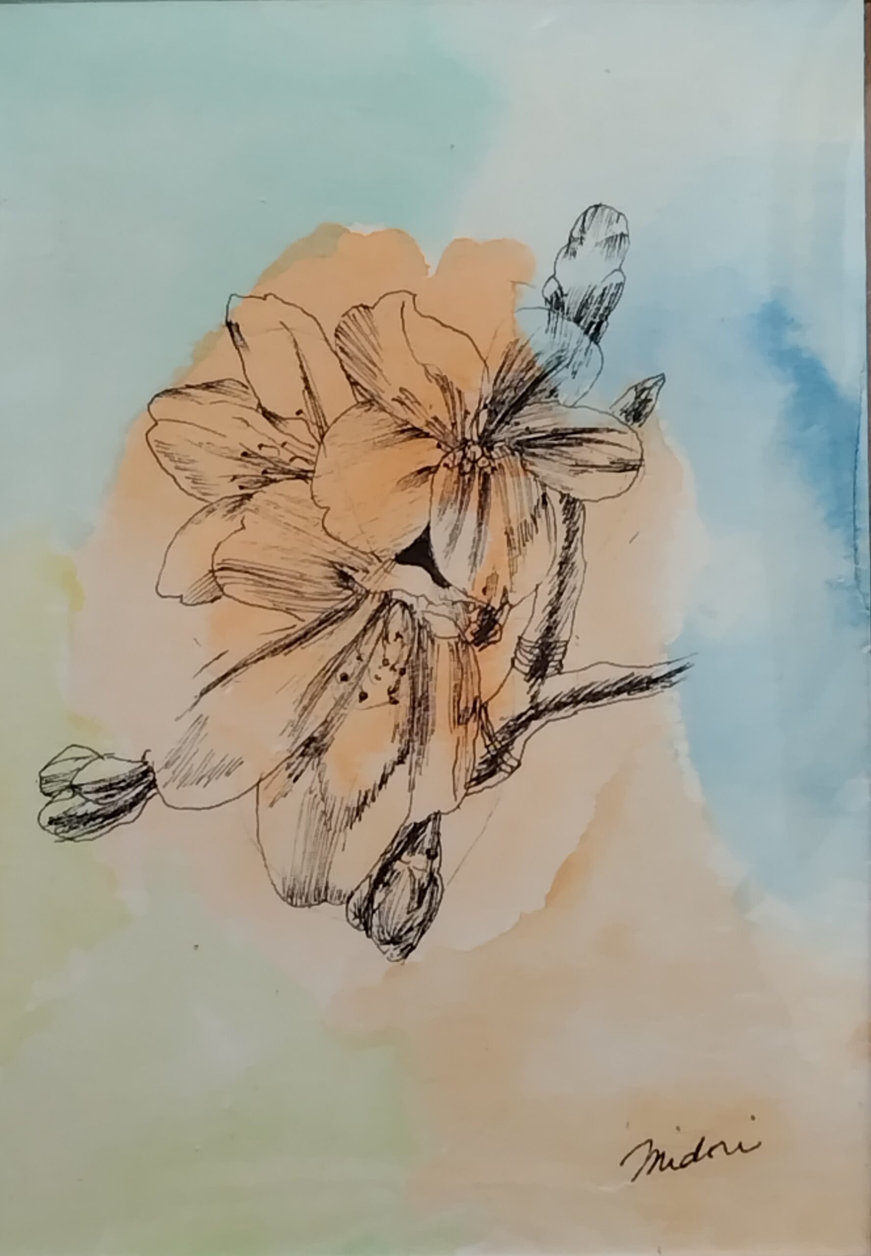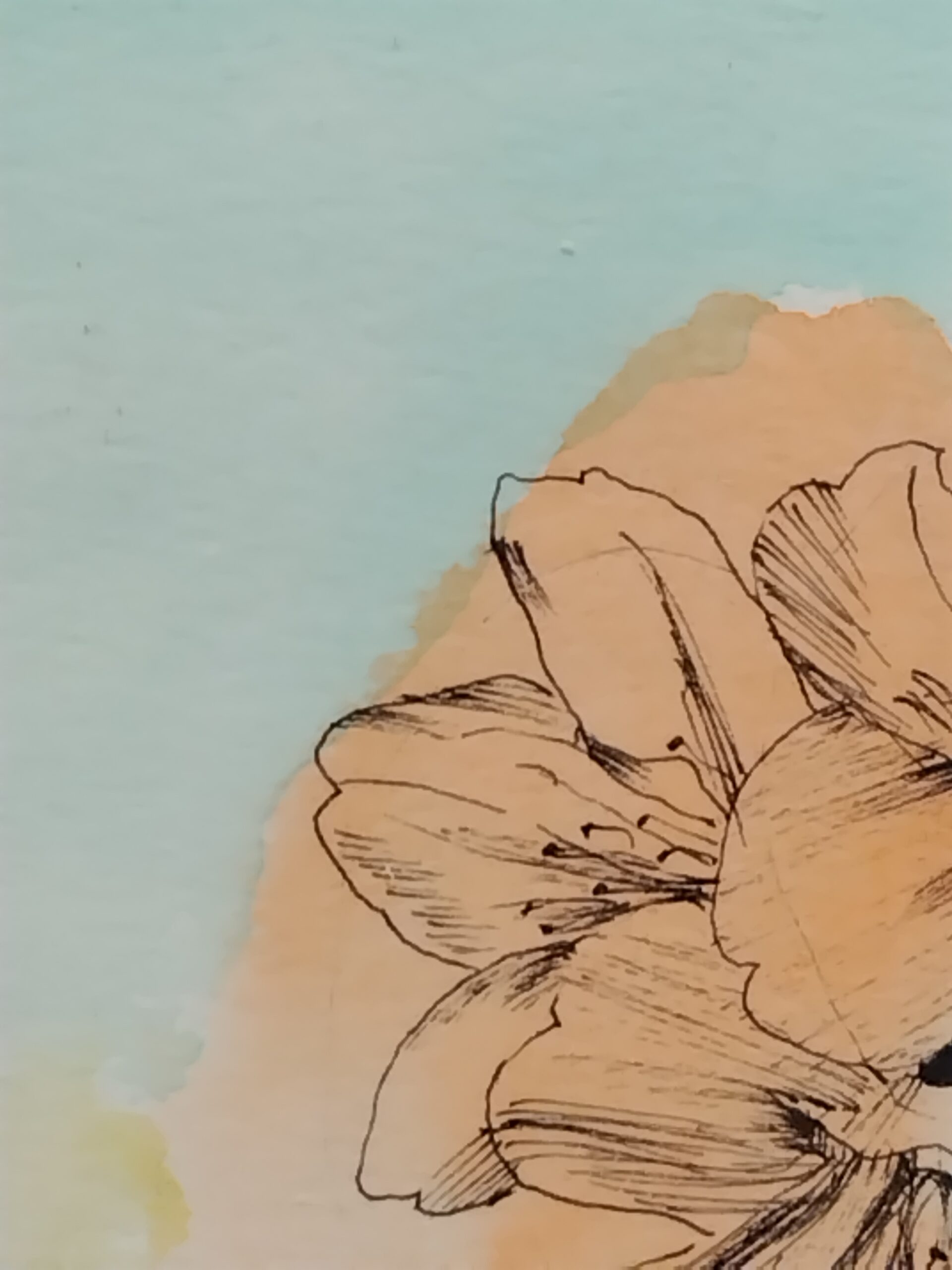 鮮やかな水彩の上に黒色のペンで桜の花を描きました。水彩の鮮やかさとペンの黒色の対比をお楽しみいただければ嬉しいです。
