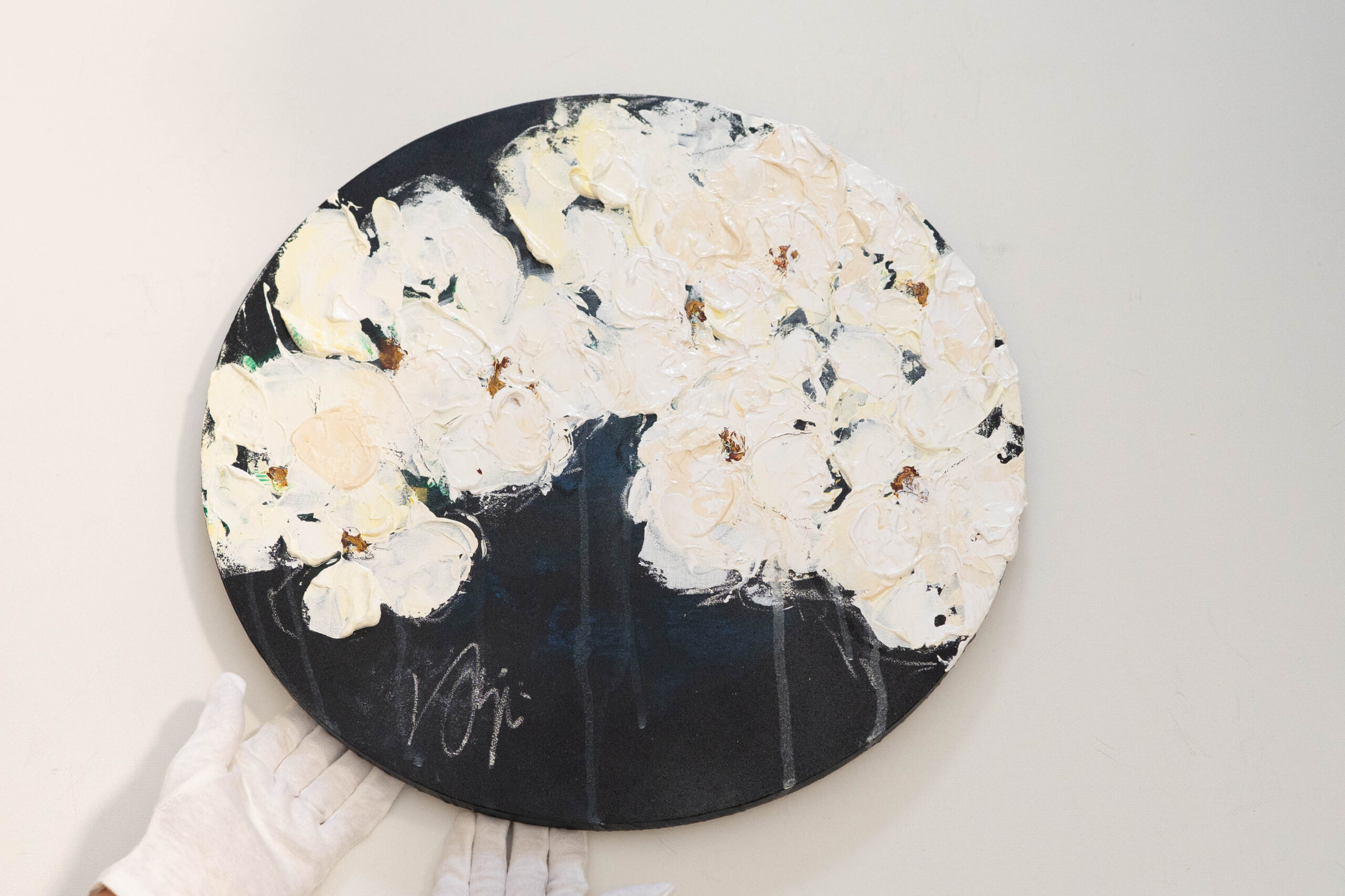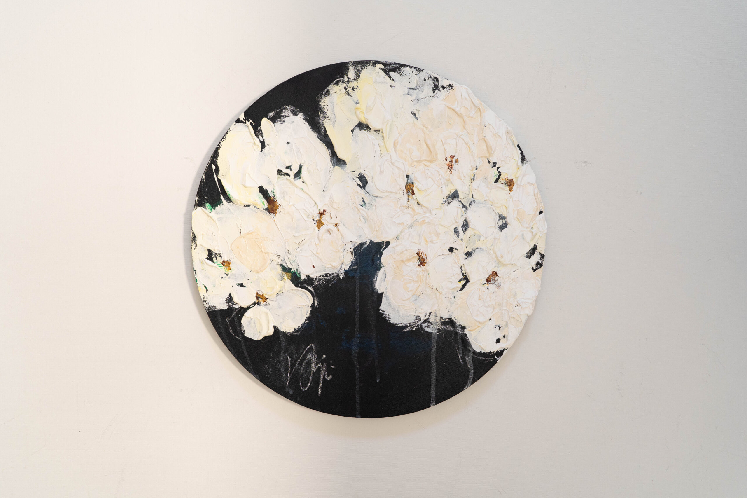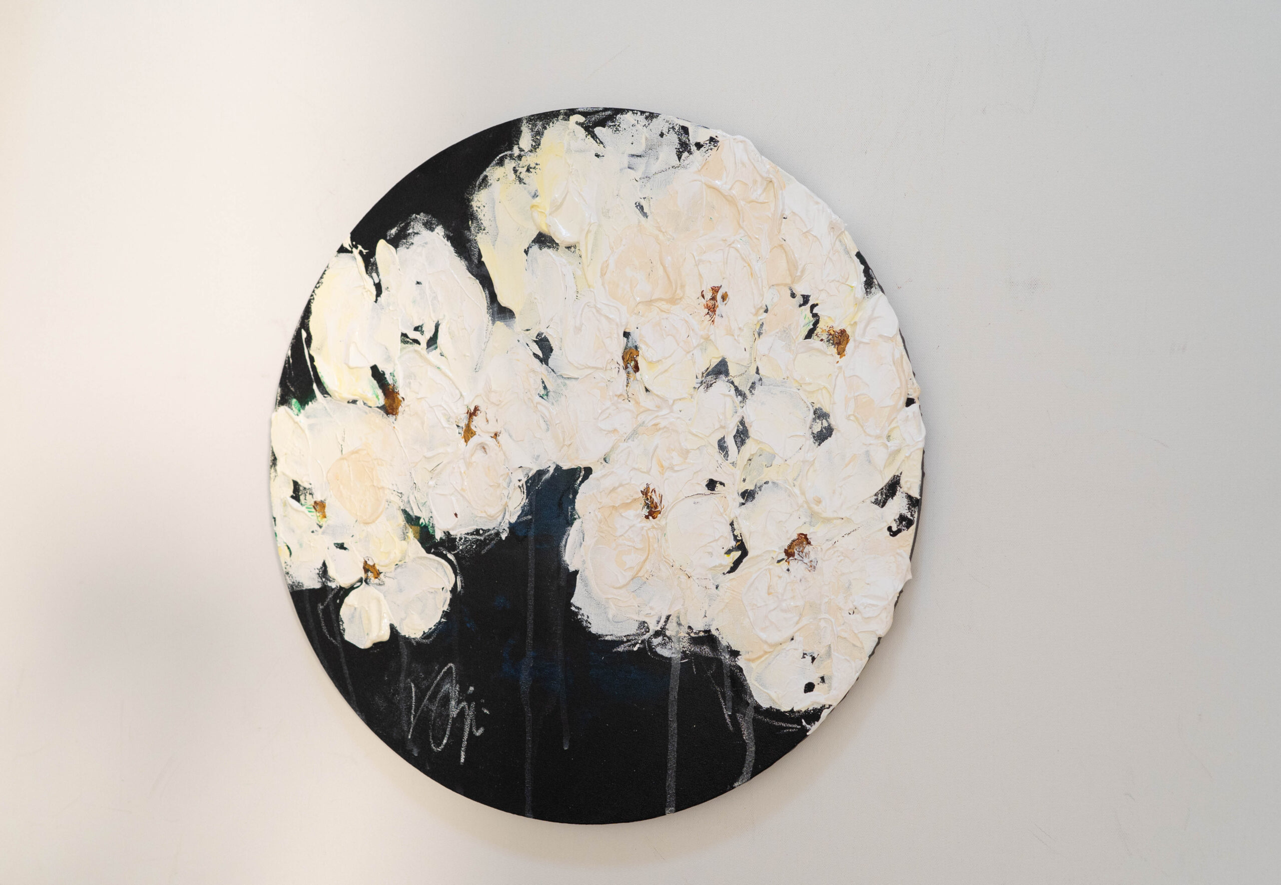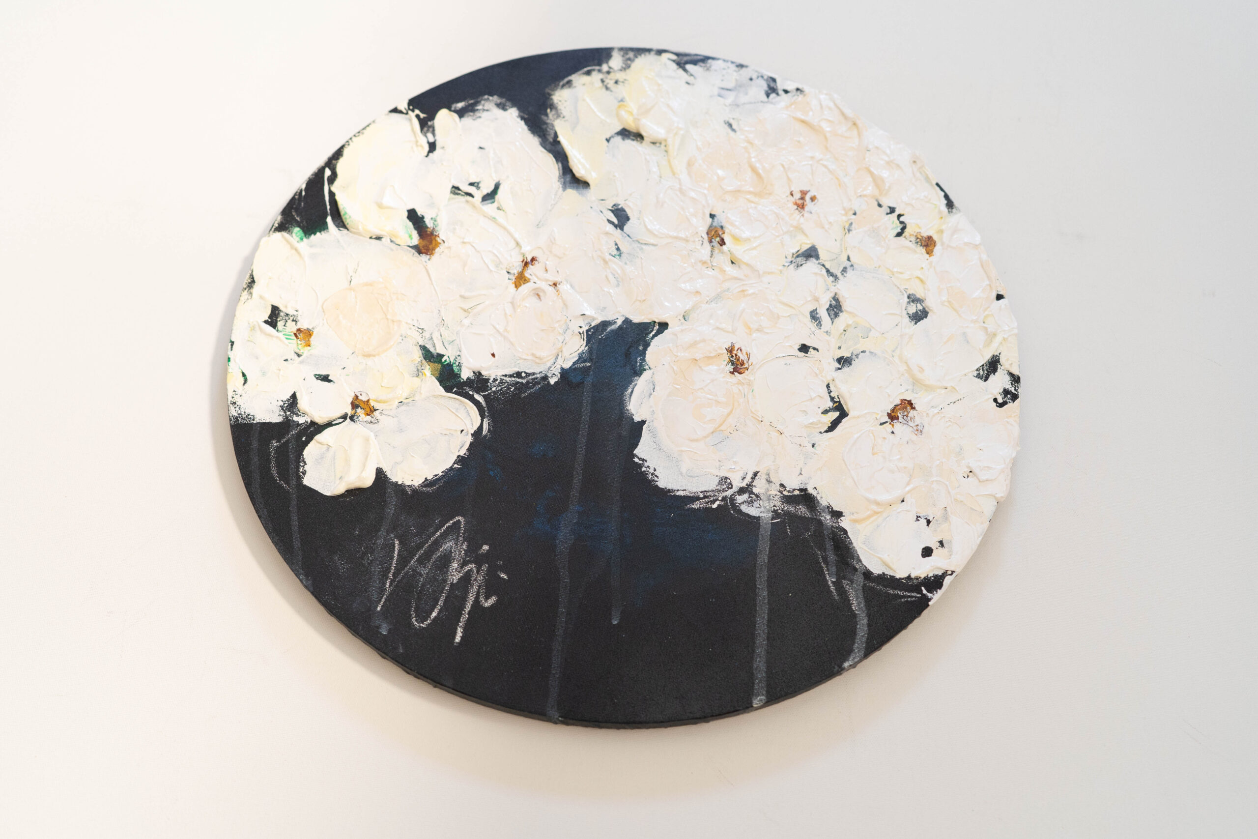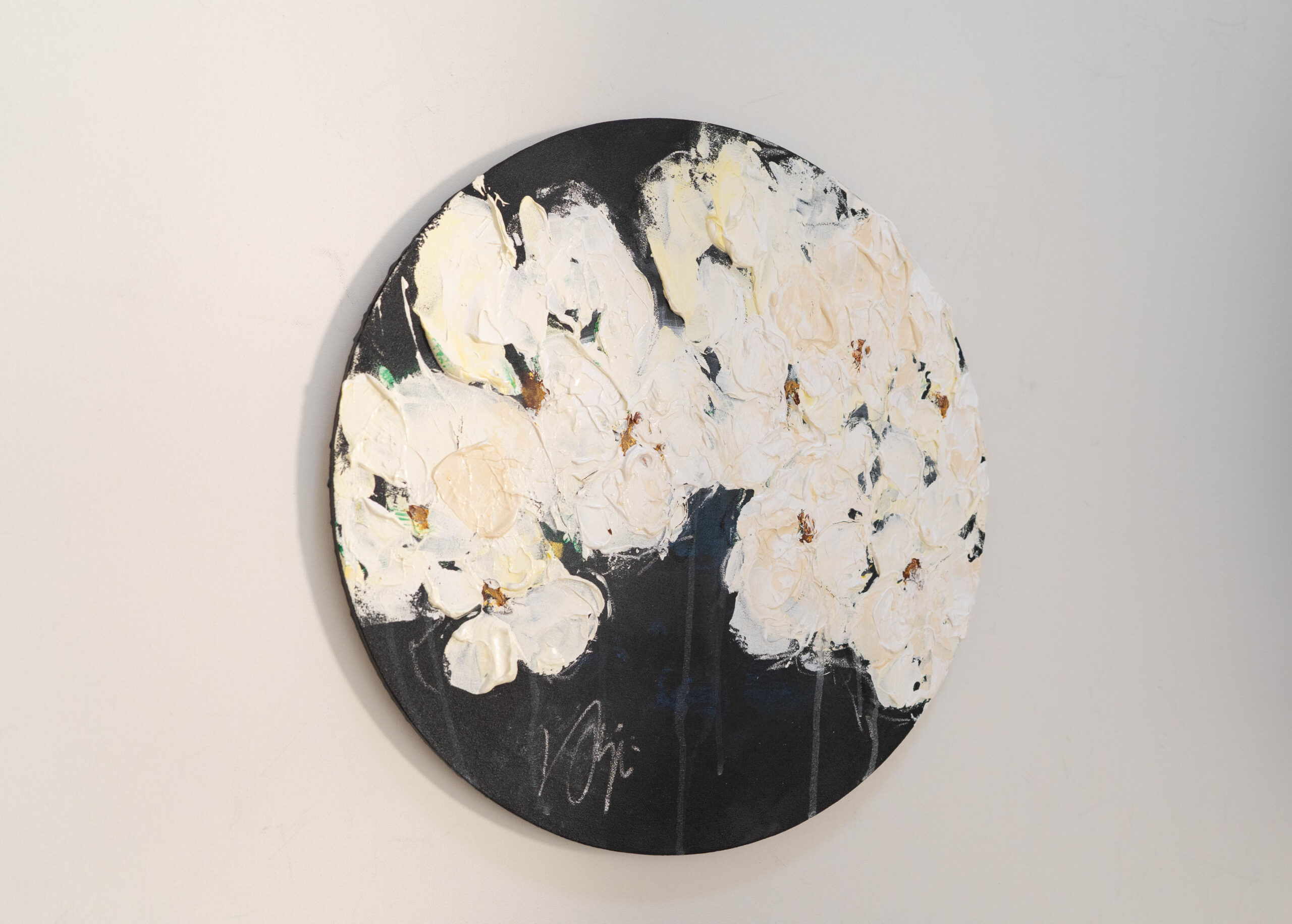 珍しい円形キャンバスに描かれた花の作品。