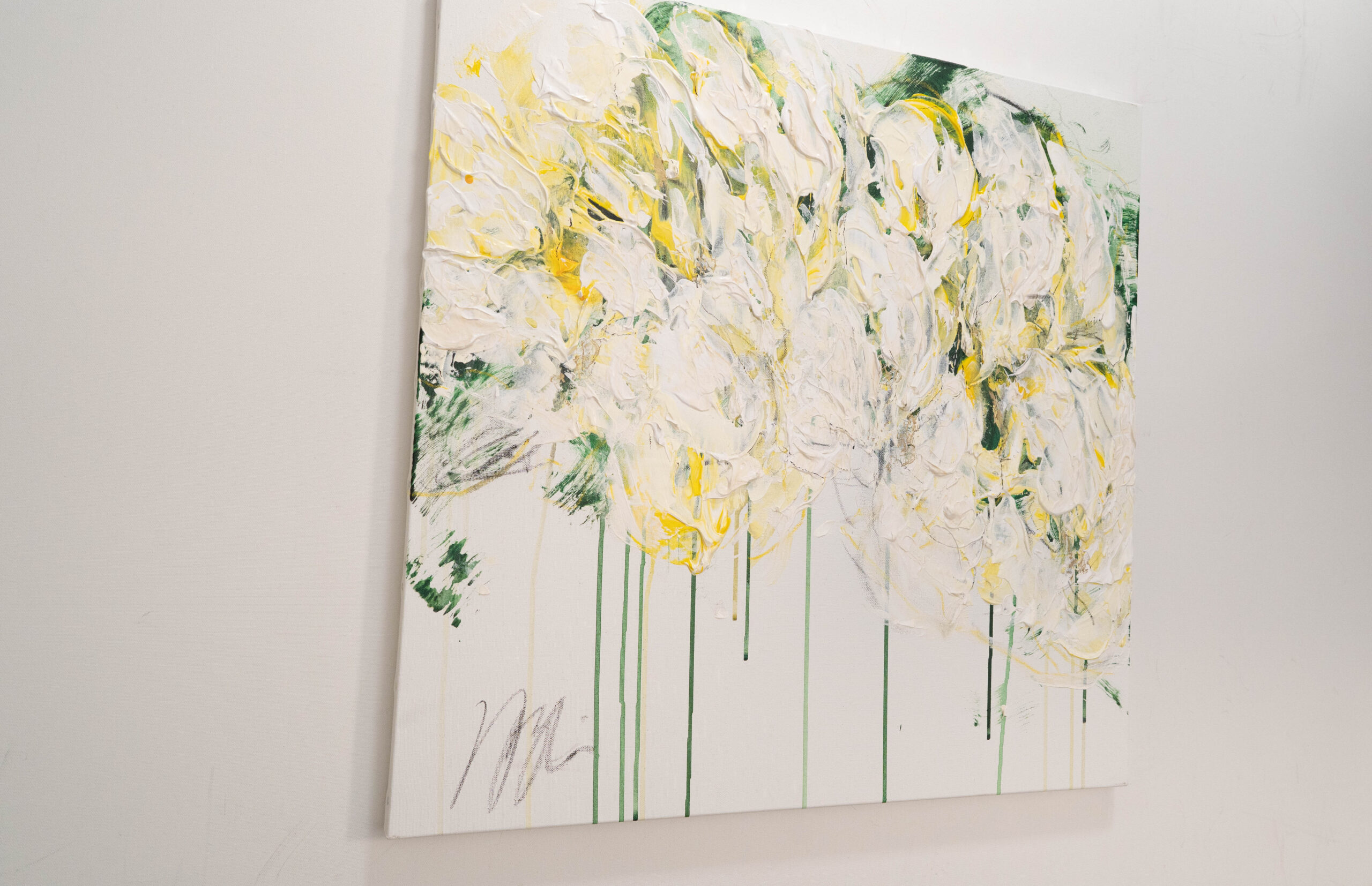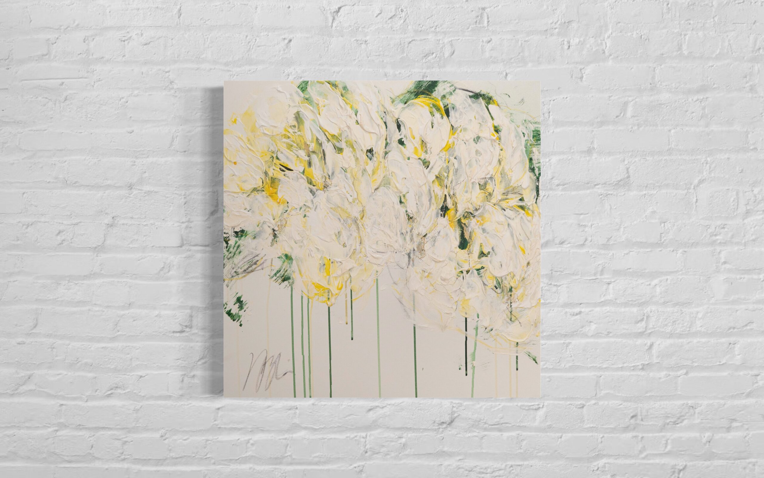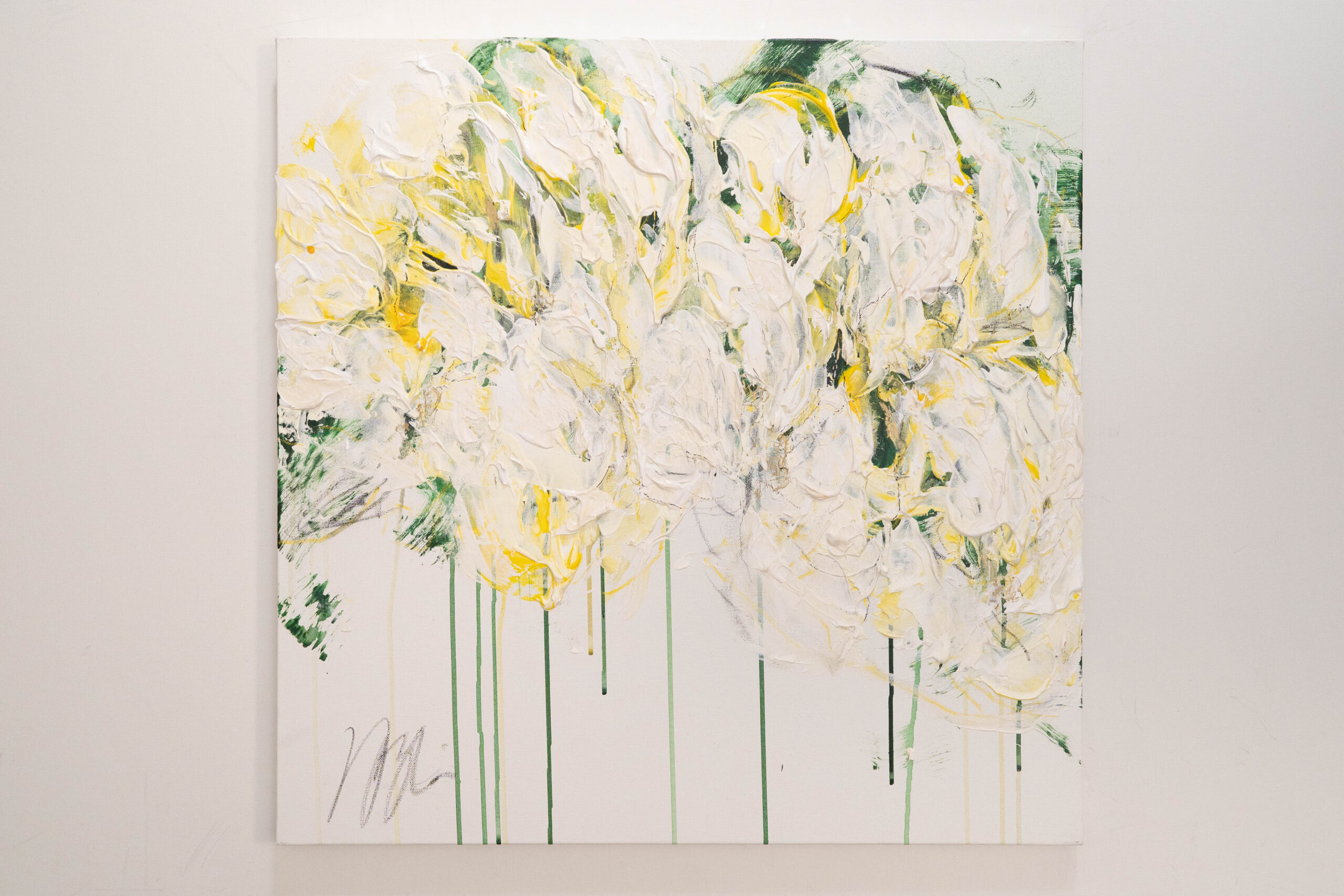 正方形キャンバスに制作された花の作品。