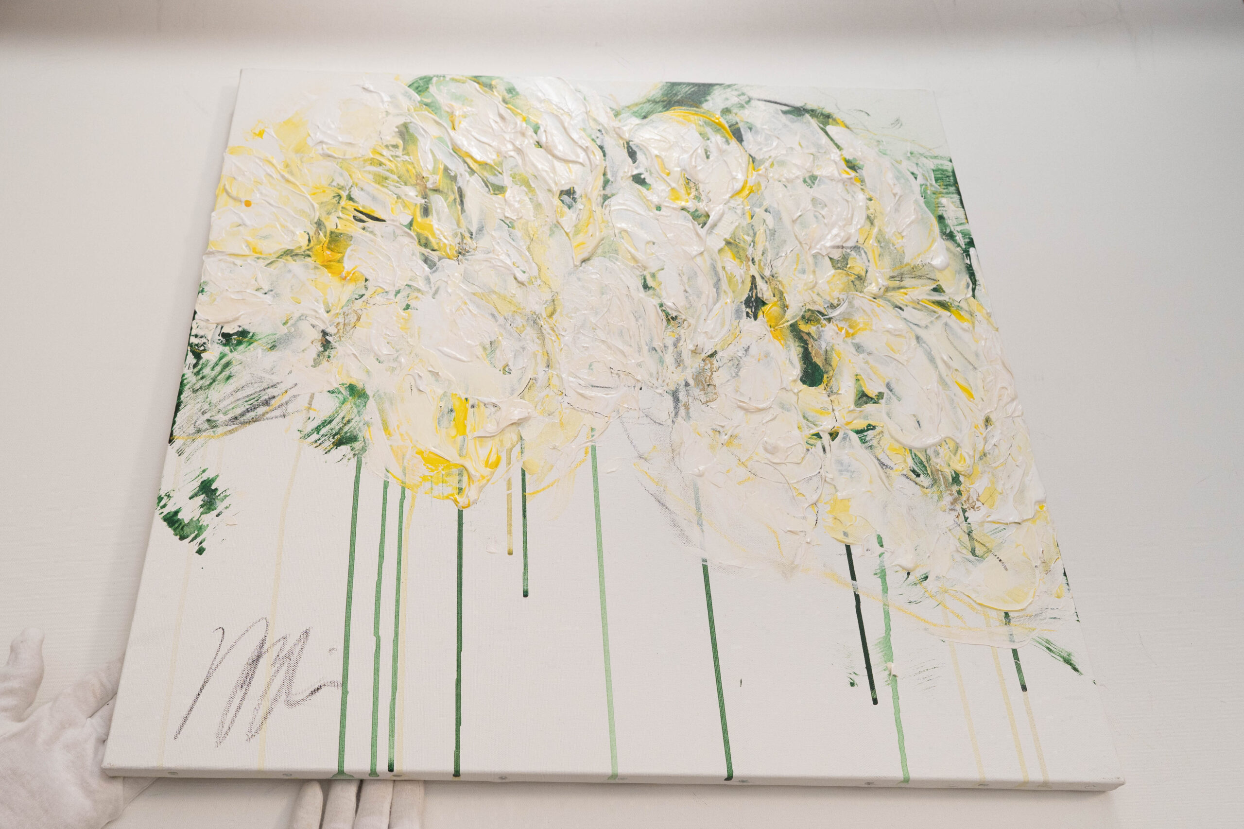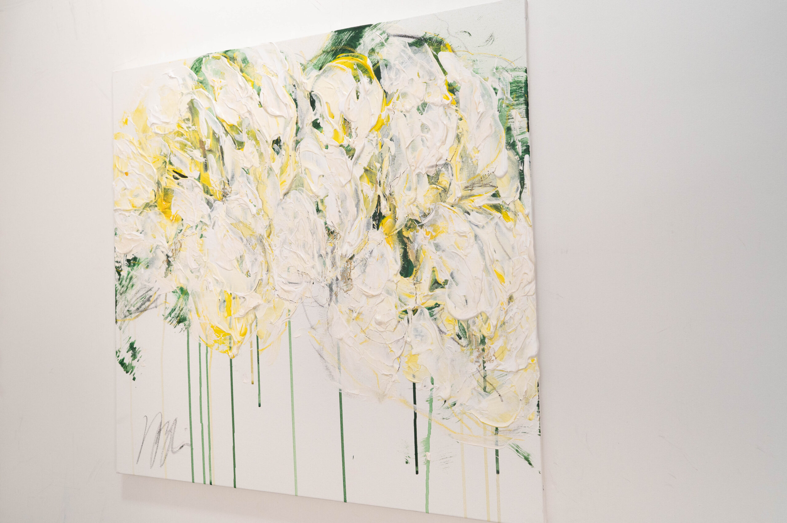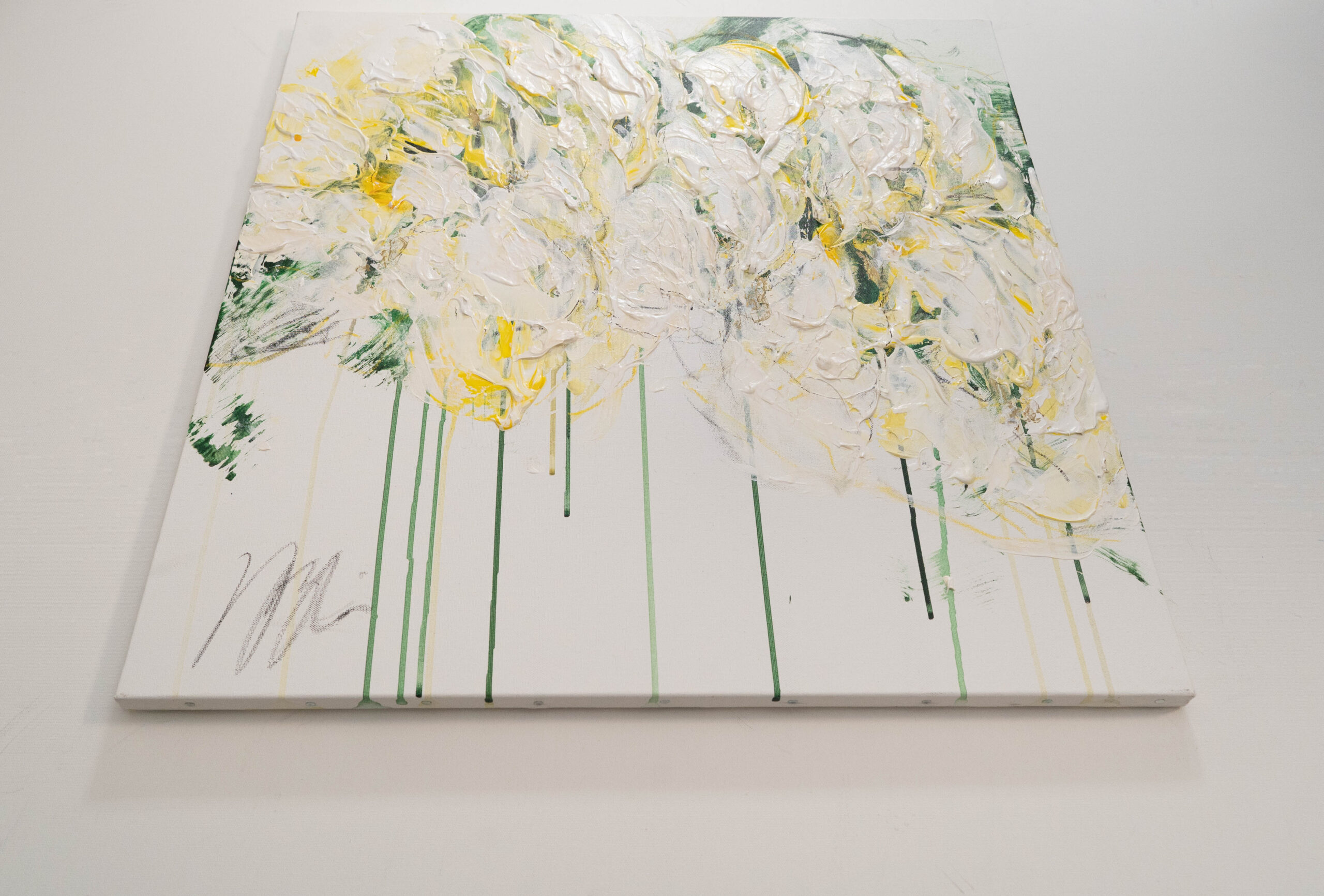 正方形キャンバスに制作された花の作品。