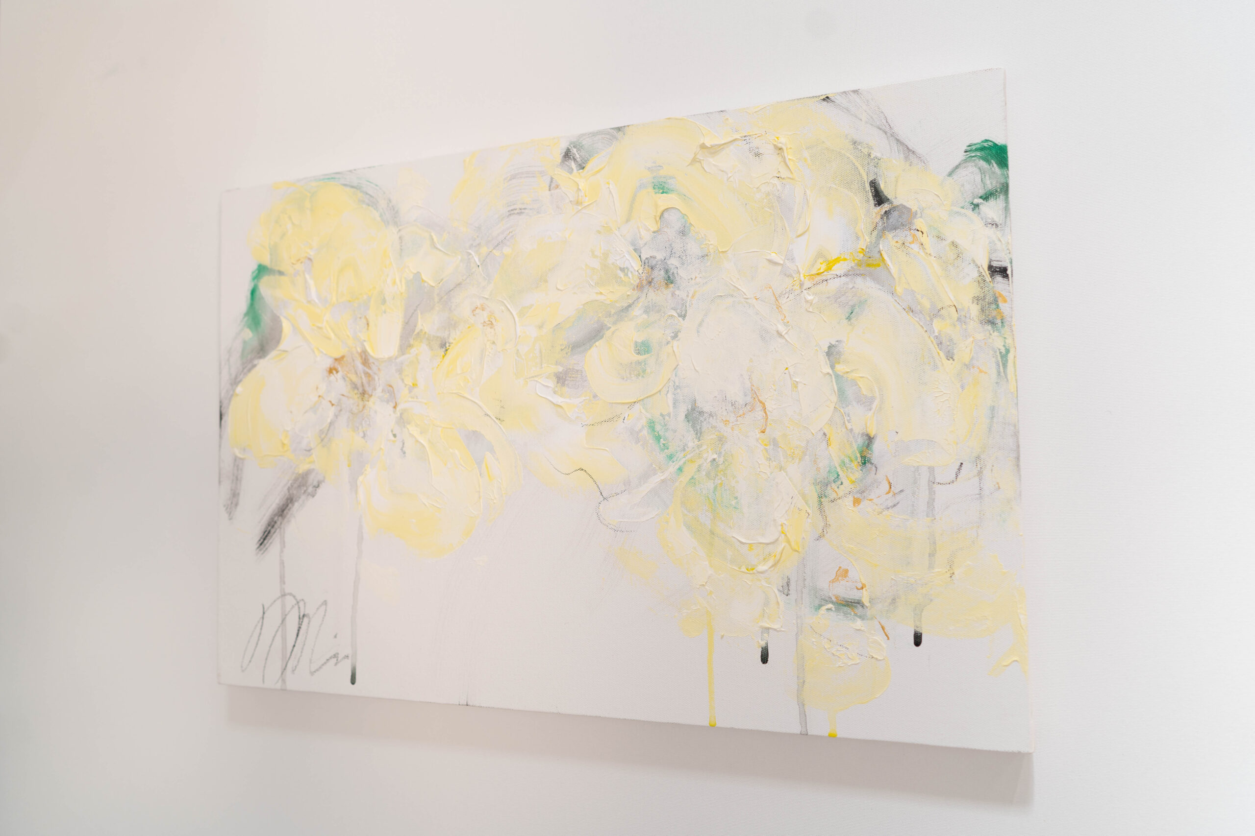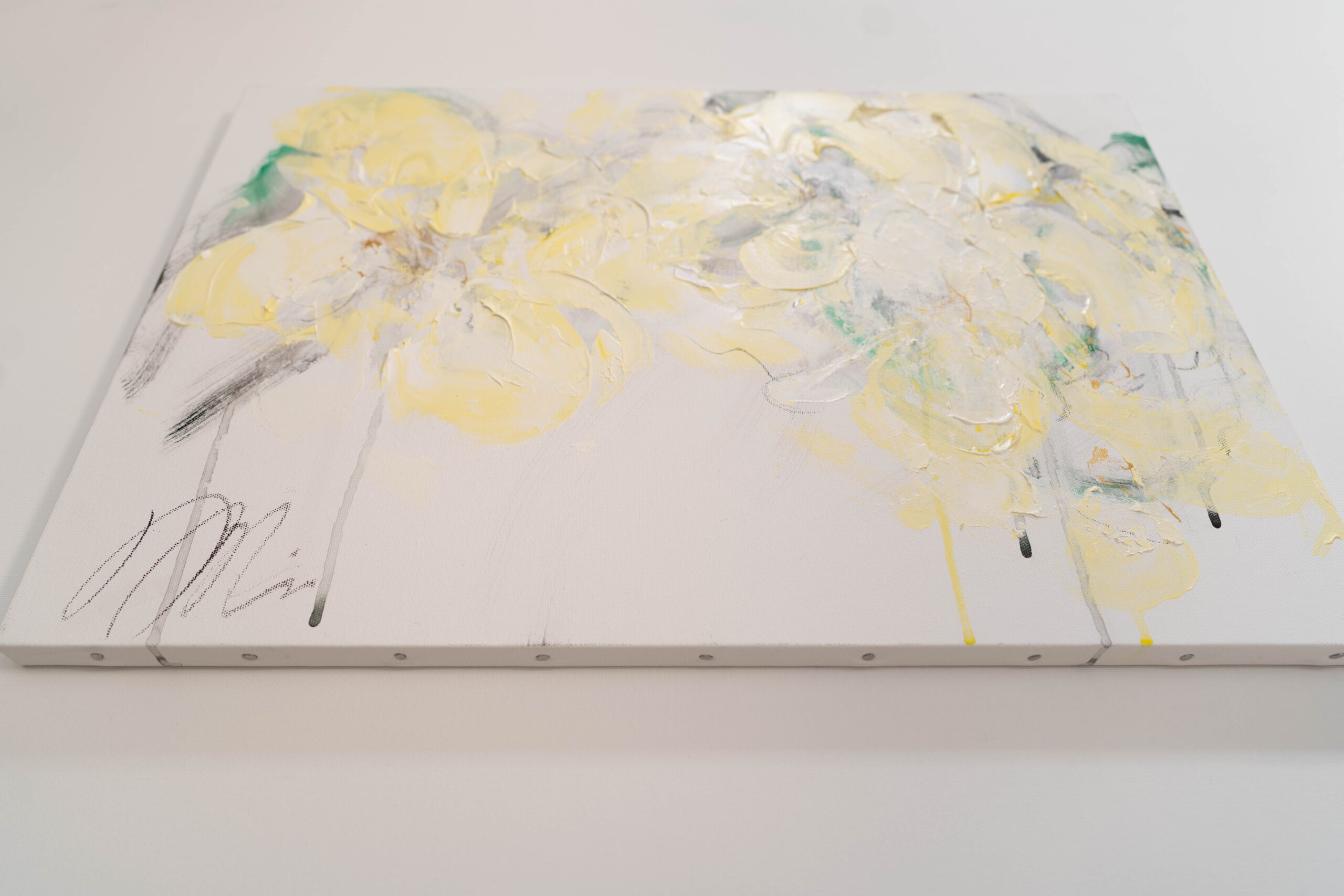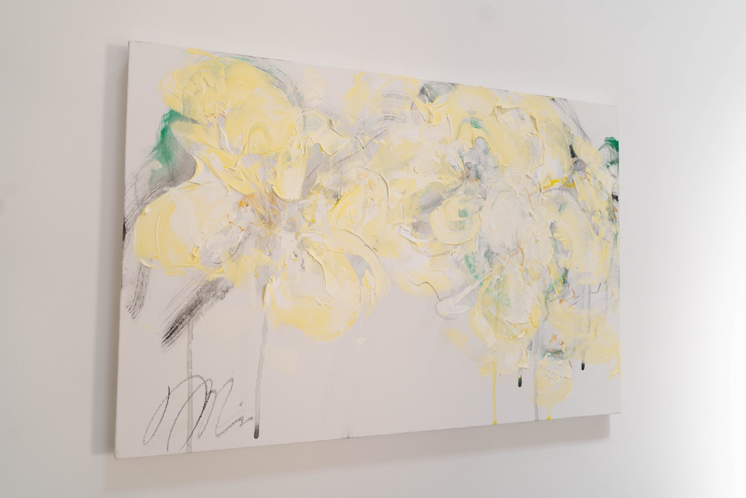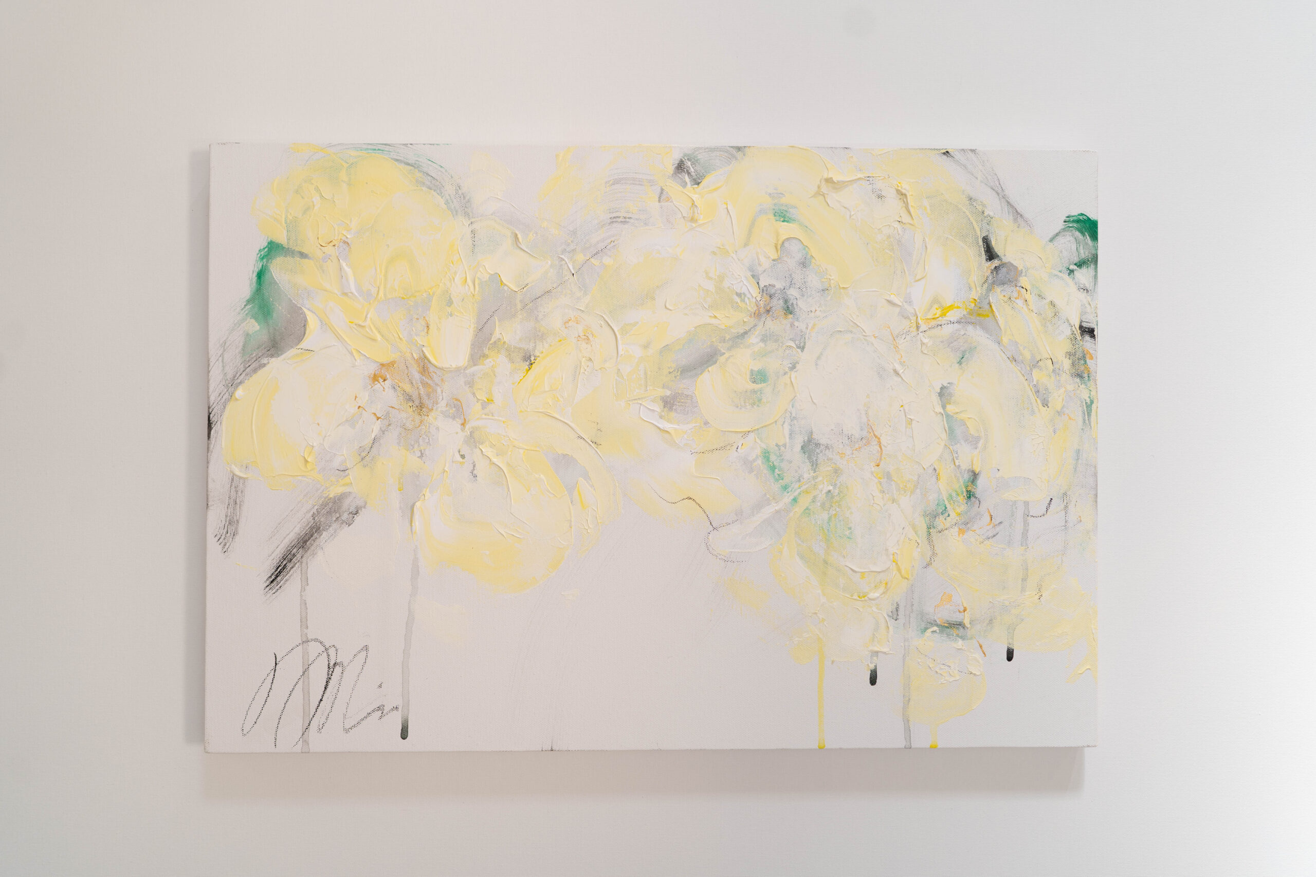 淡い黄色い花を抽象的に美しく描いた作品。シンプルに黄色を重ねたレイヤーがとても存在感があり素敵に飾って頂けます。