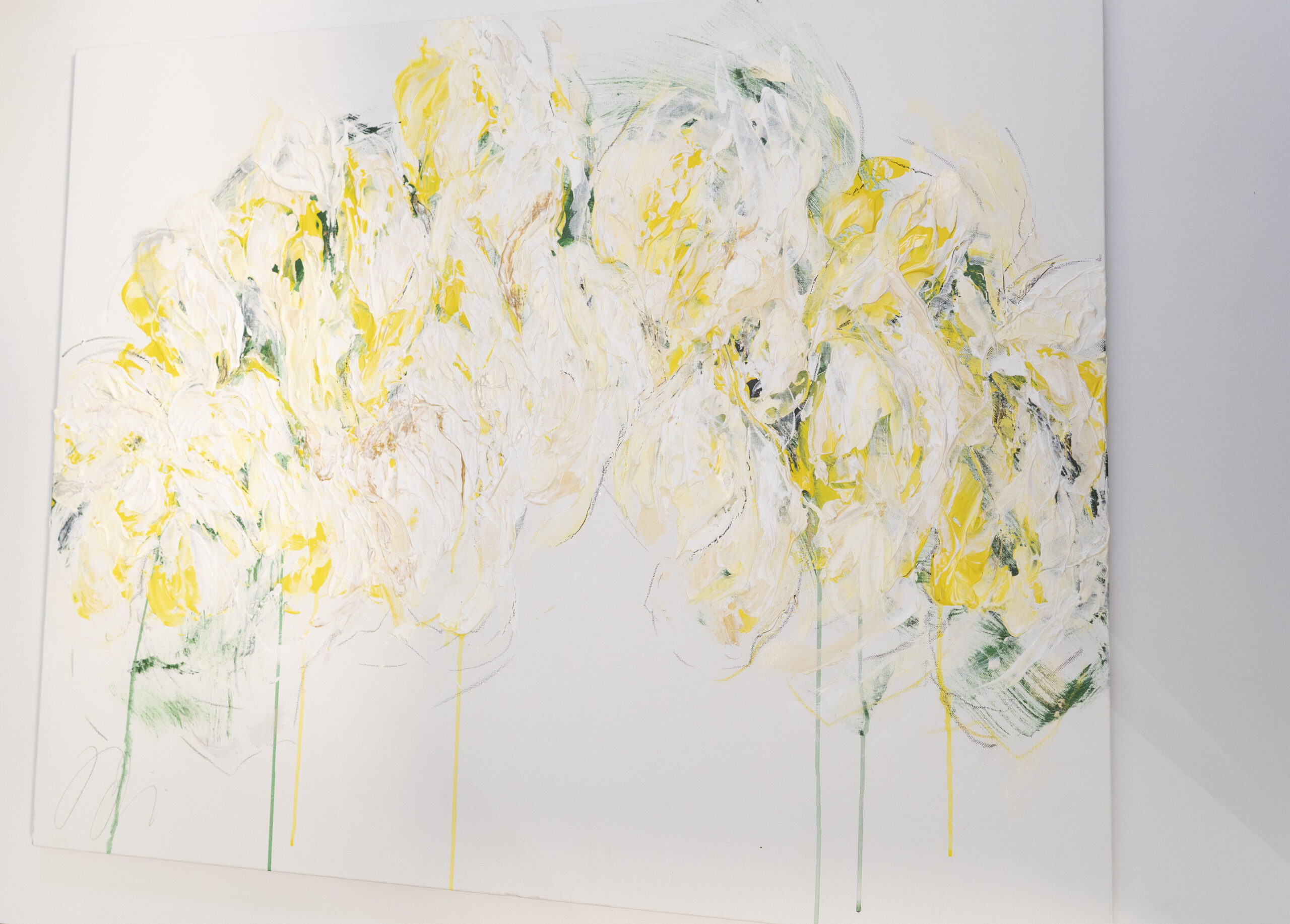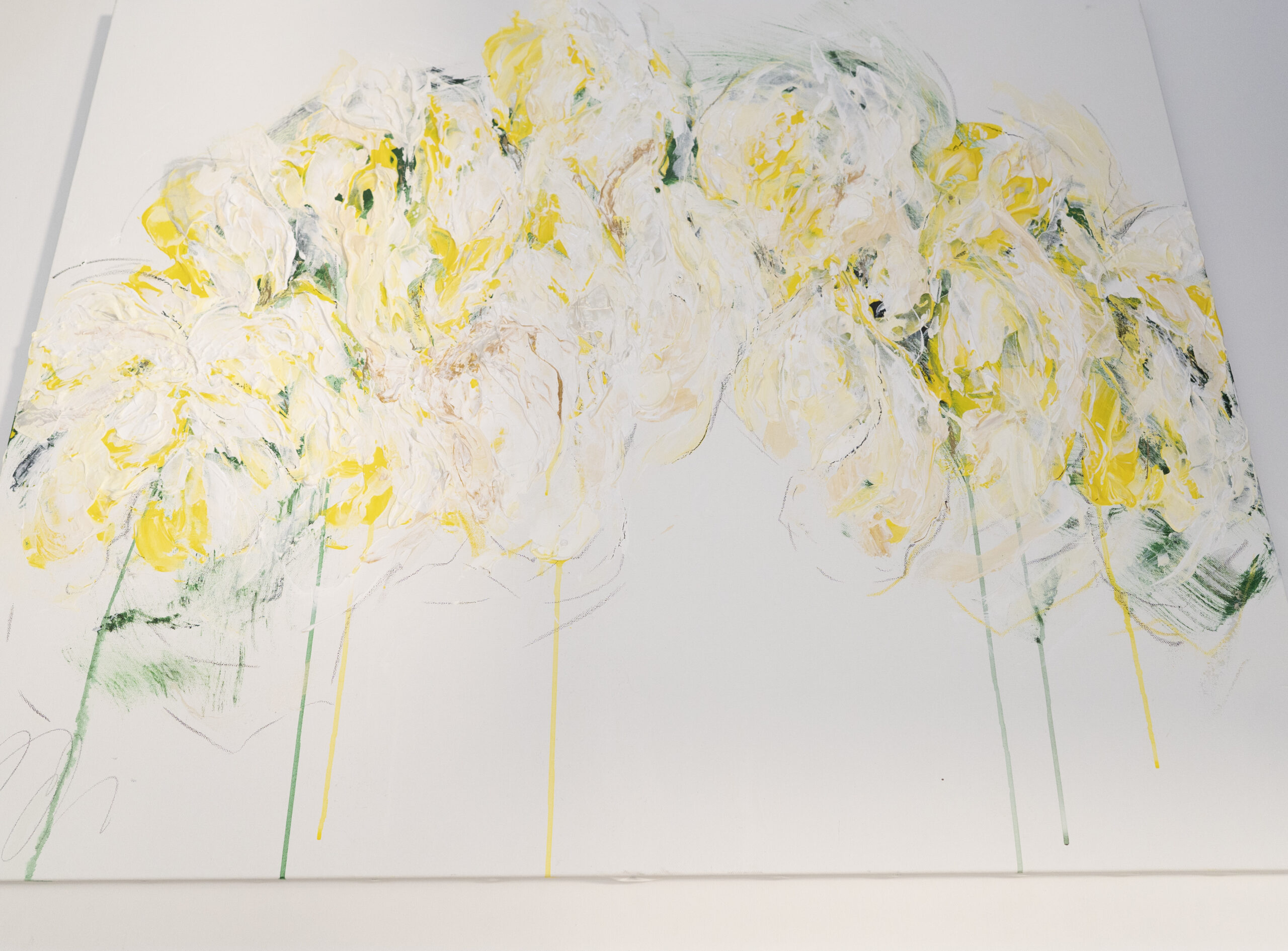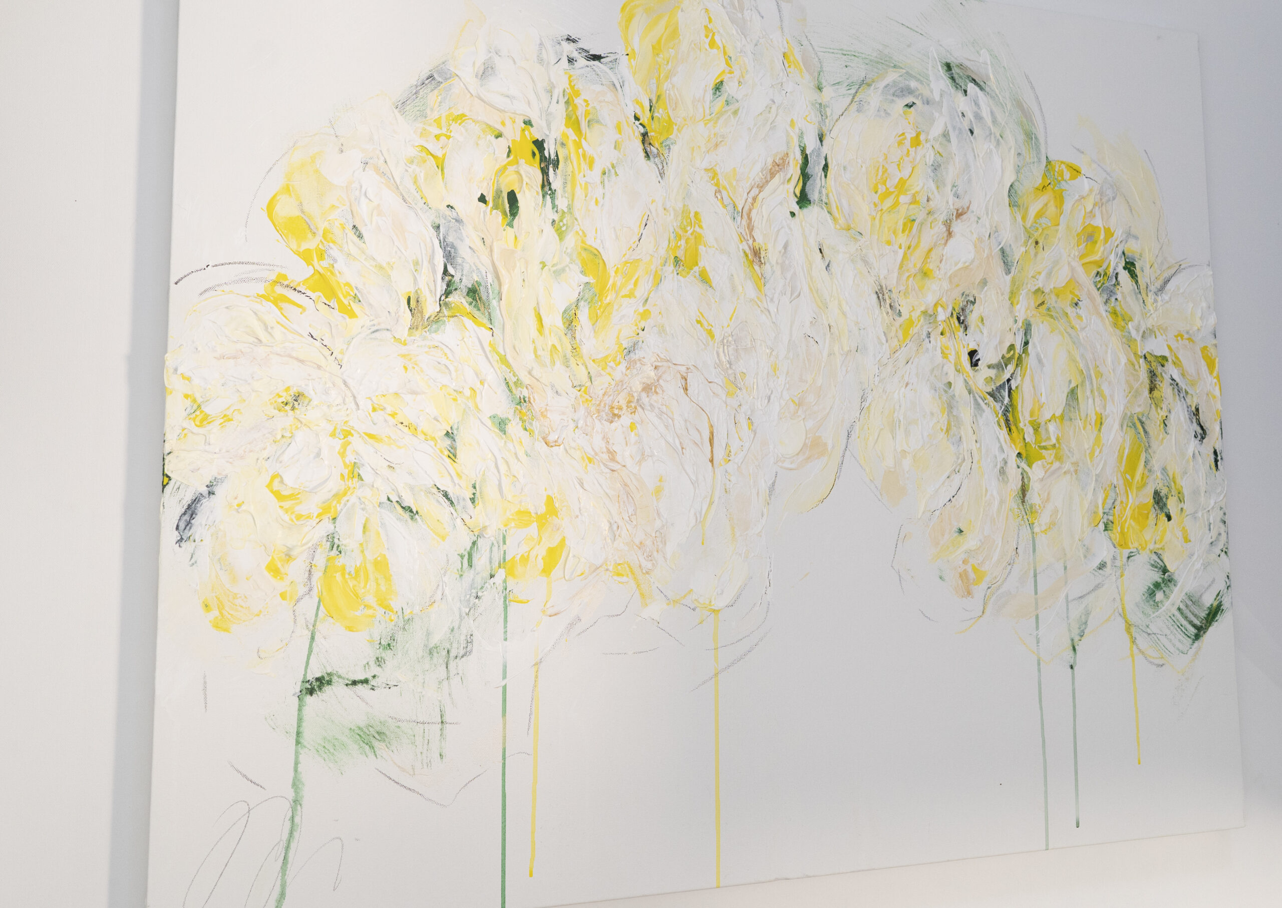 大きめのキャンバスに黄色い花を抽象的に美しく描いています。