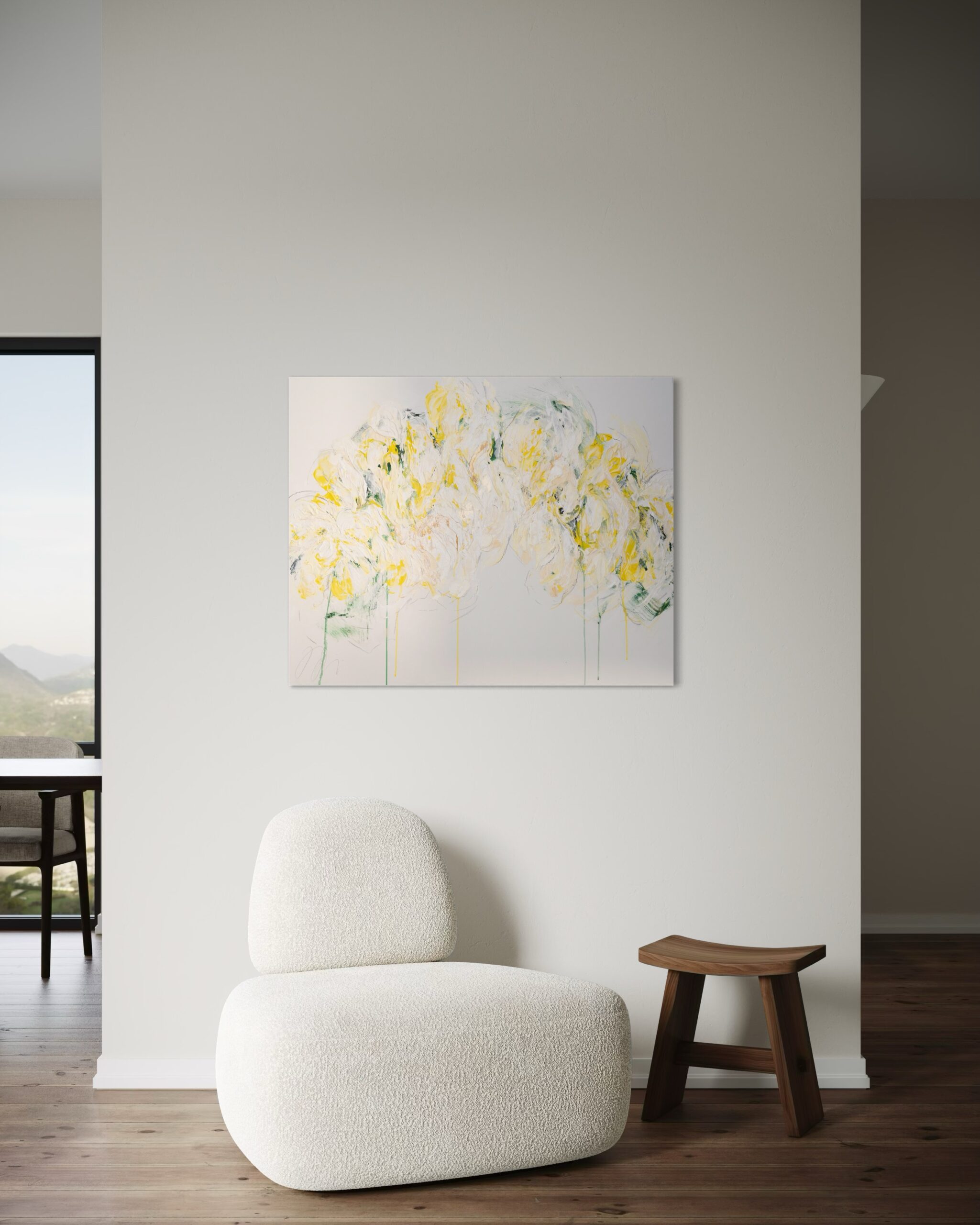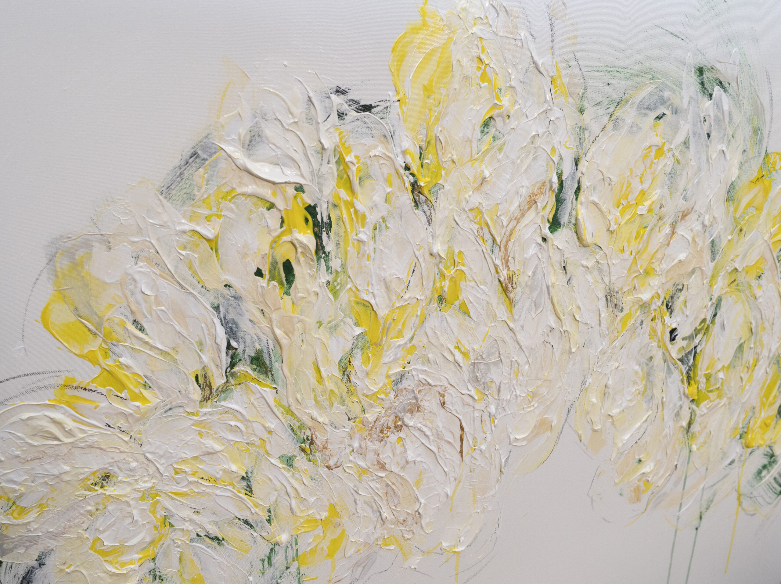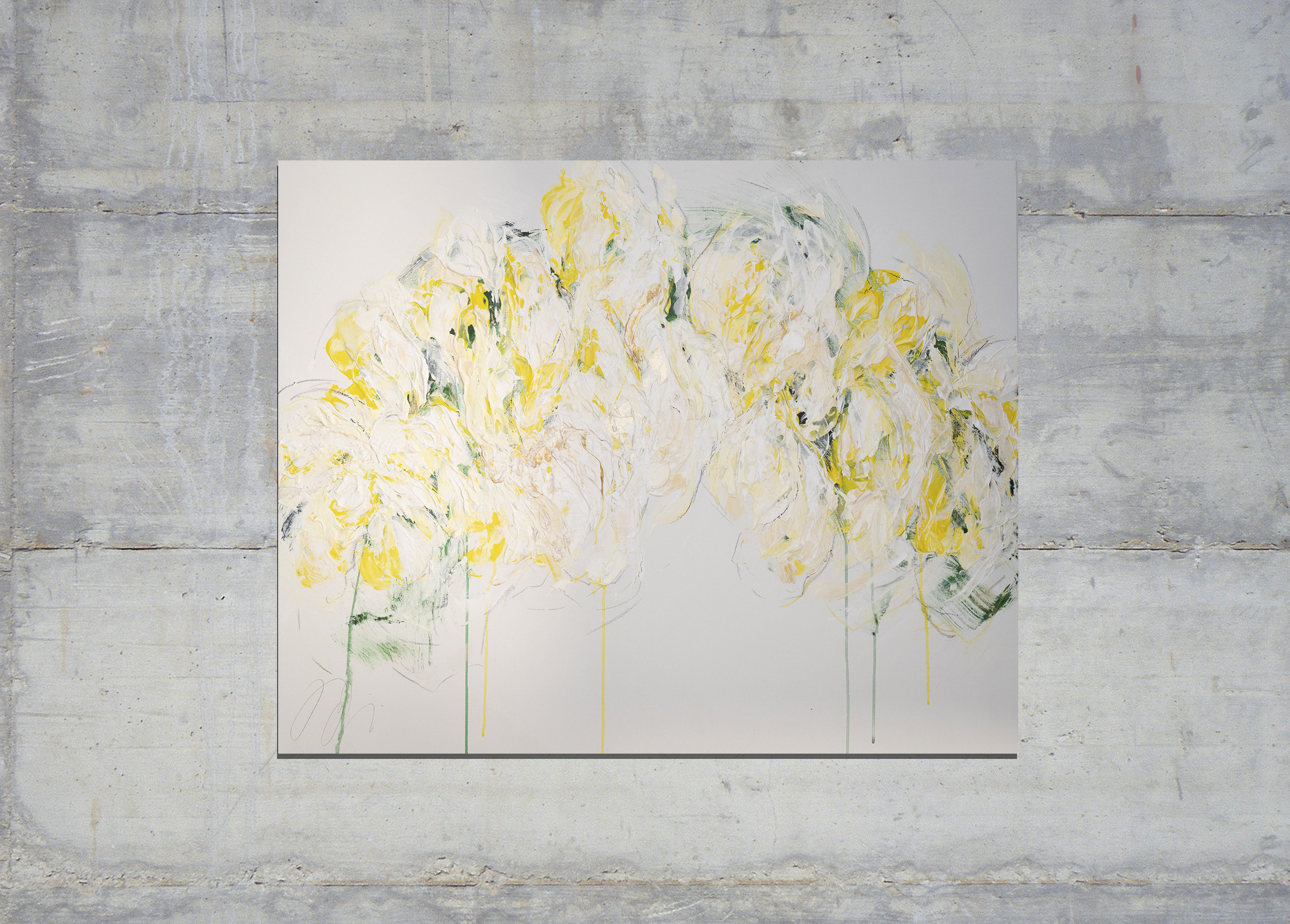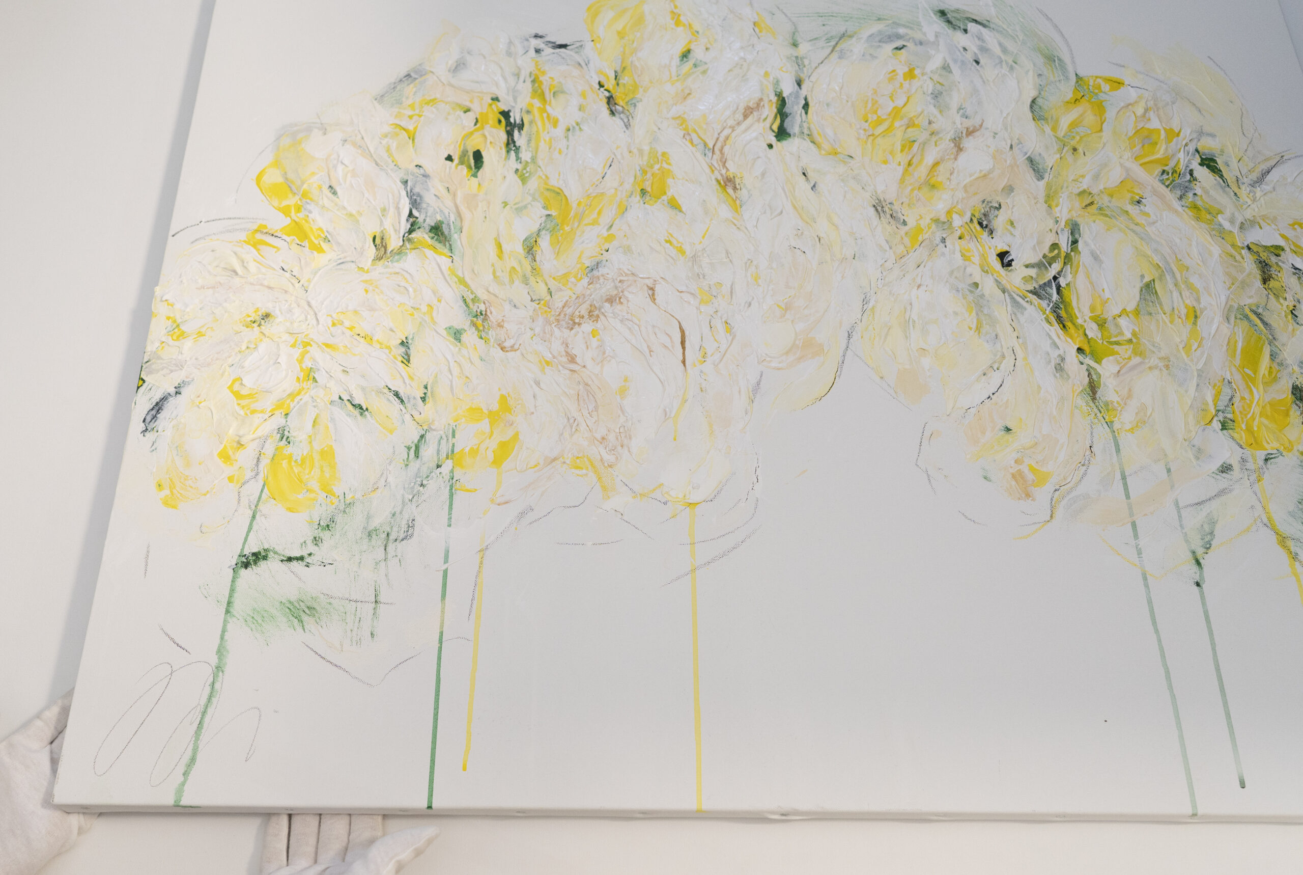 大きめのキャンバスに黄色い花を抽象的に美しく描いています。
