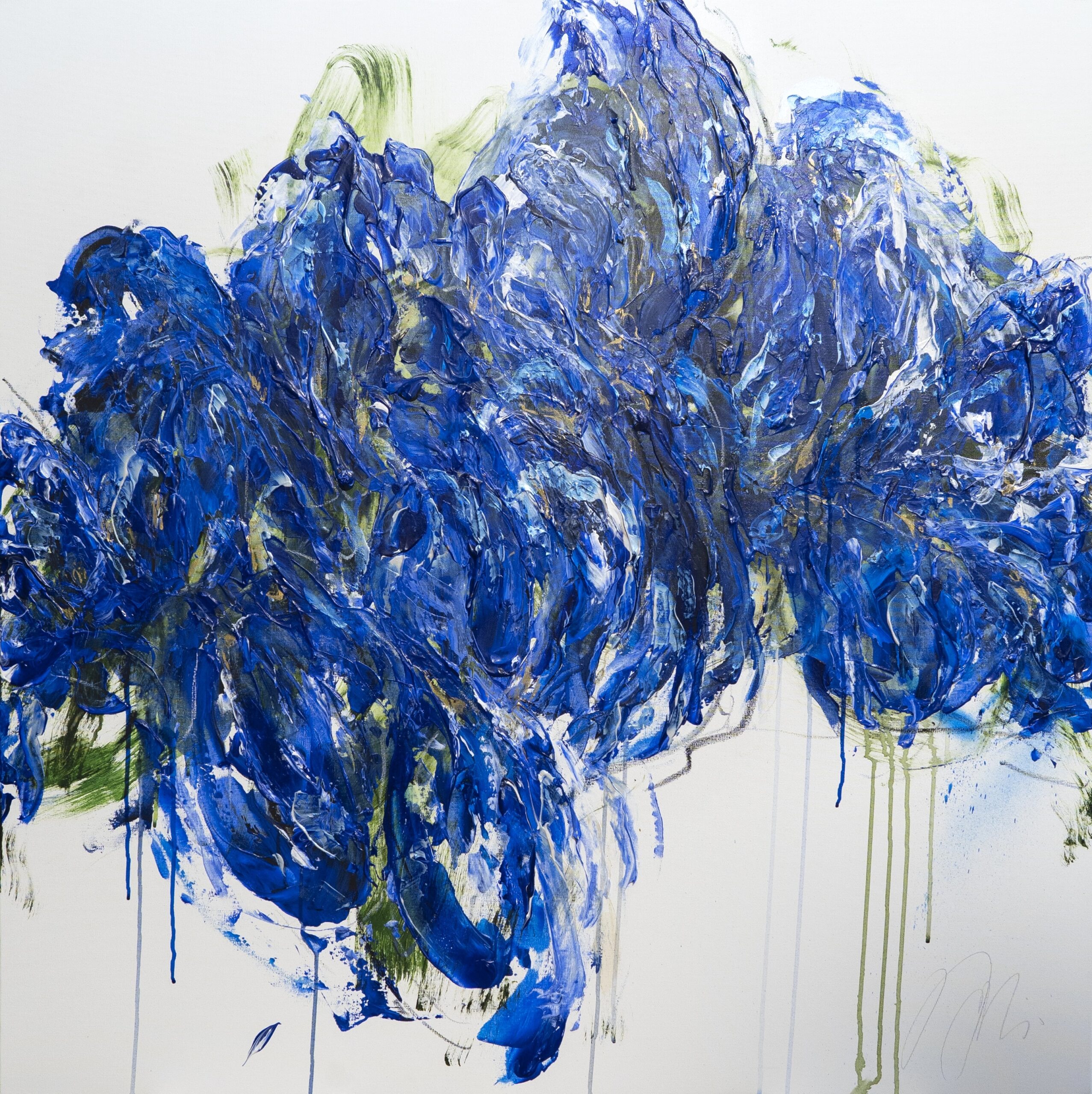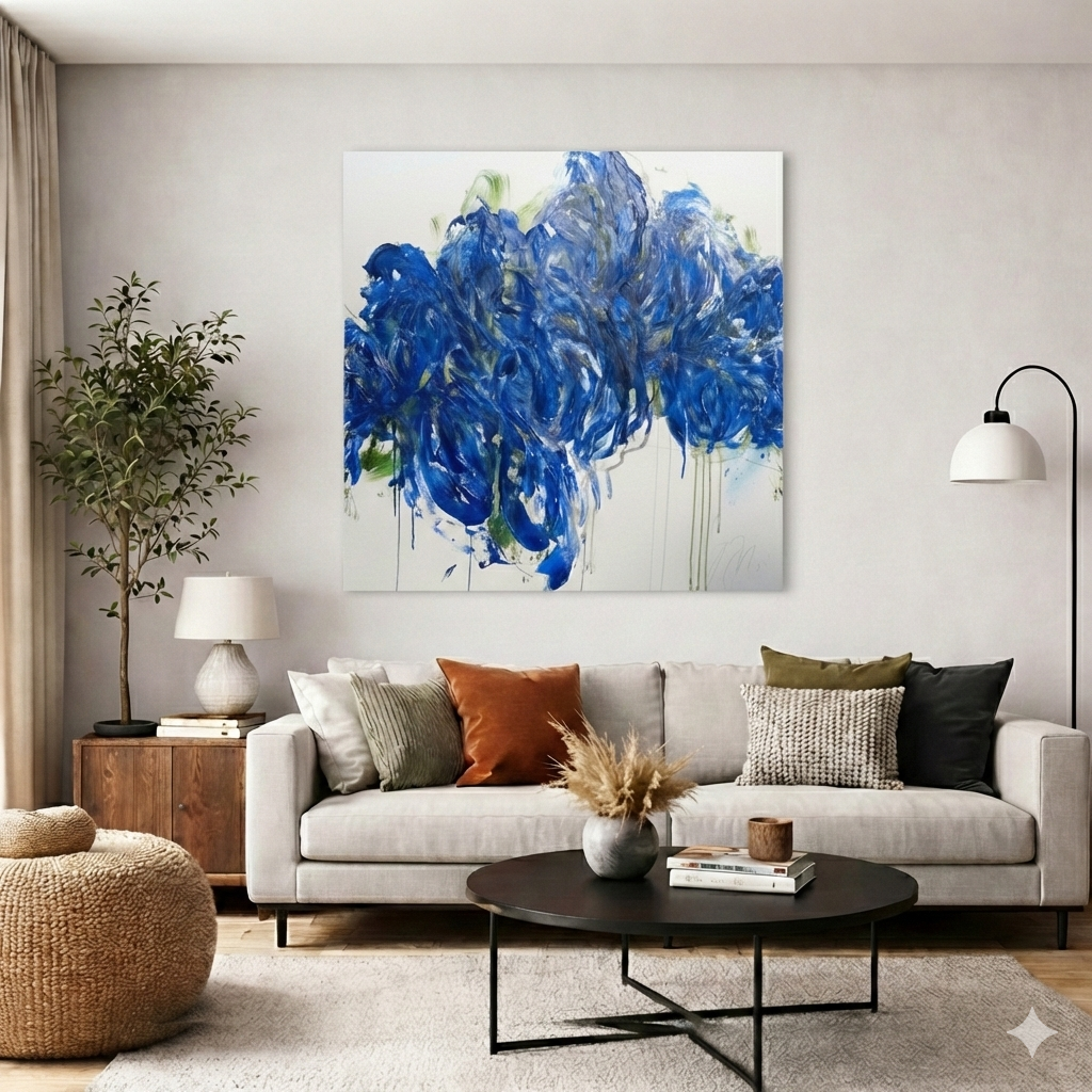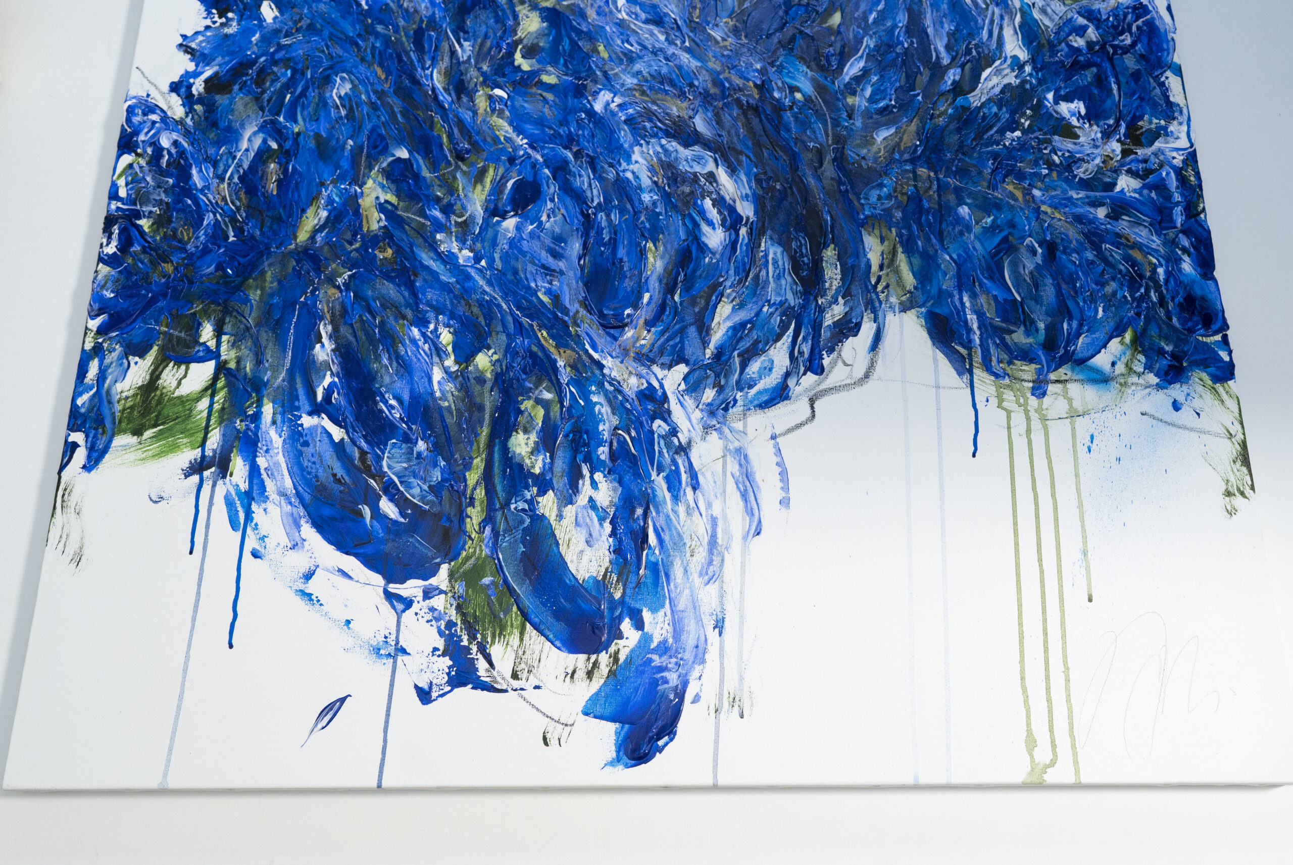 青色い花を抽象的に美しく描いた作品。いくつもの青色を重ねたレイヤーがとても存在感があり素敵に飾って頂けます。