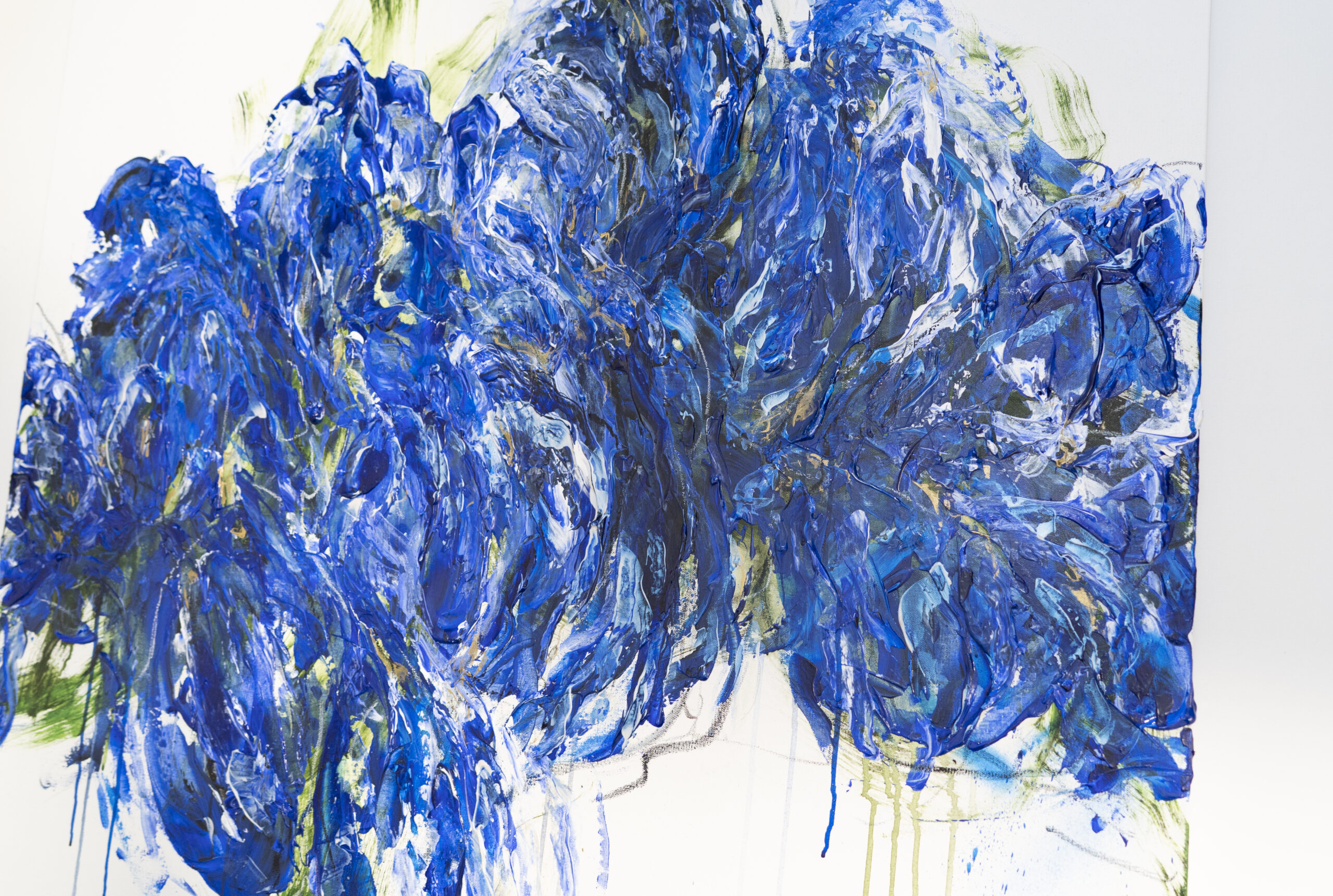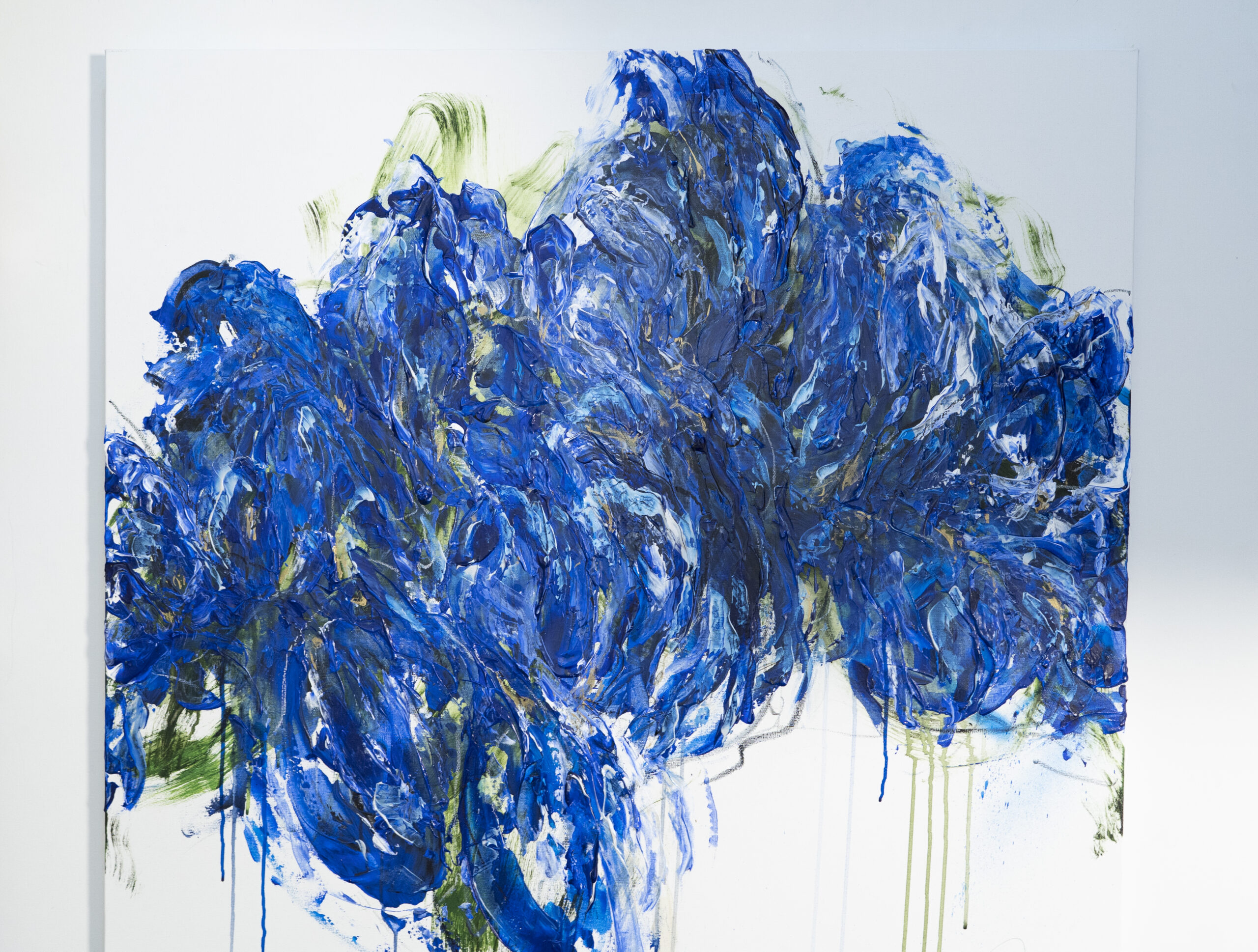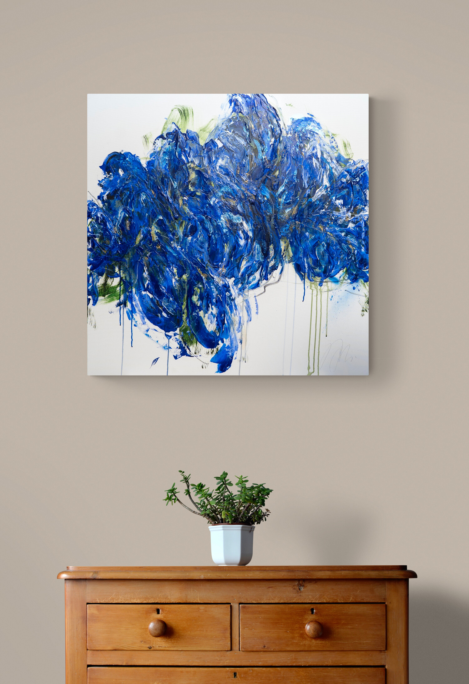 青色い花を抽象的に美しく描いた作品。いくつもの青色を重ねたレイヤーがとても存在感があり素敵に飾って頂けます。