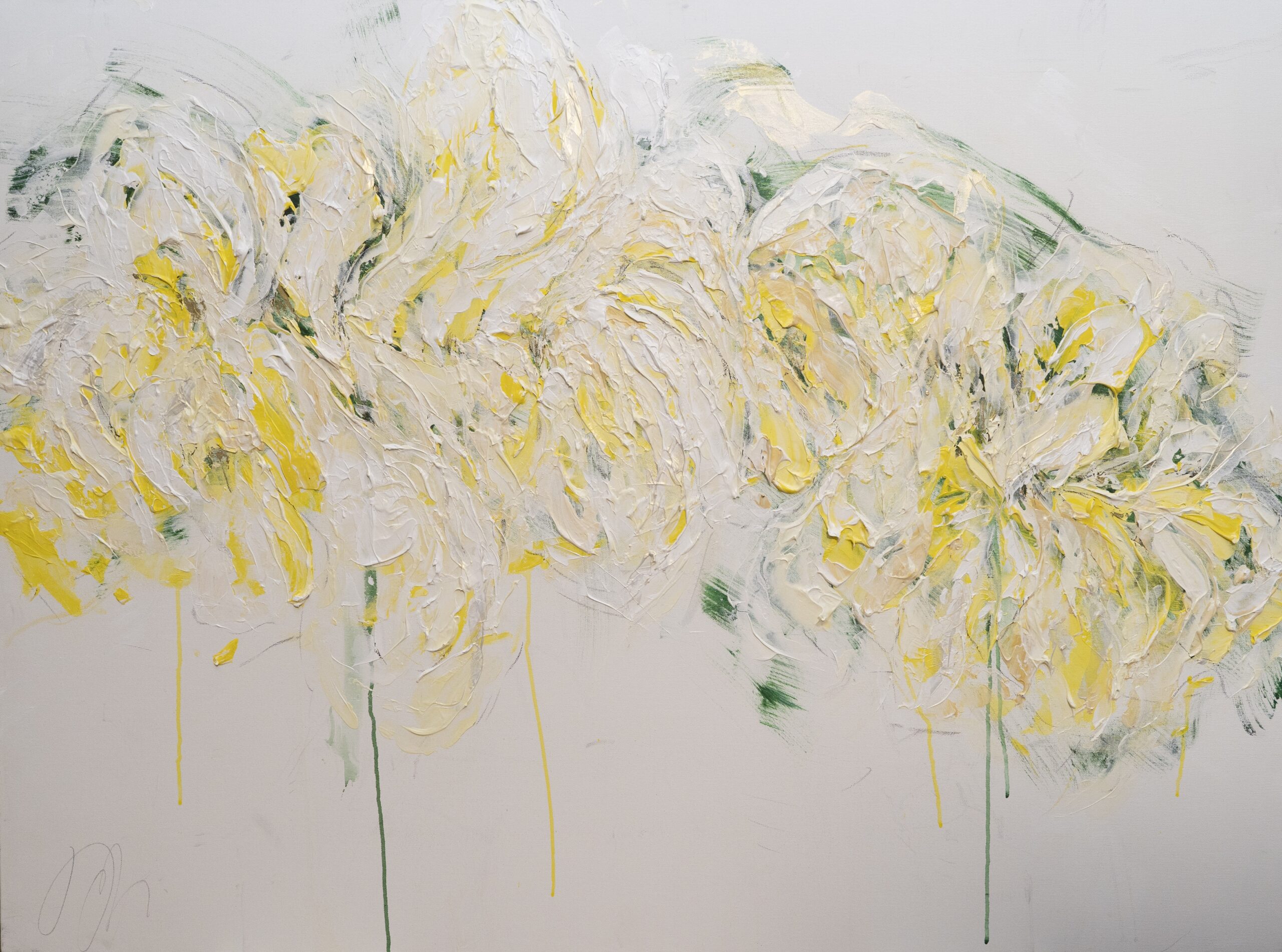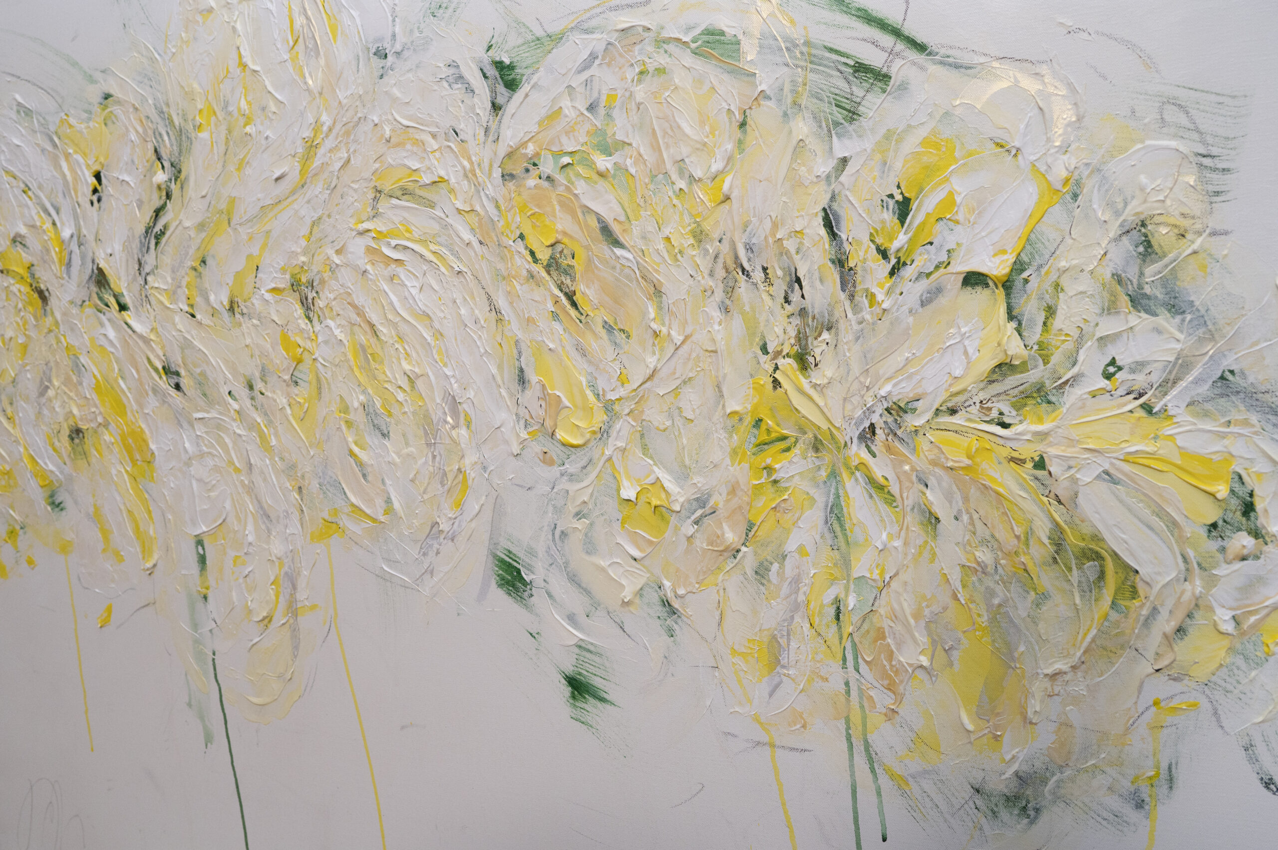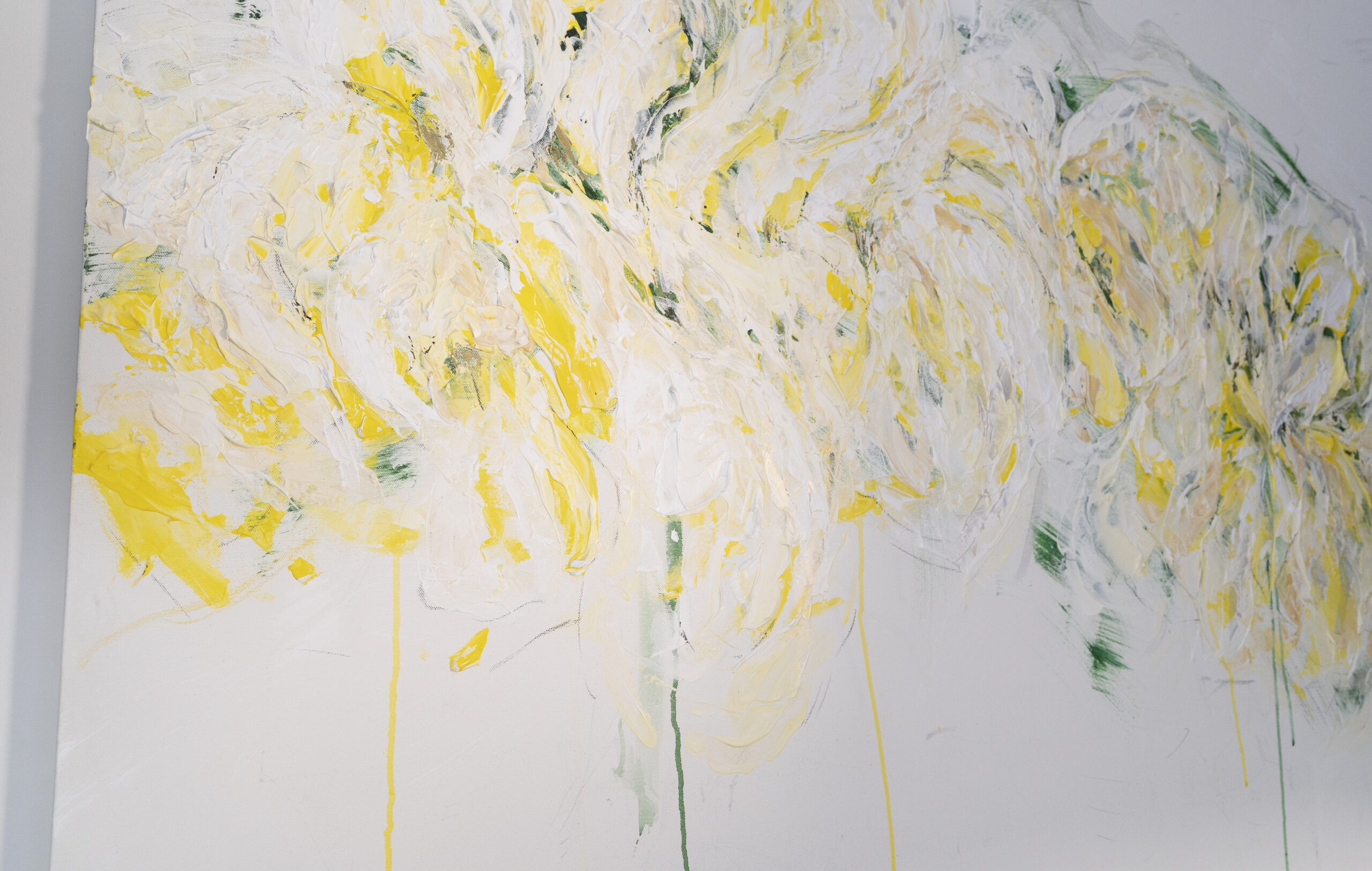 大きめのキャンバスに黄色い花を抽象的に美しく描いています。