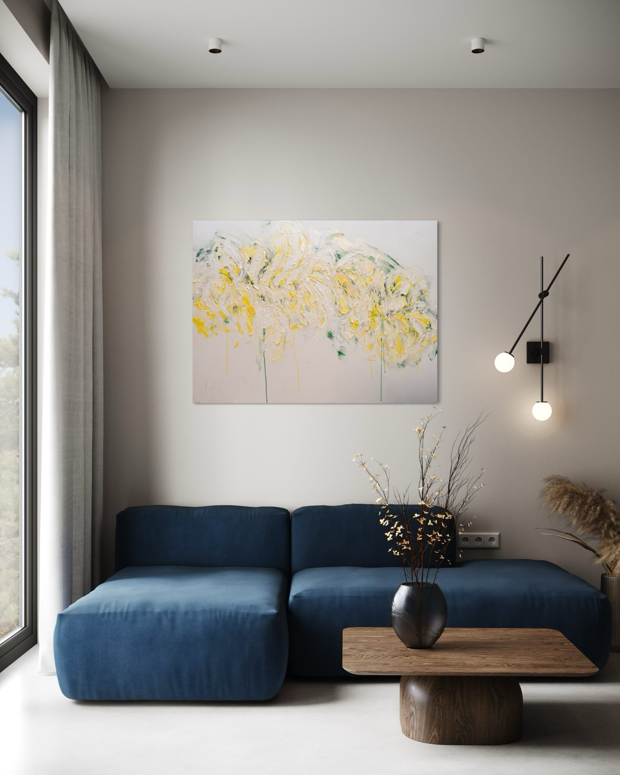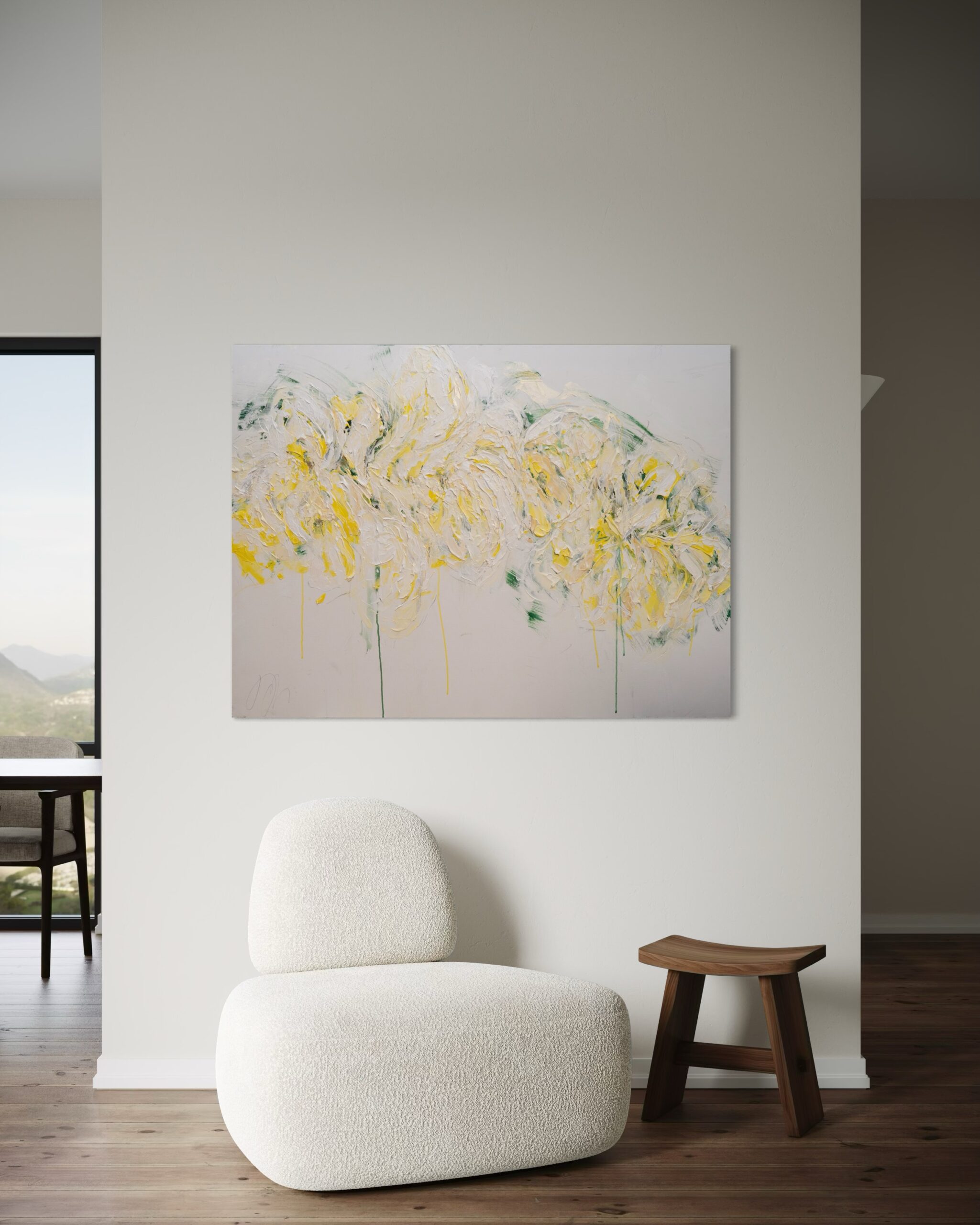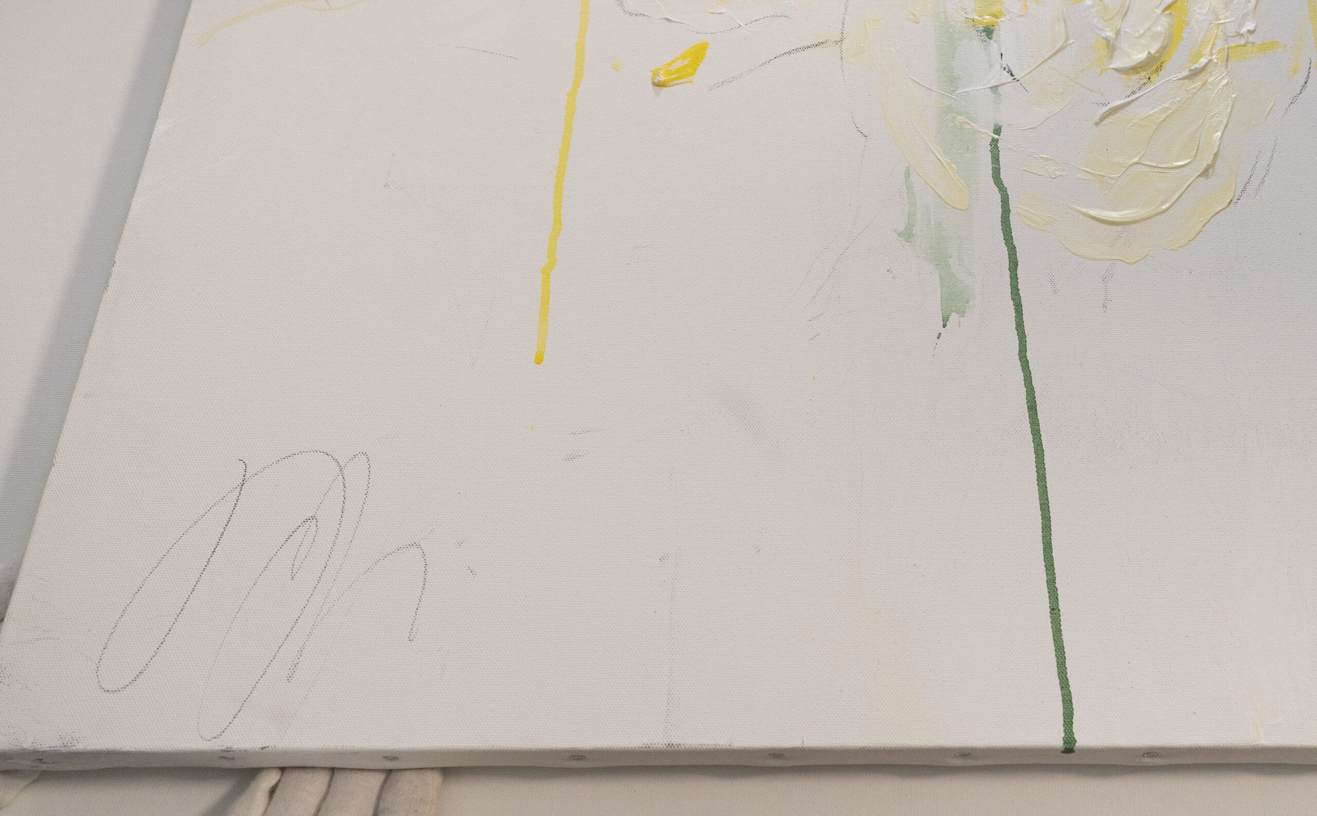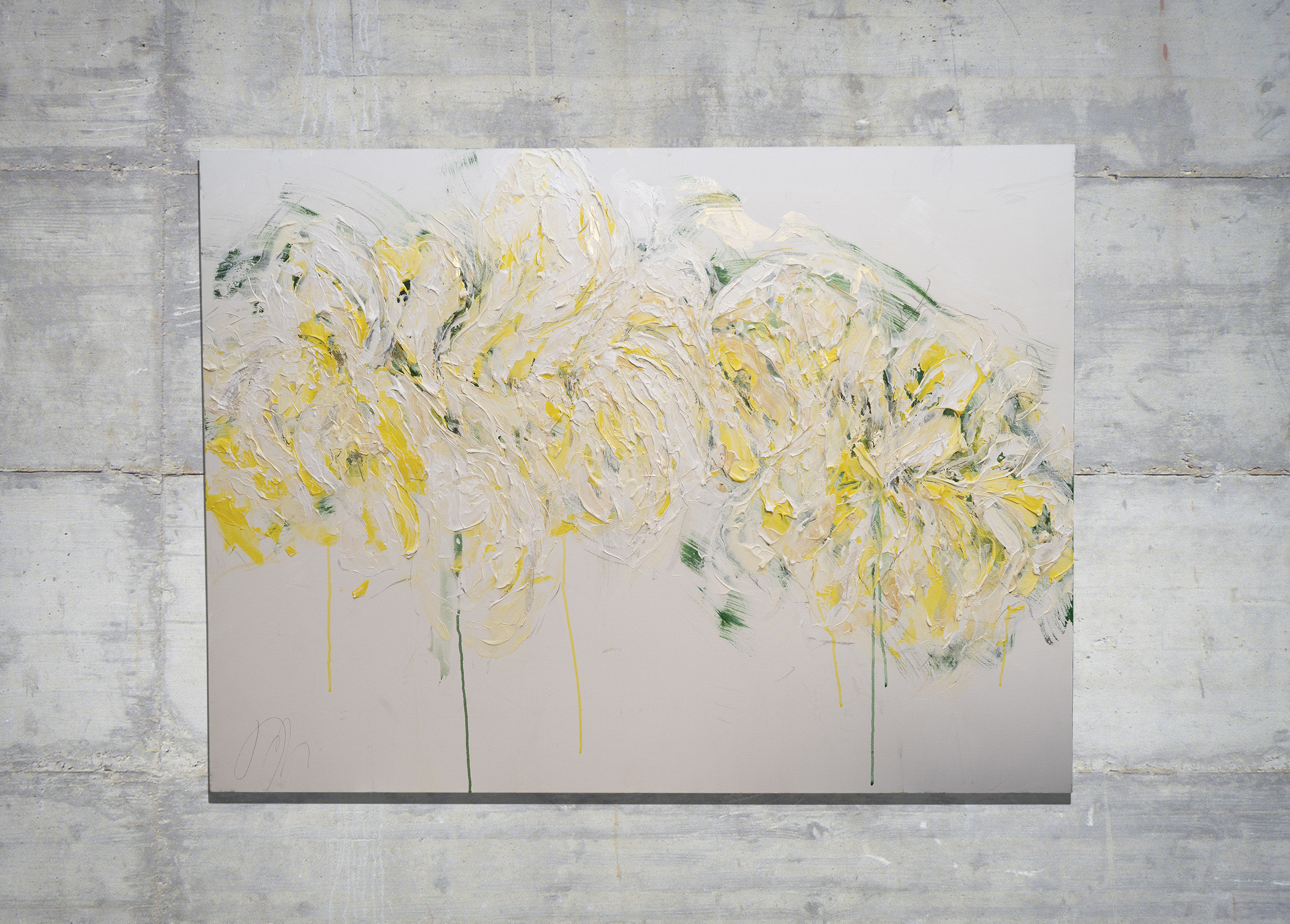 大きめのキャンバスに黄色い花を抽象的に美しく描いています。