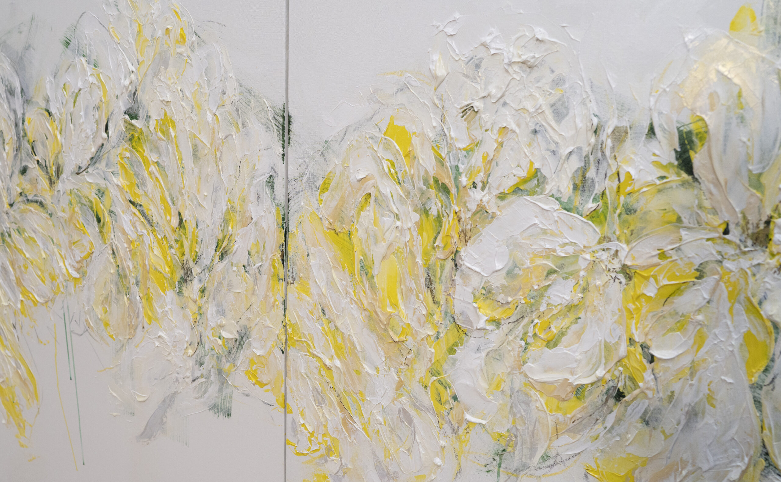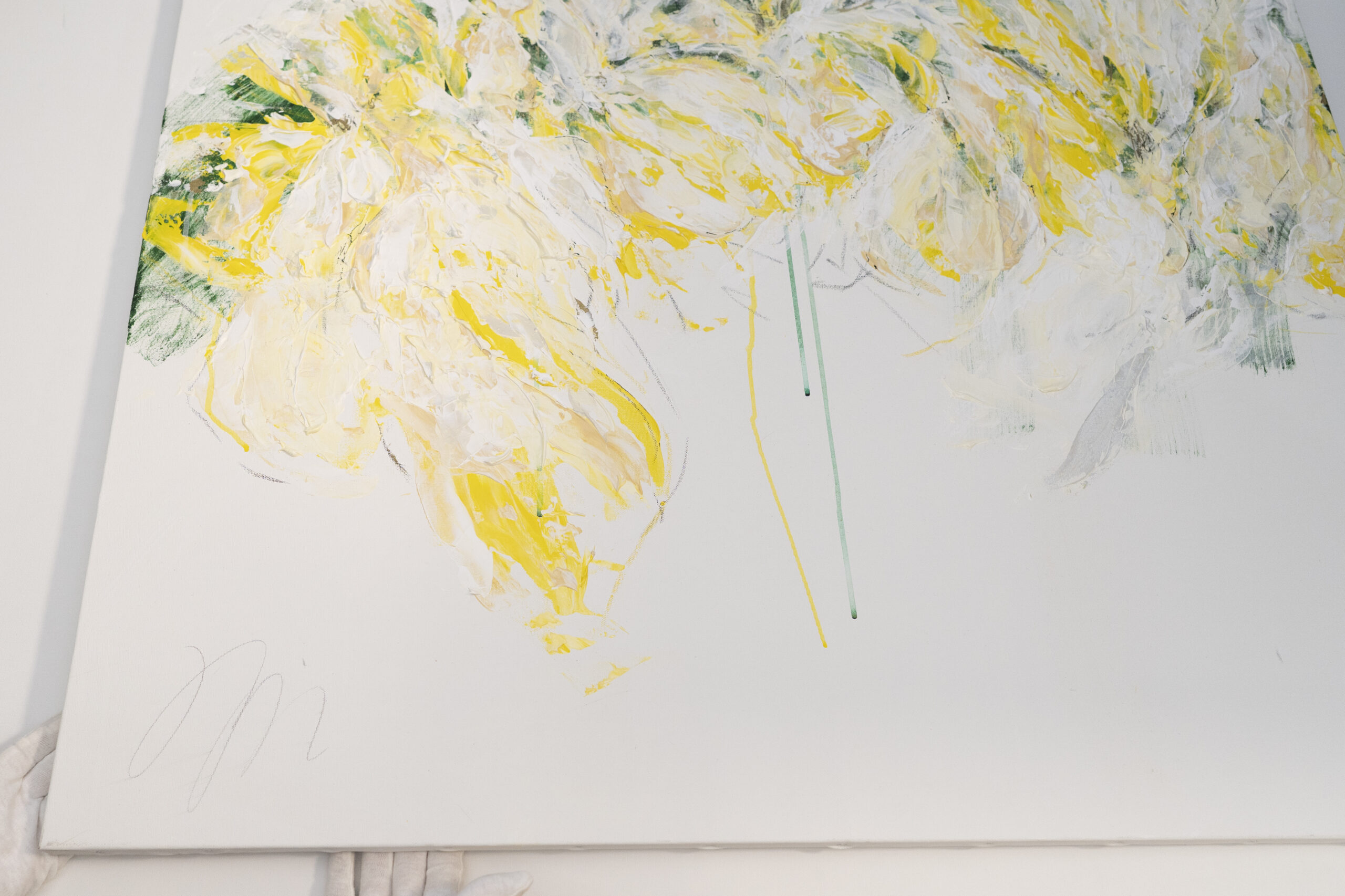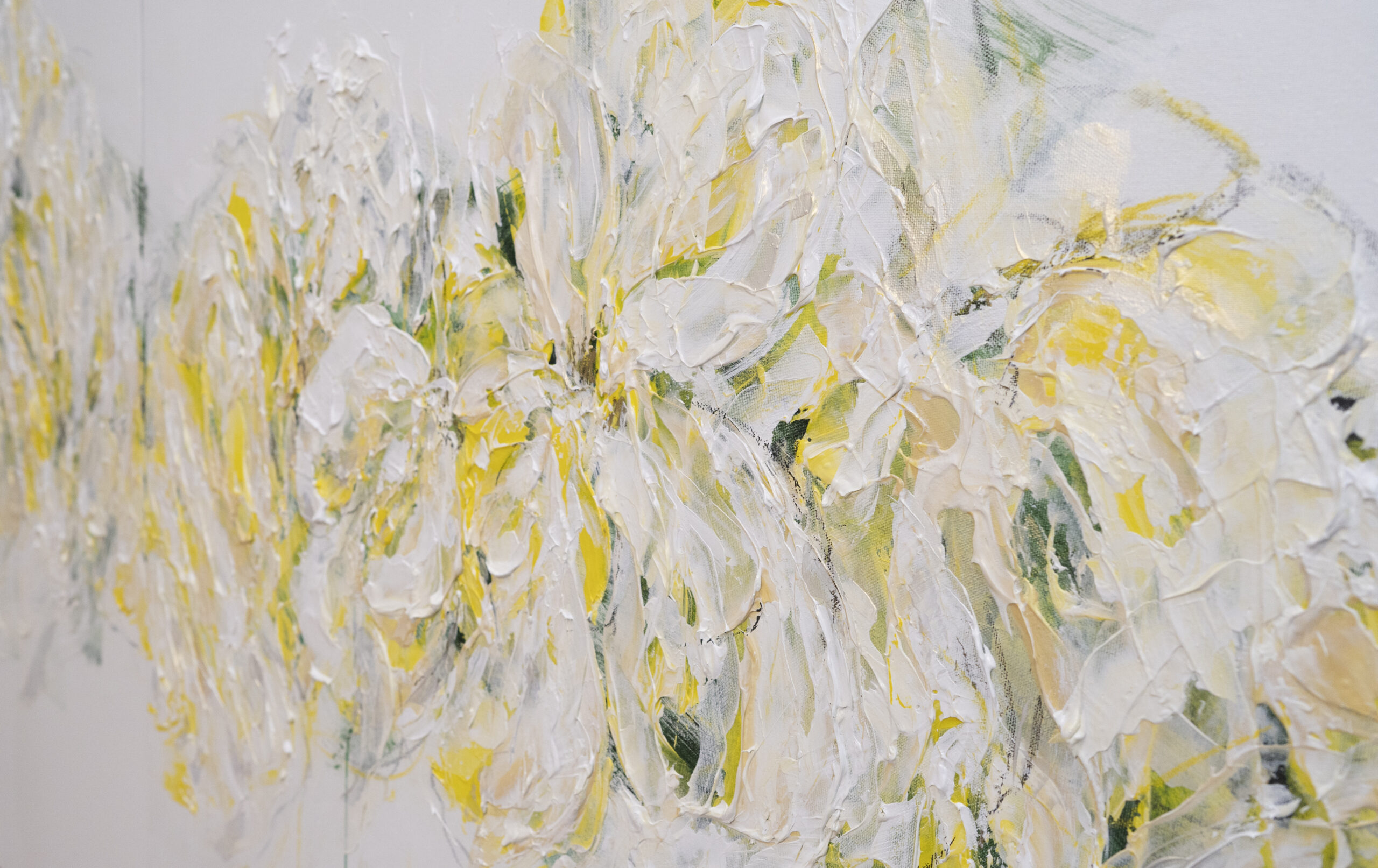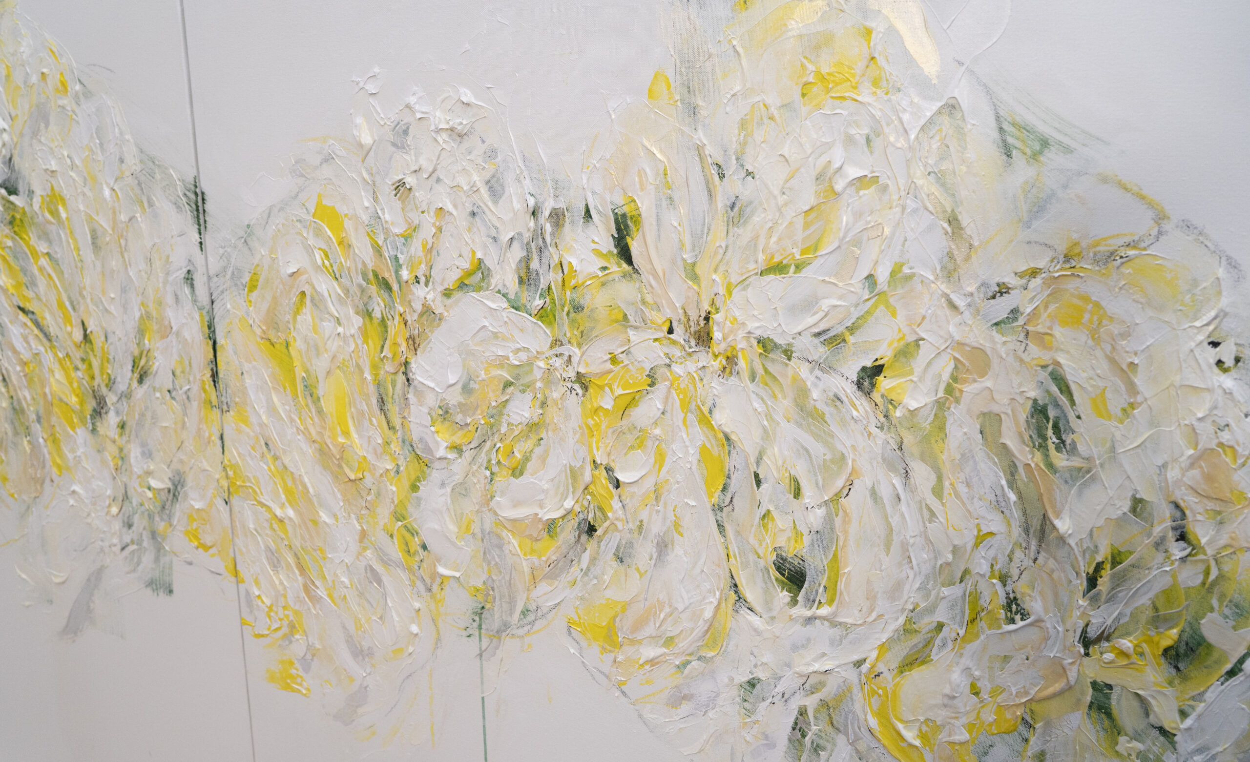 淡い黄色い花を抽象的に美しく描いており、いくつもの黄色を重ねたレイヤーがとても存在感があり素敵に飾って頂けます。