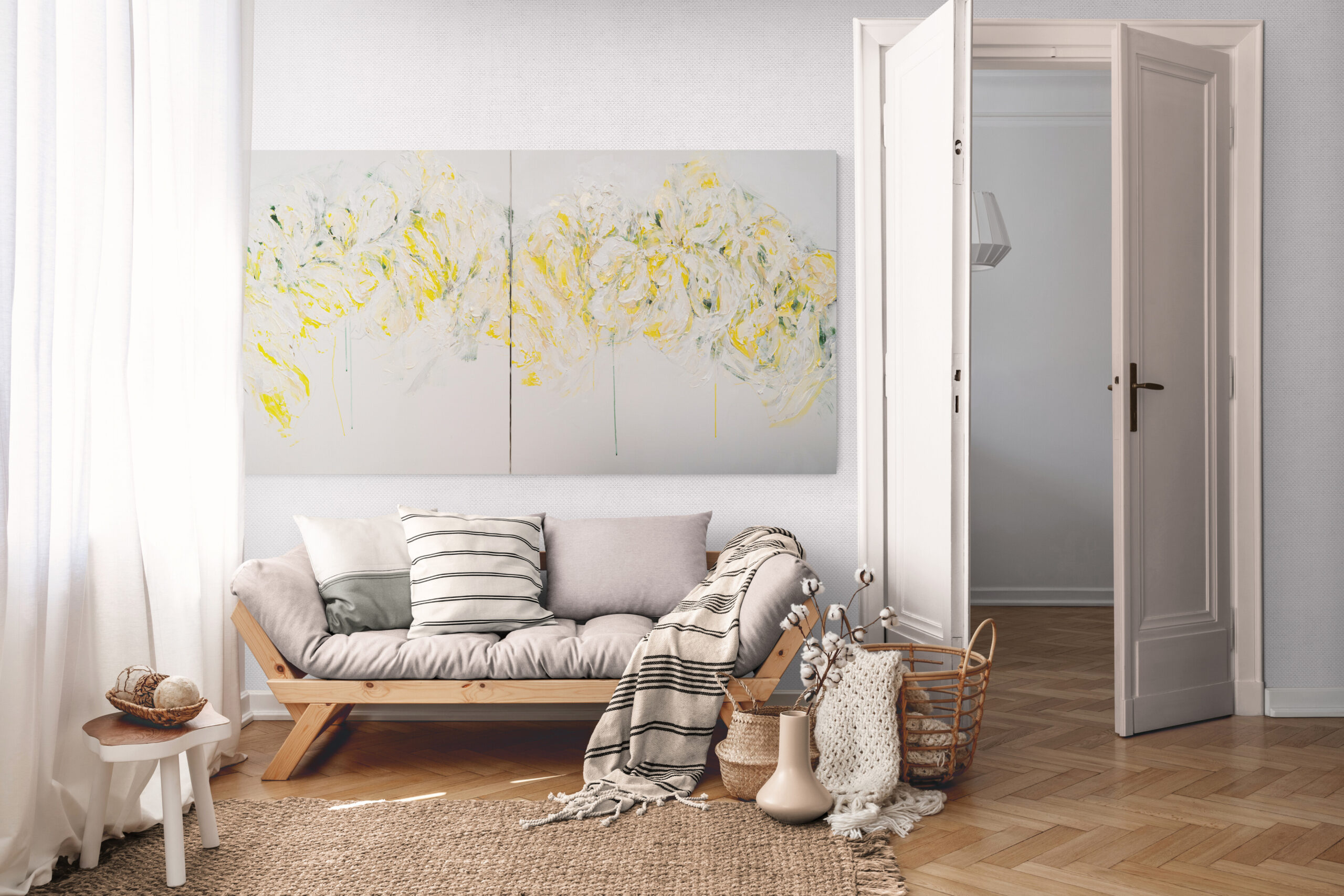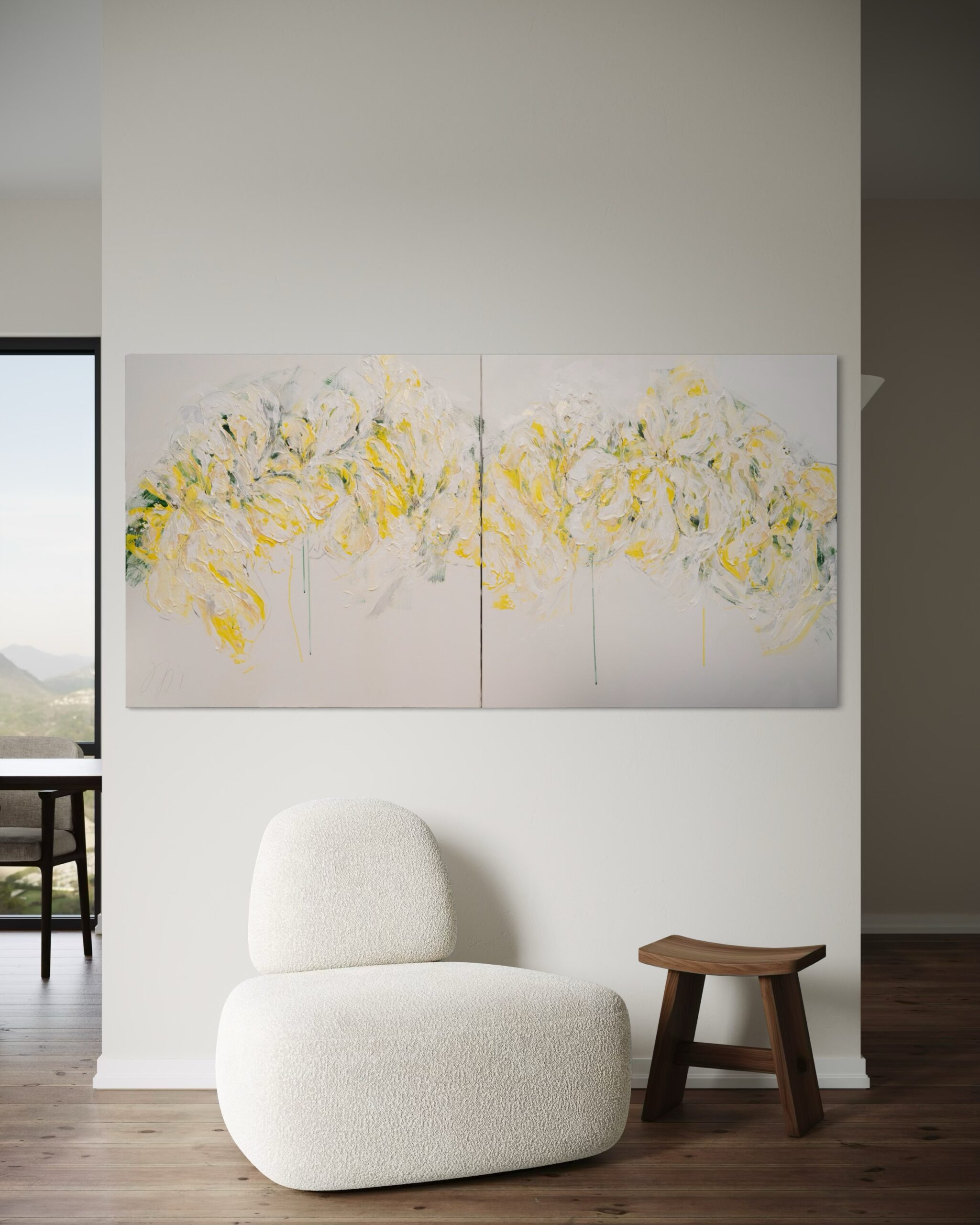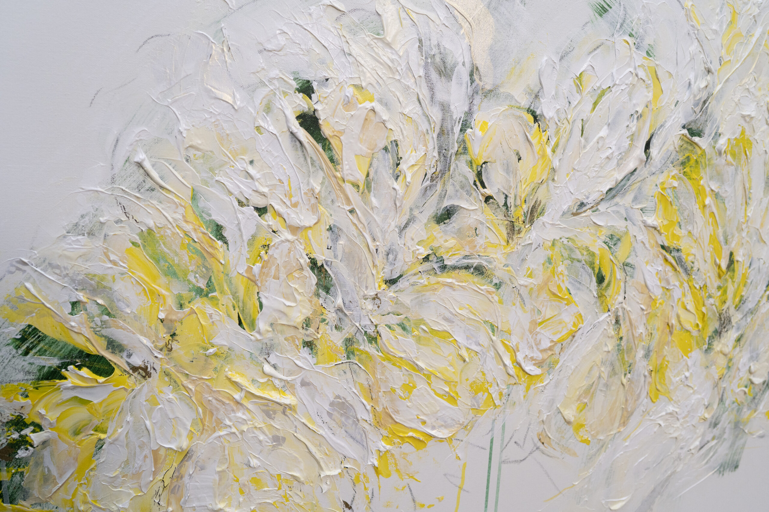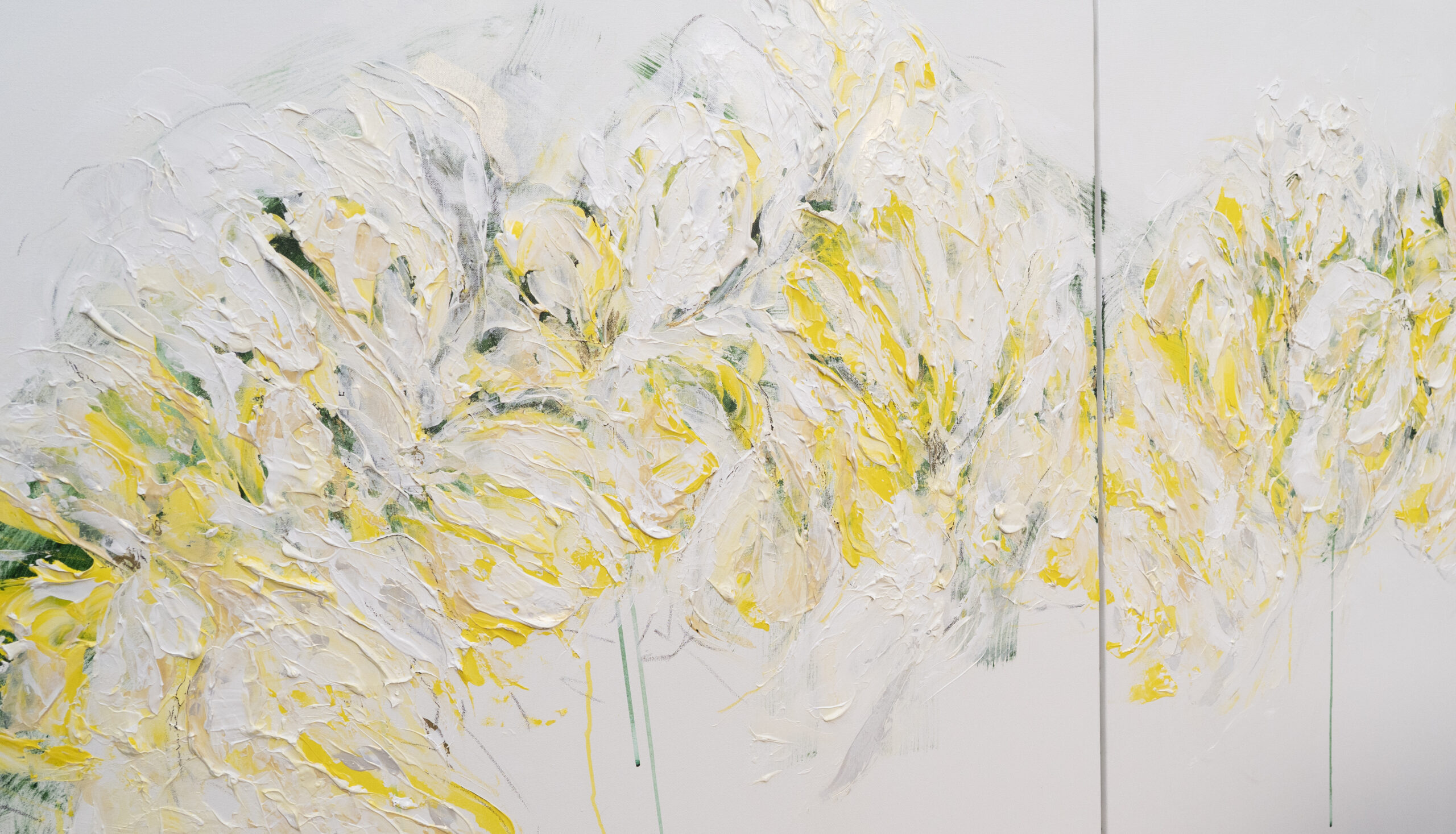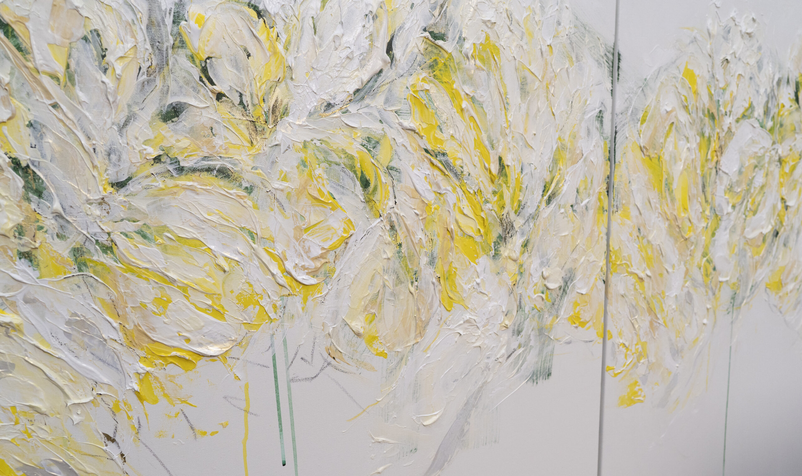 淡い黄色い花を抽象的に美しく描いており、いくつもの黄色を重ねたレイヤーがとても存在感があり素敵に飾って頂けます。