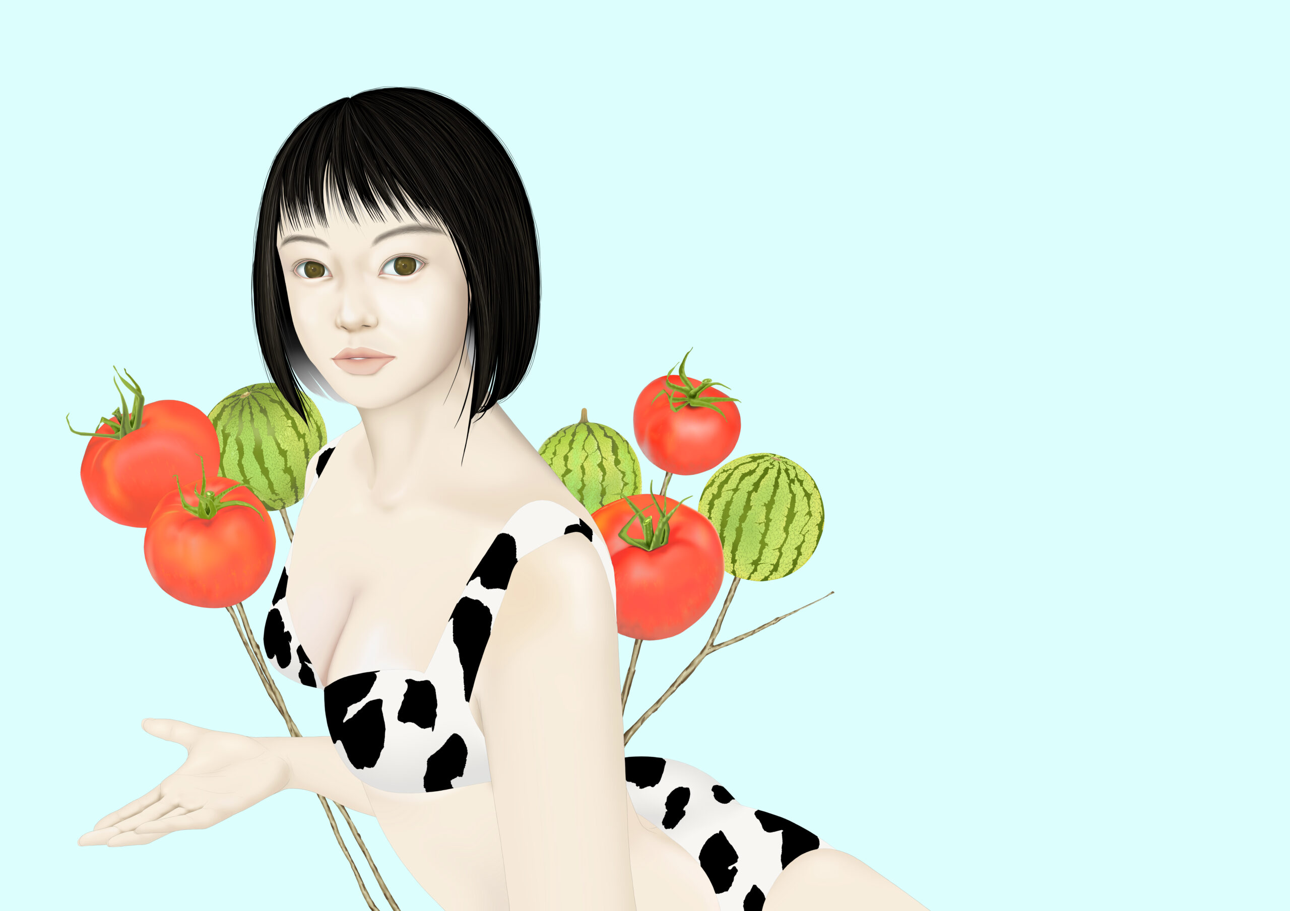 ホルスタイン柄の水着少女と枝になったトマト、スイカのギャップ。