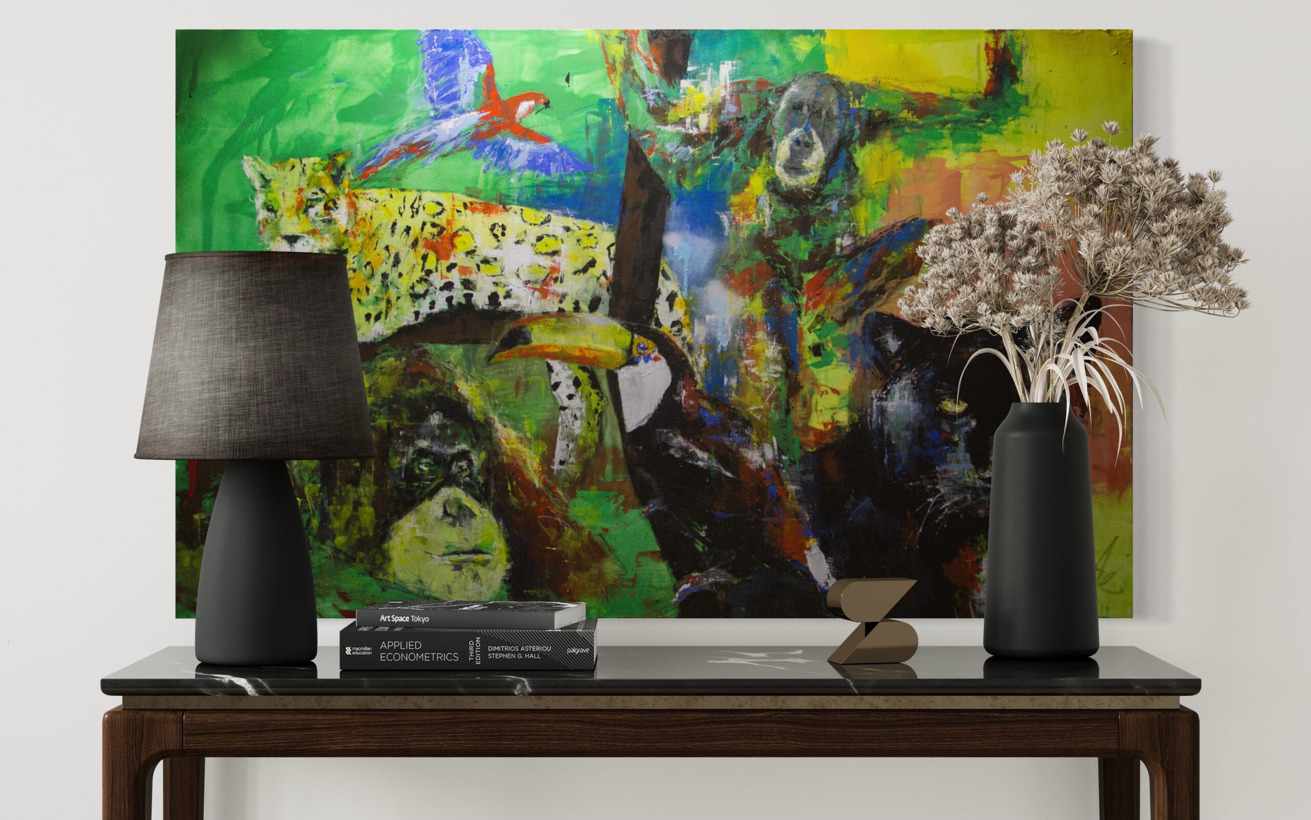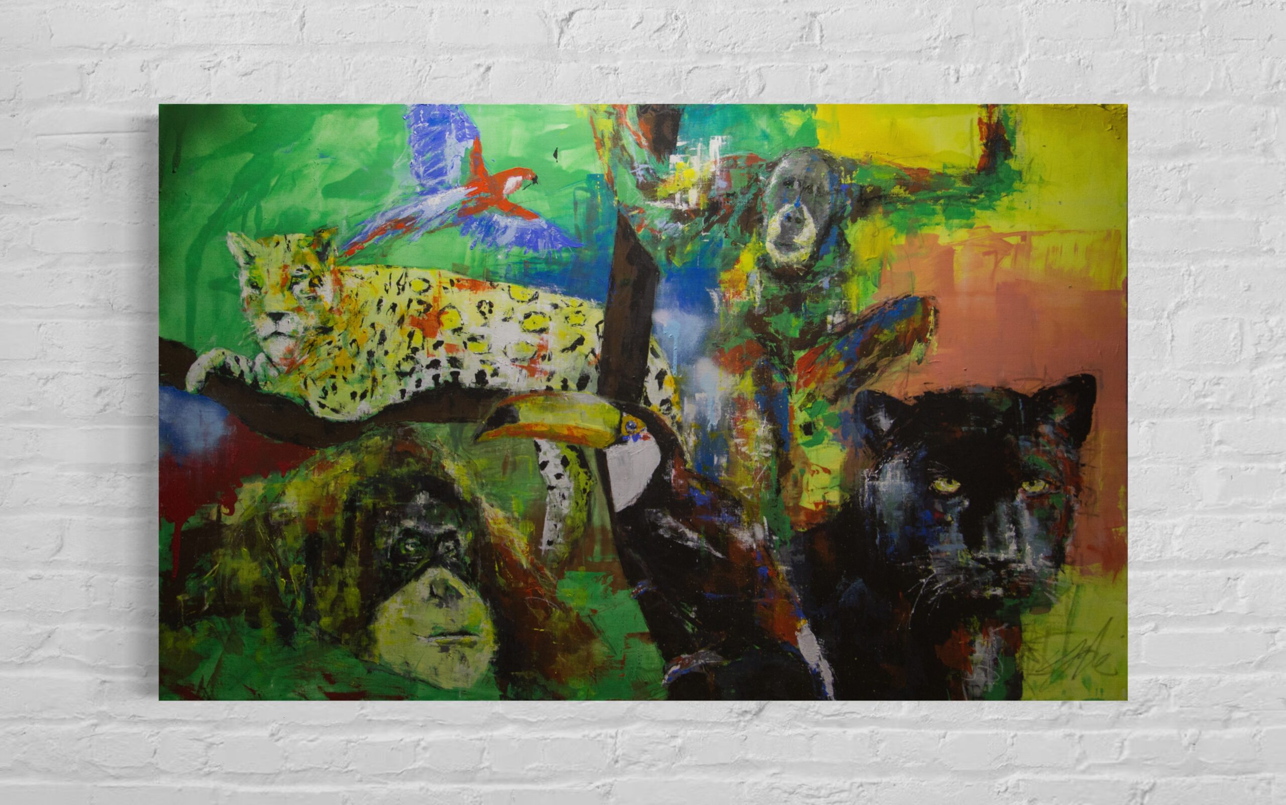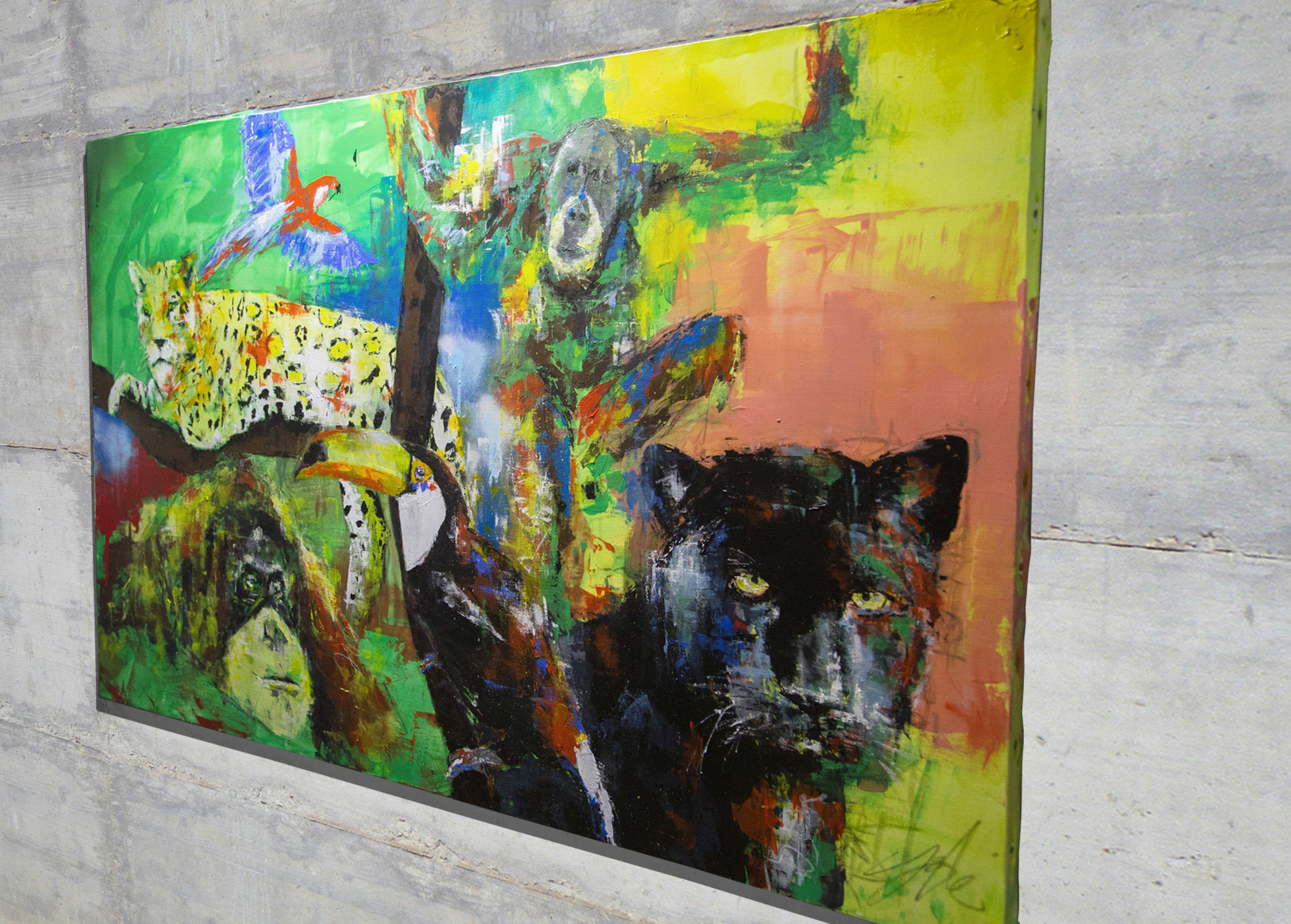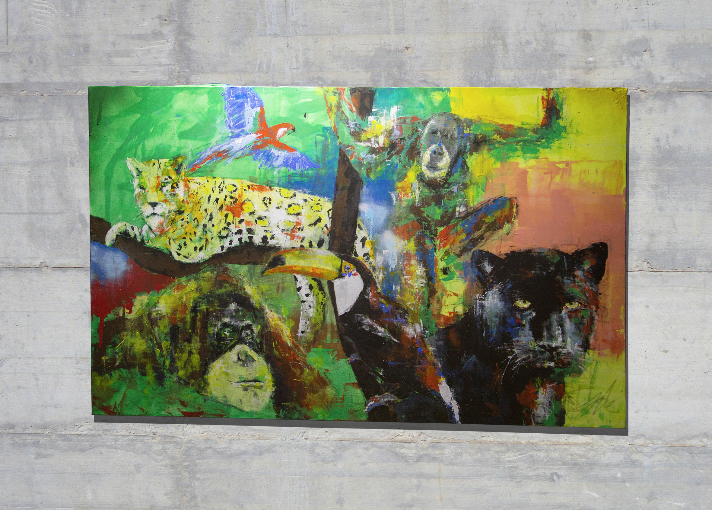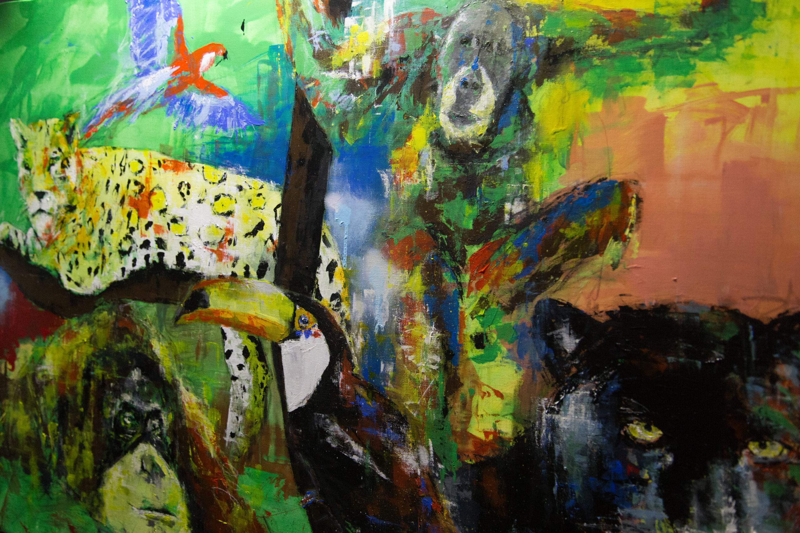 TOMOYAの作品の中では珍しい横長のキャンバスに制作されており、スプレー塗料の質感や迫力ある雰囲気が感じられる1点です。アマゾンにいる動物を1枚のキャンバスに閉じ込めて描いており、動物の力強さ、存在感が感じられます。