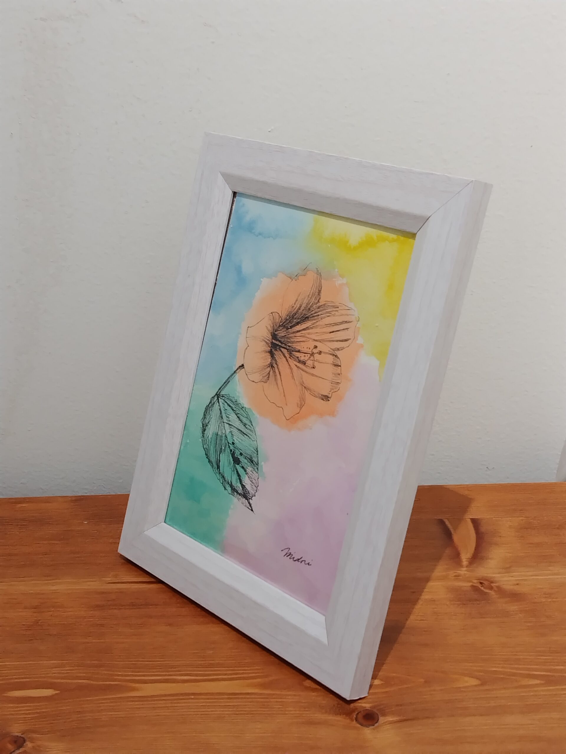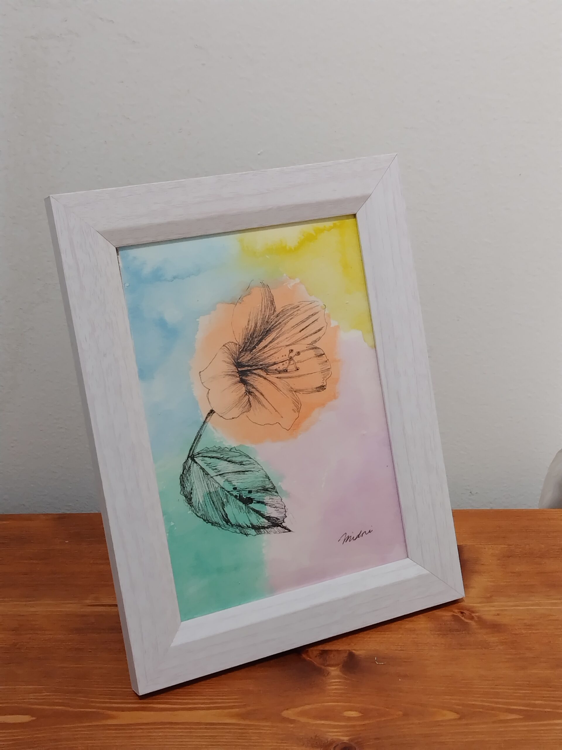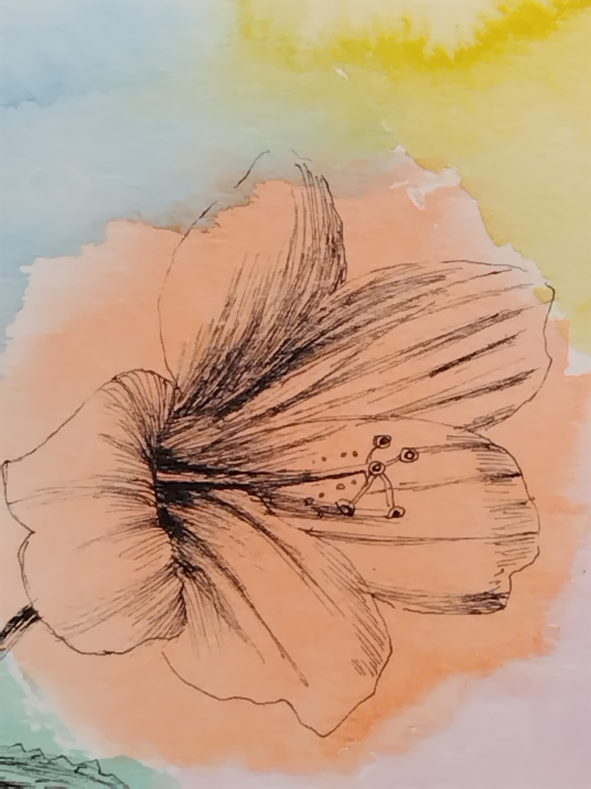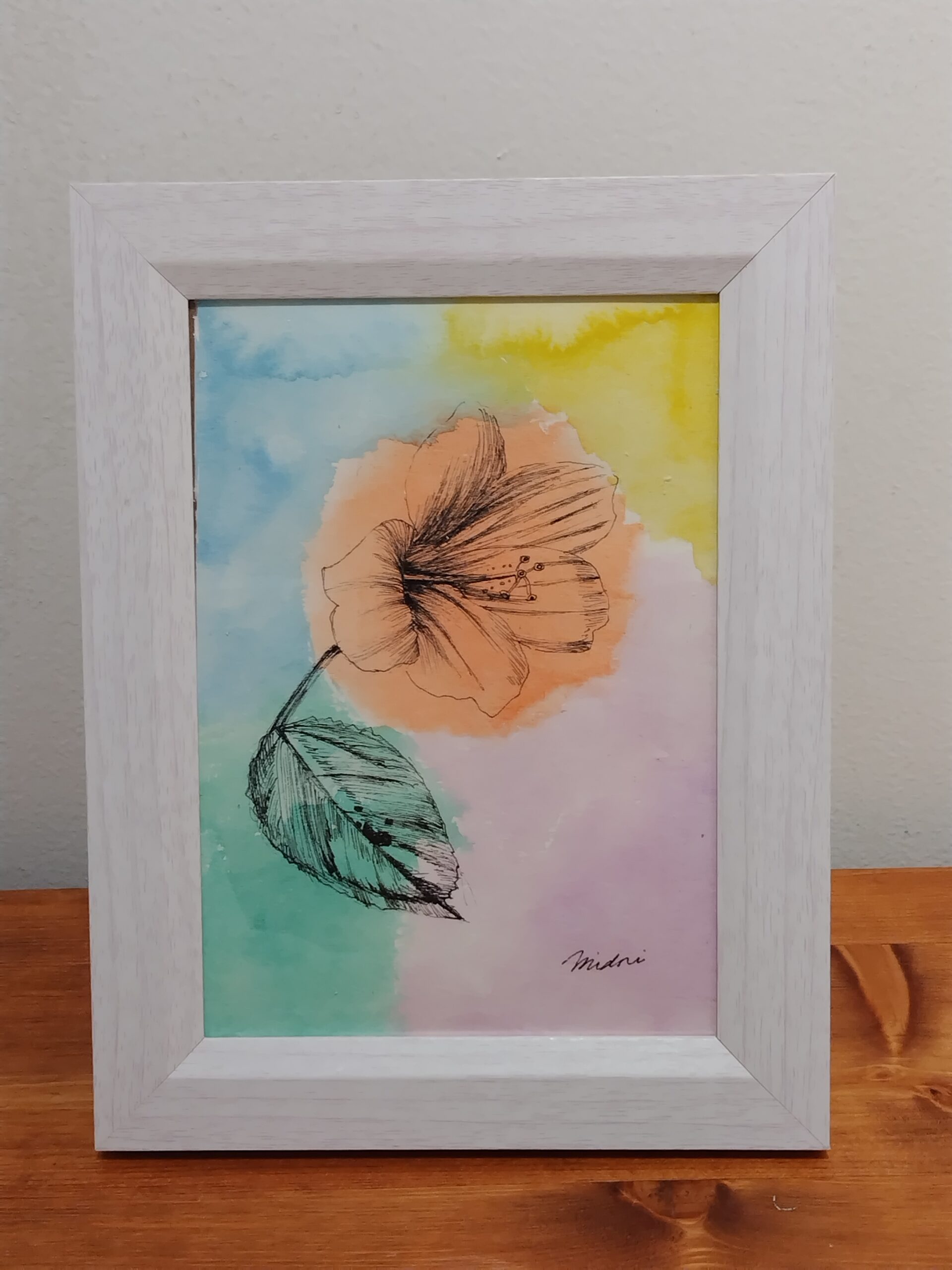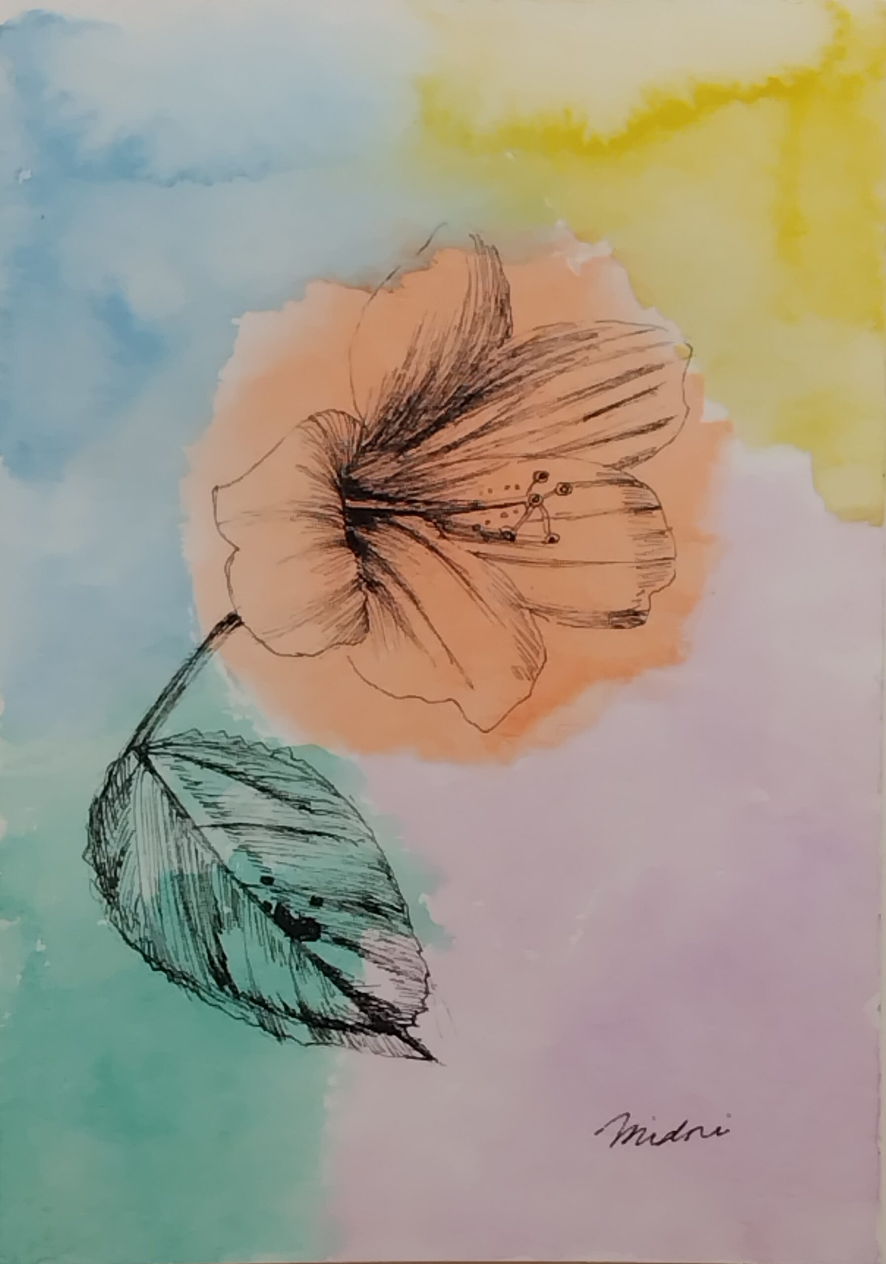 植物園でハイビスカスの花を見て、その可憐さに惹かれ、描きました。水彩の鮮やかさとペンの黒色の対比をお楽しみいただければ嬉しいです。