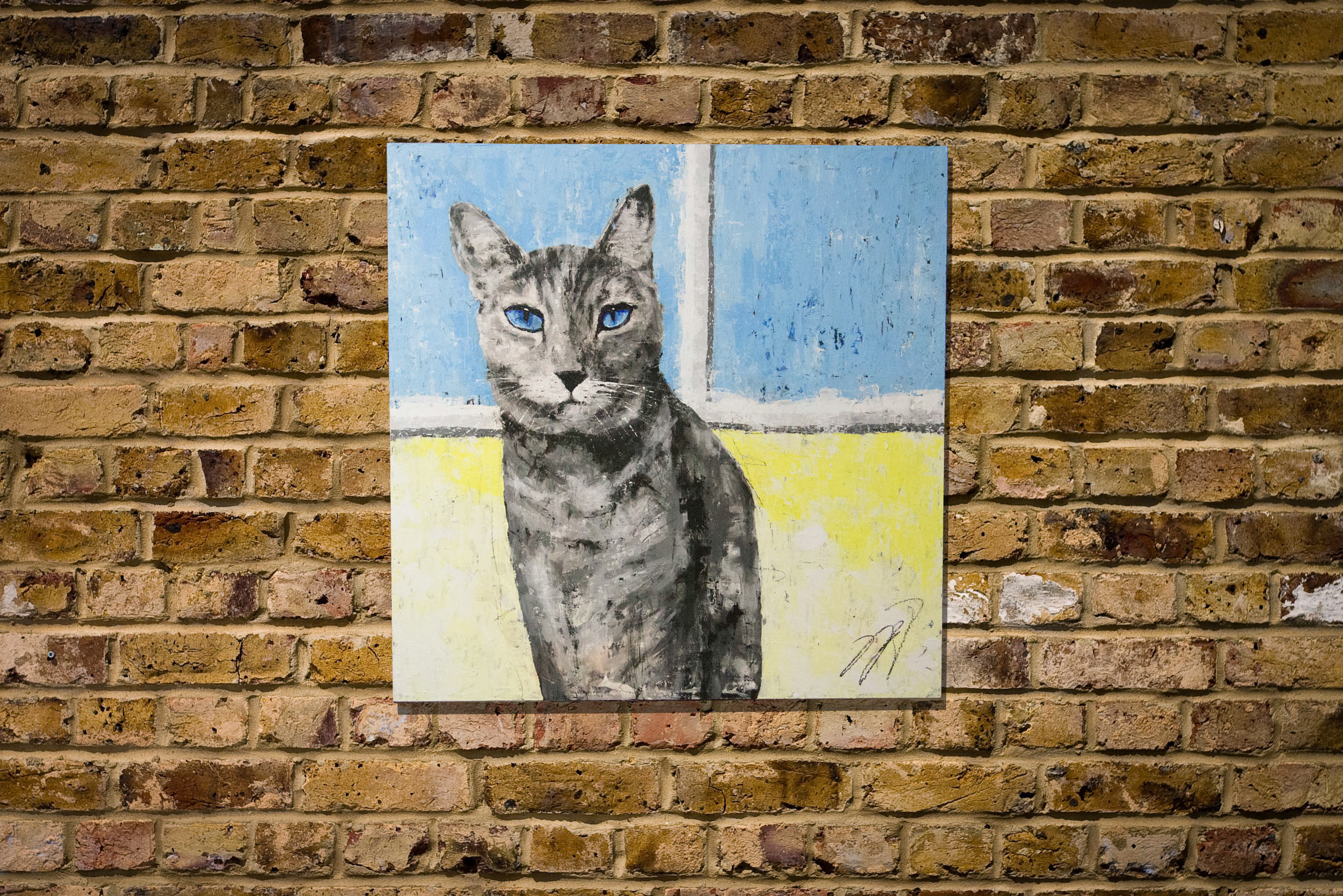 綺麗なブルーの瞳が印象的な猫のスプレーアート作品。
