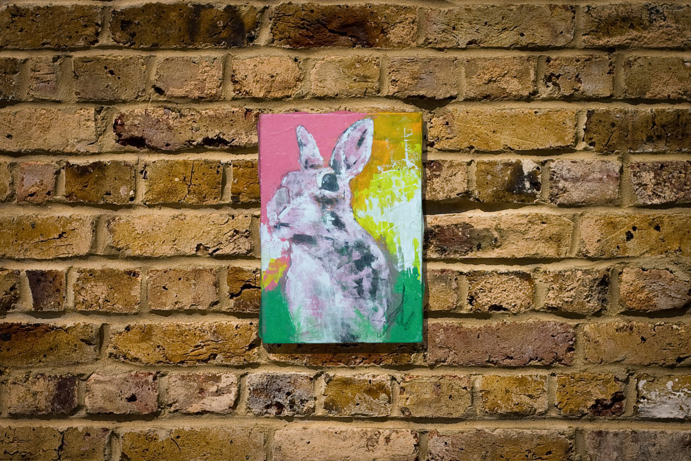 ポップアートやモダンアートのテイストが入り交じったスプレーアート作品。小さいSMサイズのキャンバスにうさぎを描かれた動物シリーズに1点。場所を選ばずに飾りやすい作品になっています。プレゼントとしても大変おすすめです。