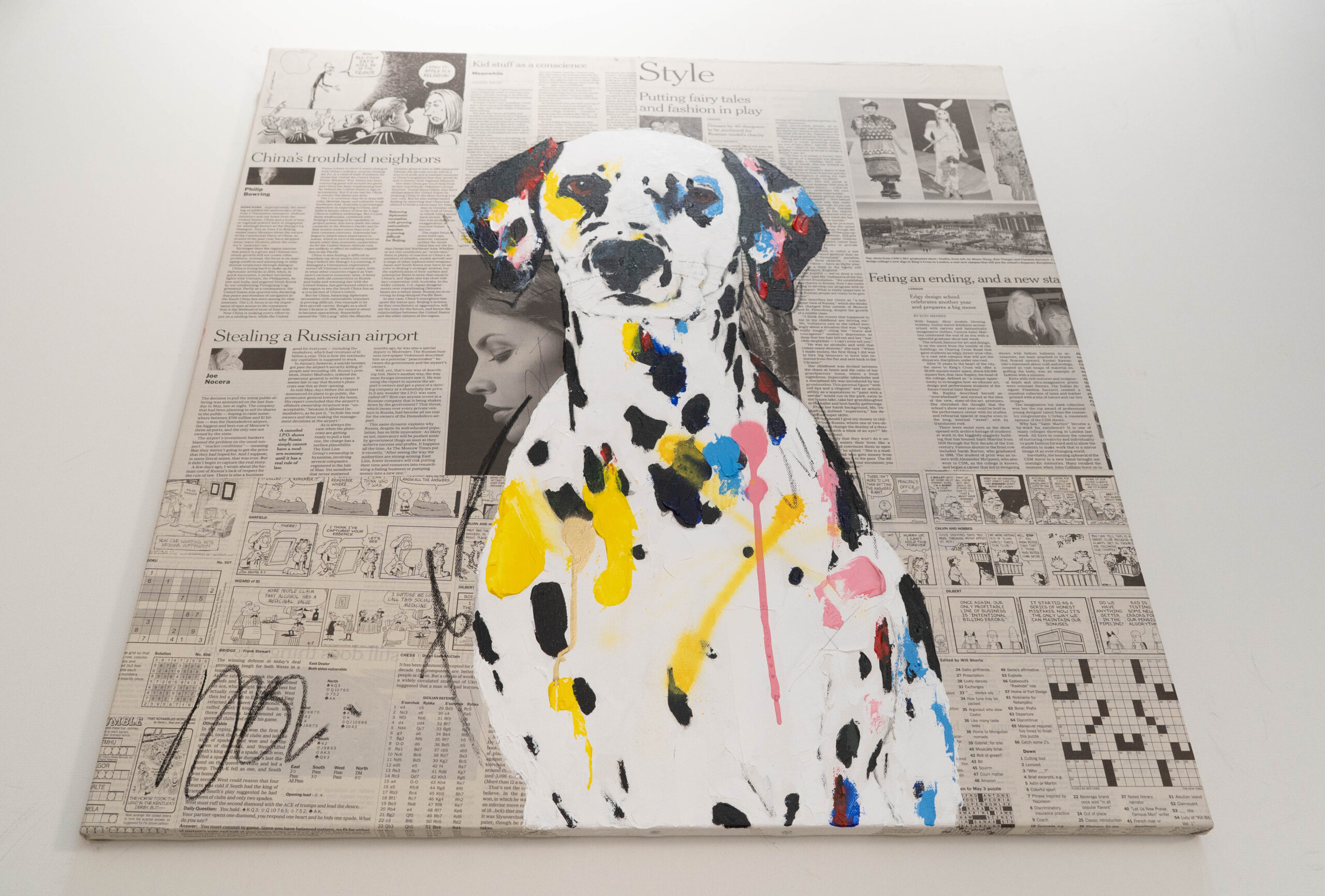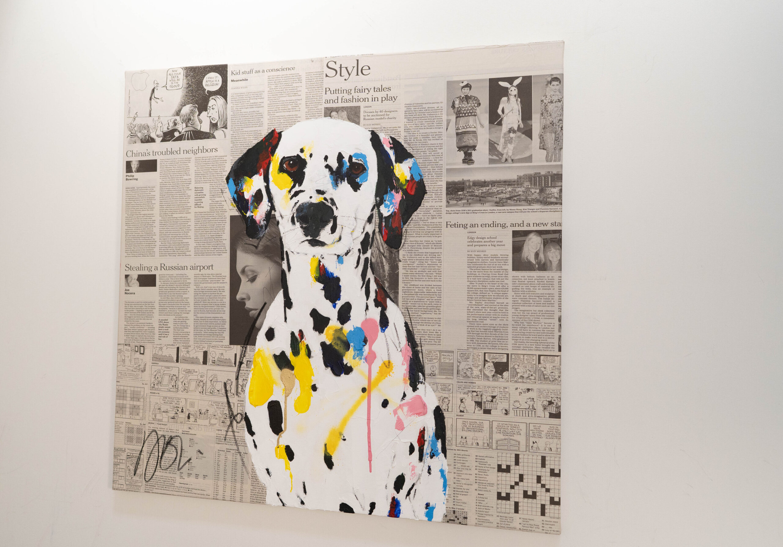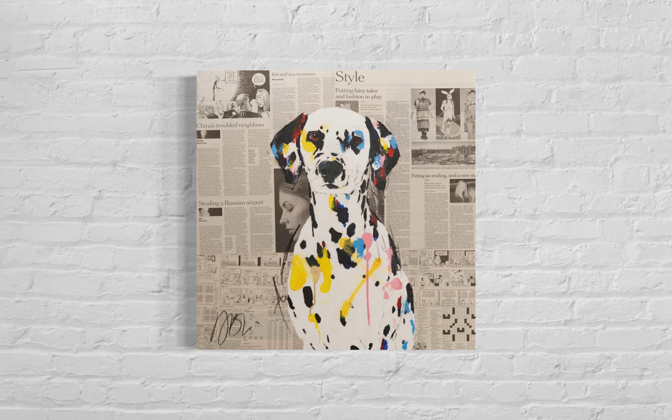 動物シリーズからダルメシアンのスプレーアート作品!本作は652mm正方形キャンバスにダルメシアンをポップに描いています。英字新聞をコラージュした背景に佇む犬の姿がかっこ良くもあり可愛らしいとてもおしゃれな作品です。