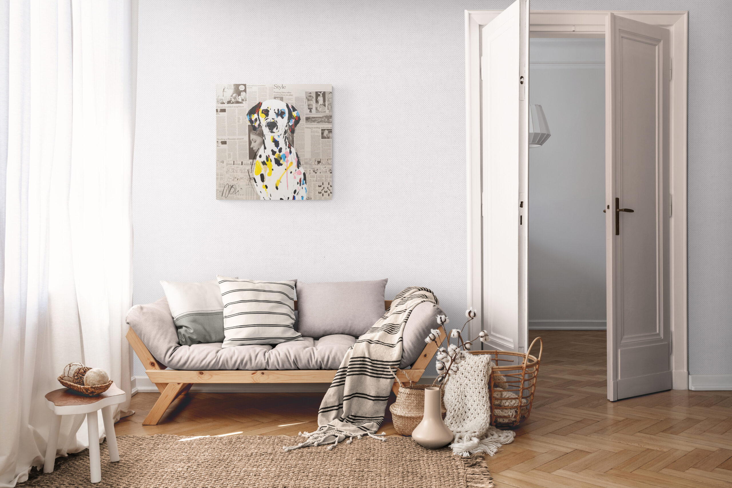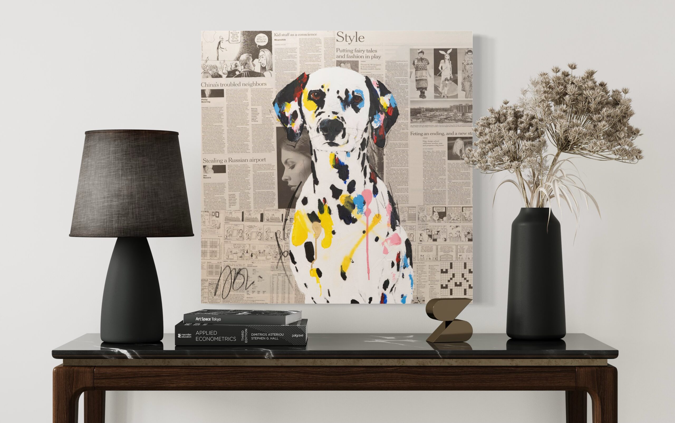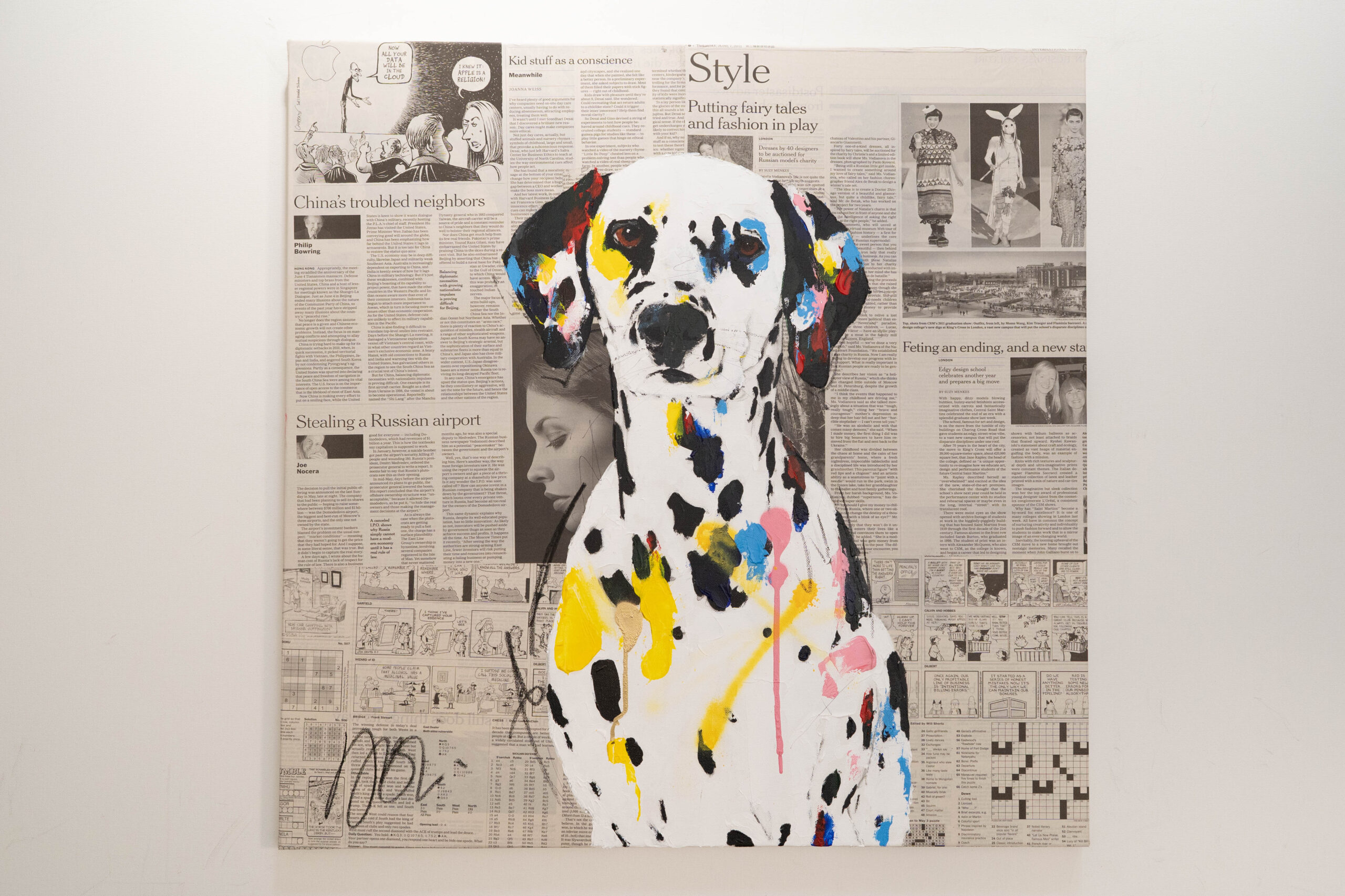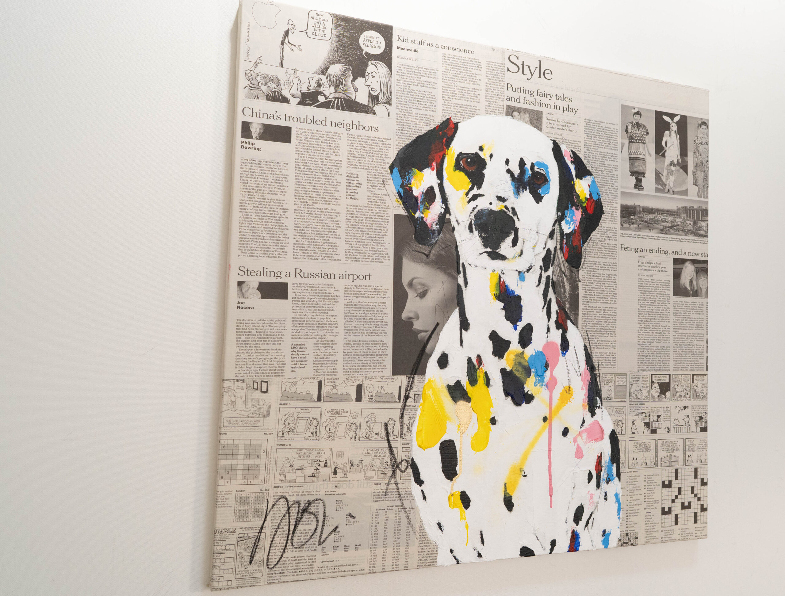 動物シリーズからダルメシアンのスプレーアート作品!本作は652mm正方形キャンバスにダルメシアンをポップに描いています。英字新聞をコラージュした背景に佇む犬の姿がかっこ良くもあり可愛らしいとてもおしゃれな作品です。
