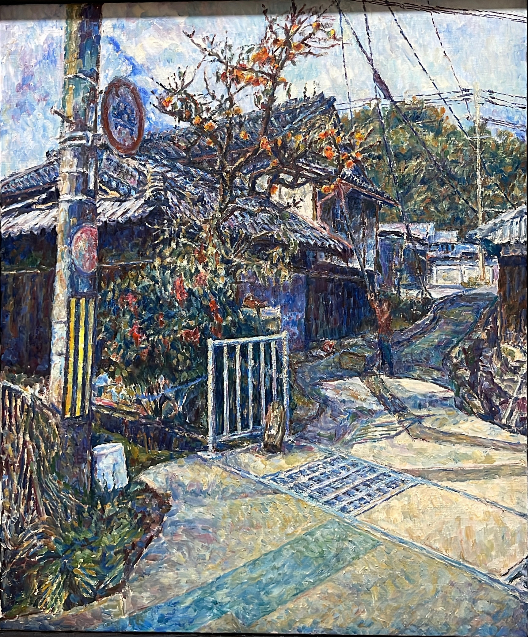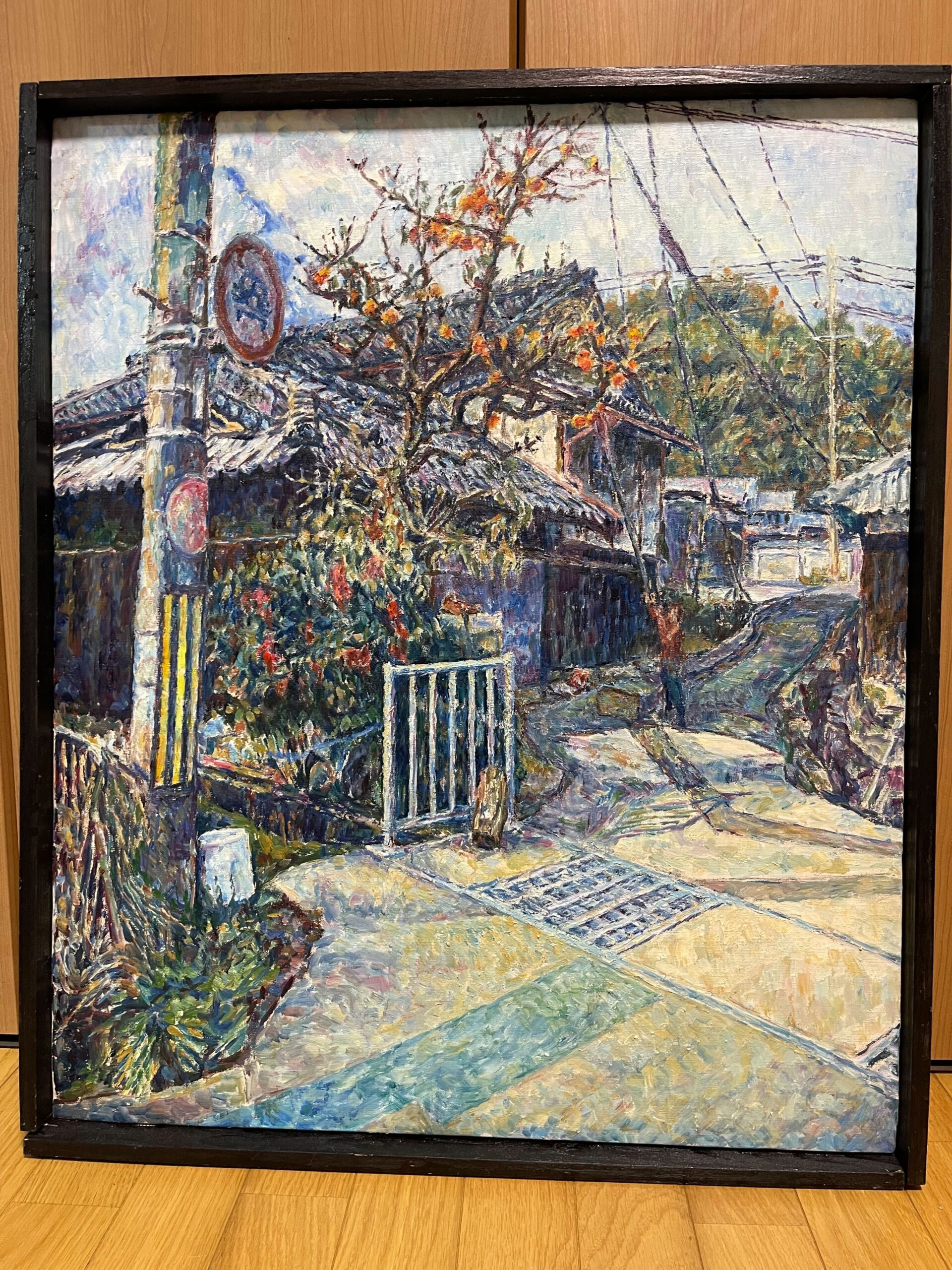 F20号の大型油彩原画です。 古い路地に実る柿の木と収穫する人の姿を描写しました。