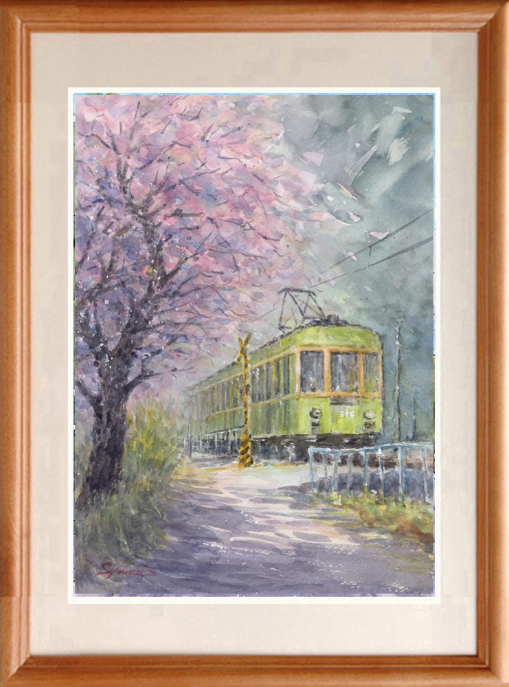 水彩画原画 江ノ電と桜・極楽寺付近 #714