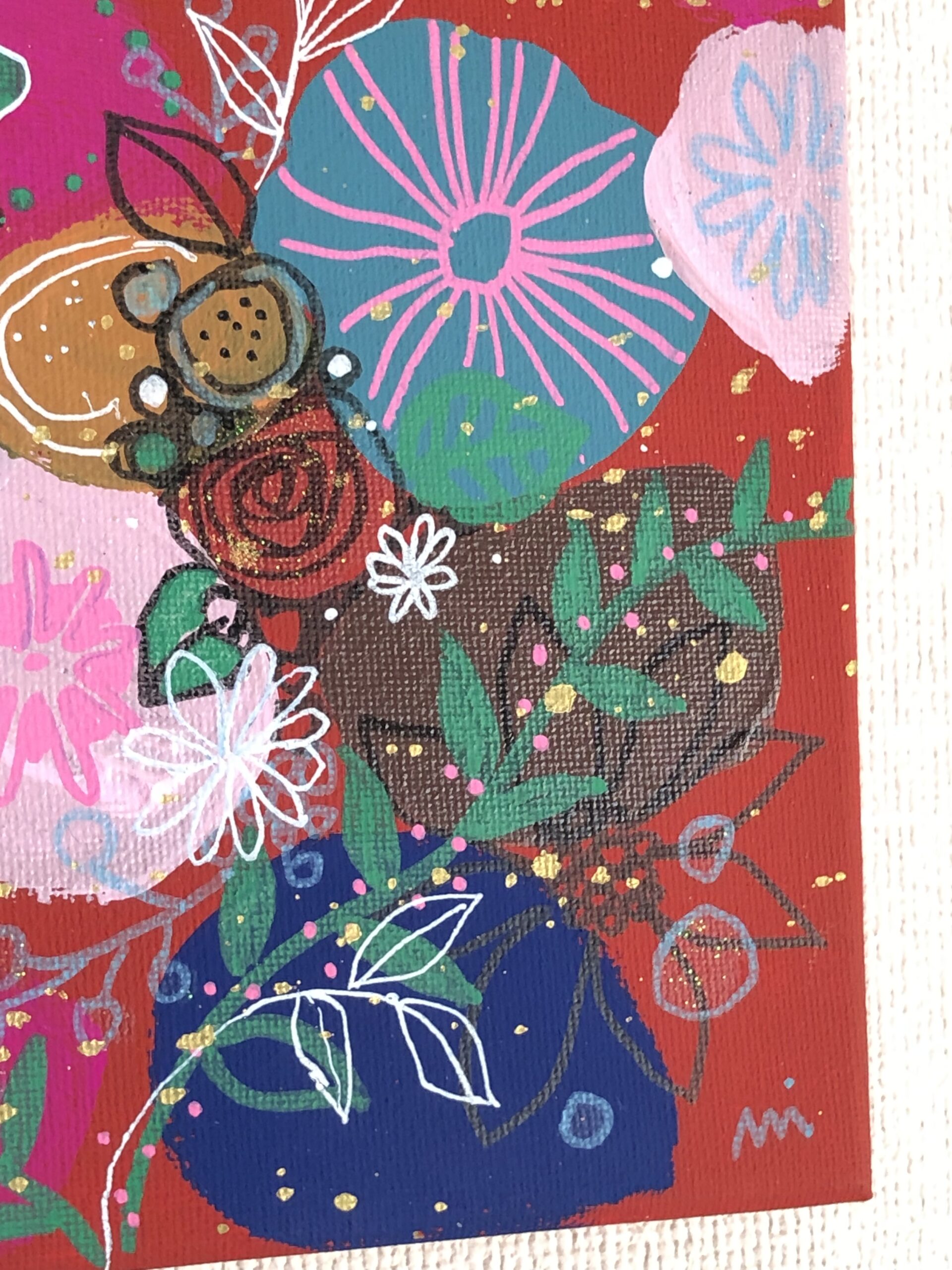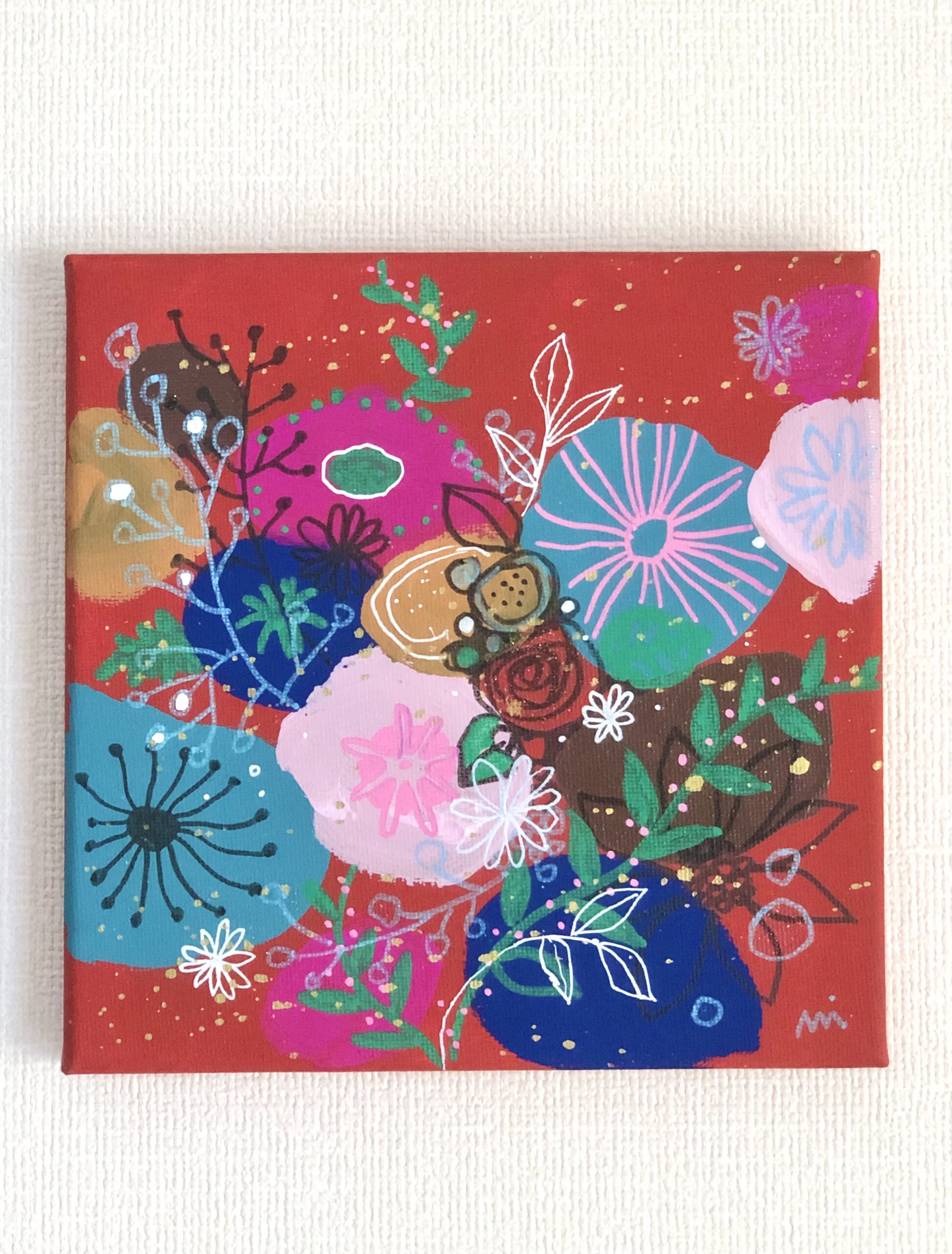 小さなスクエアの可愛い作品です。自由でポップなタッチで、空想のプチブーケを描きました。