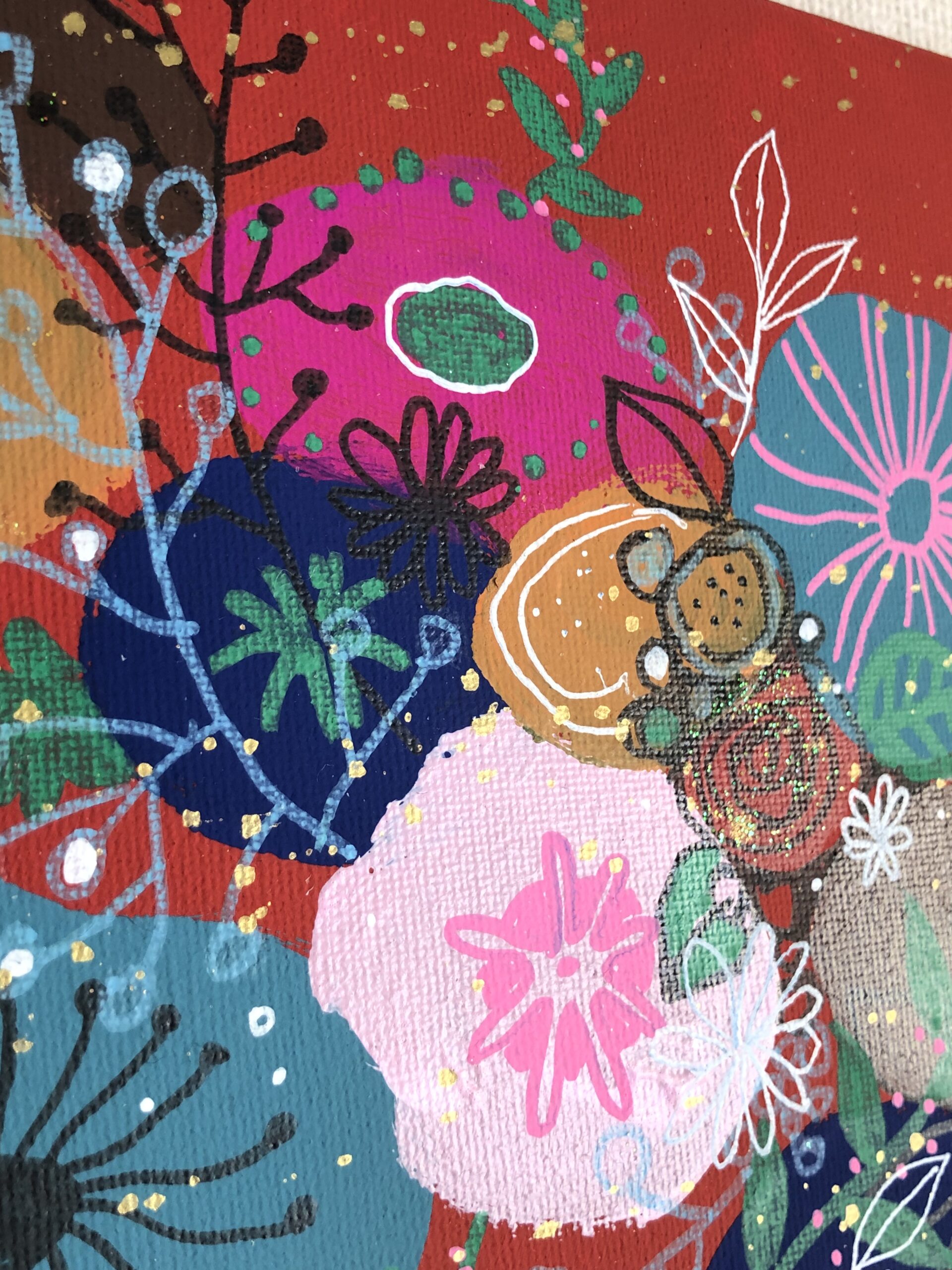 マットな赤色の下地に、ツヤ感が違う絵の具や、キラキラのラメを少し使って、楽しい雰囲気にしています。