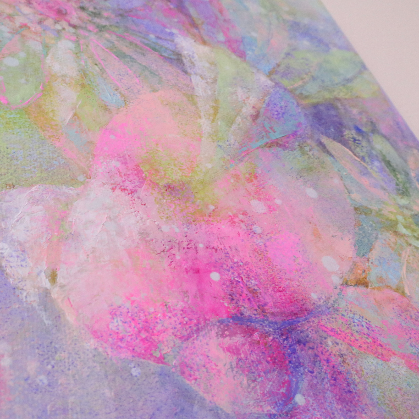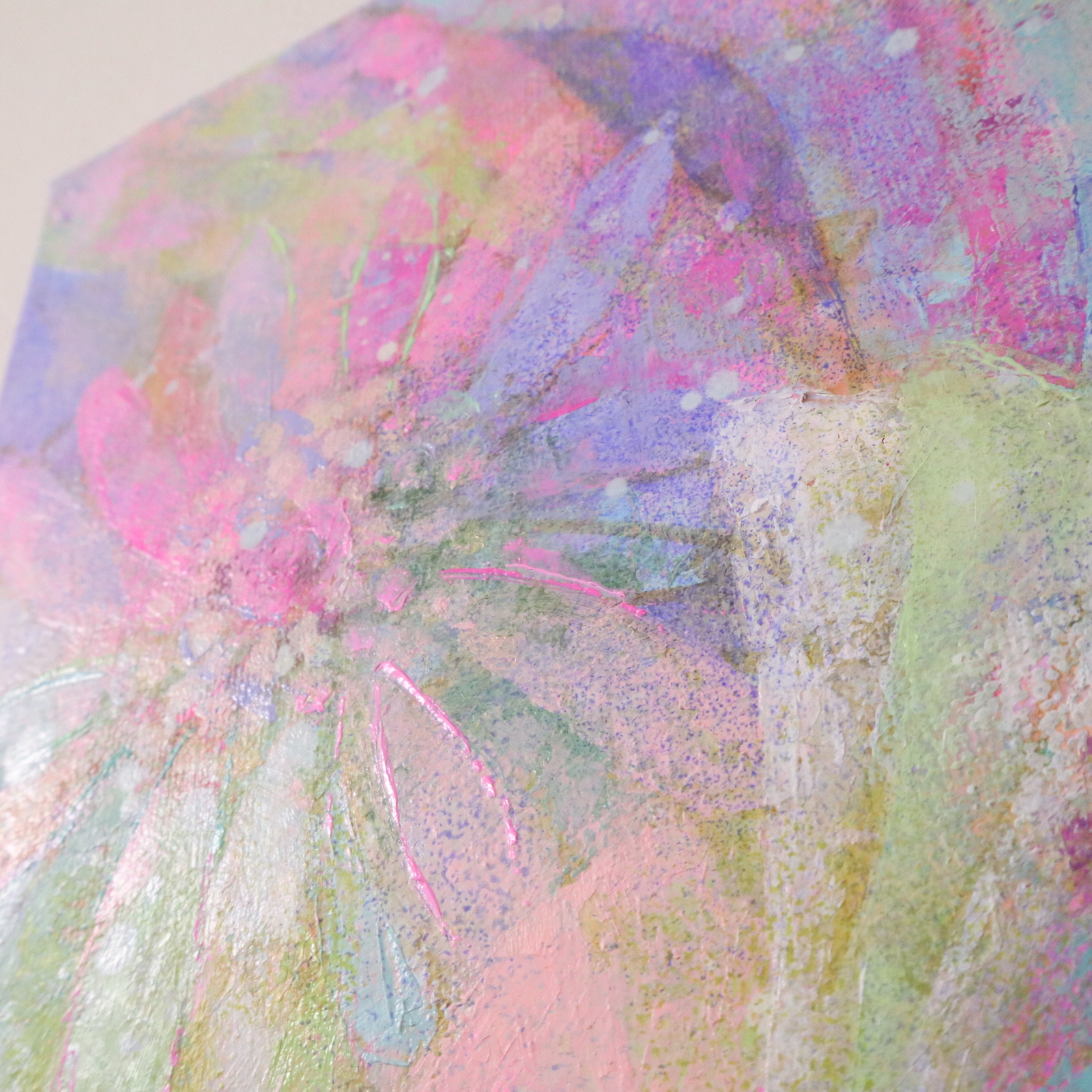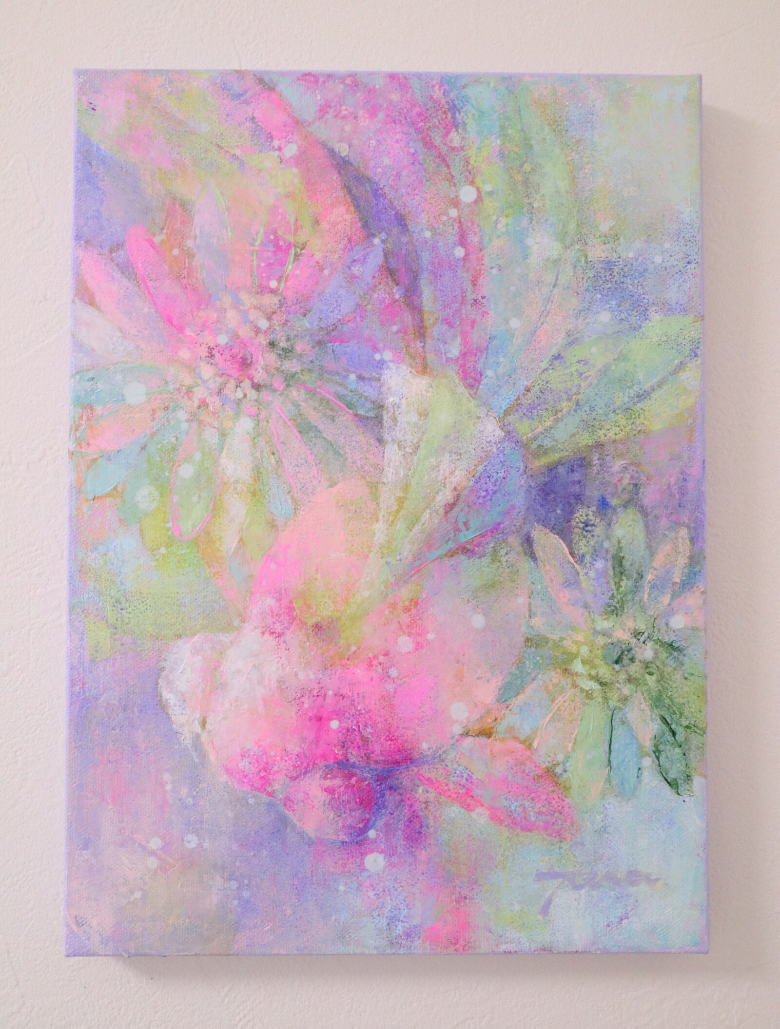 薄く溶いた油絵具を何層にも重ねて描き、最後にローラーを使い色を重ねて深みを出しました。色の重なりの美しさを感じていただけたら、嬉しいです。
