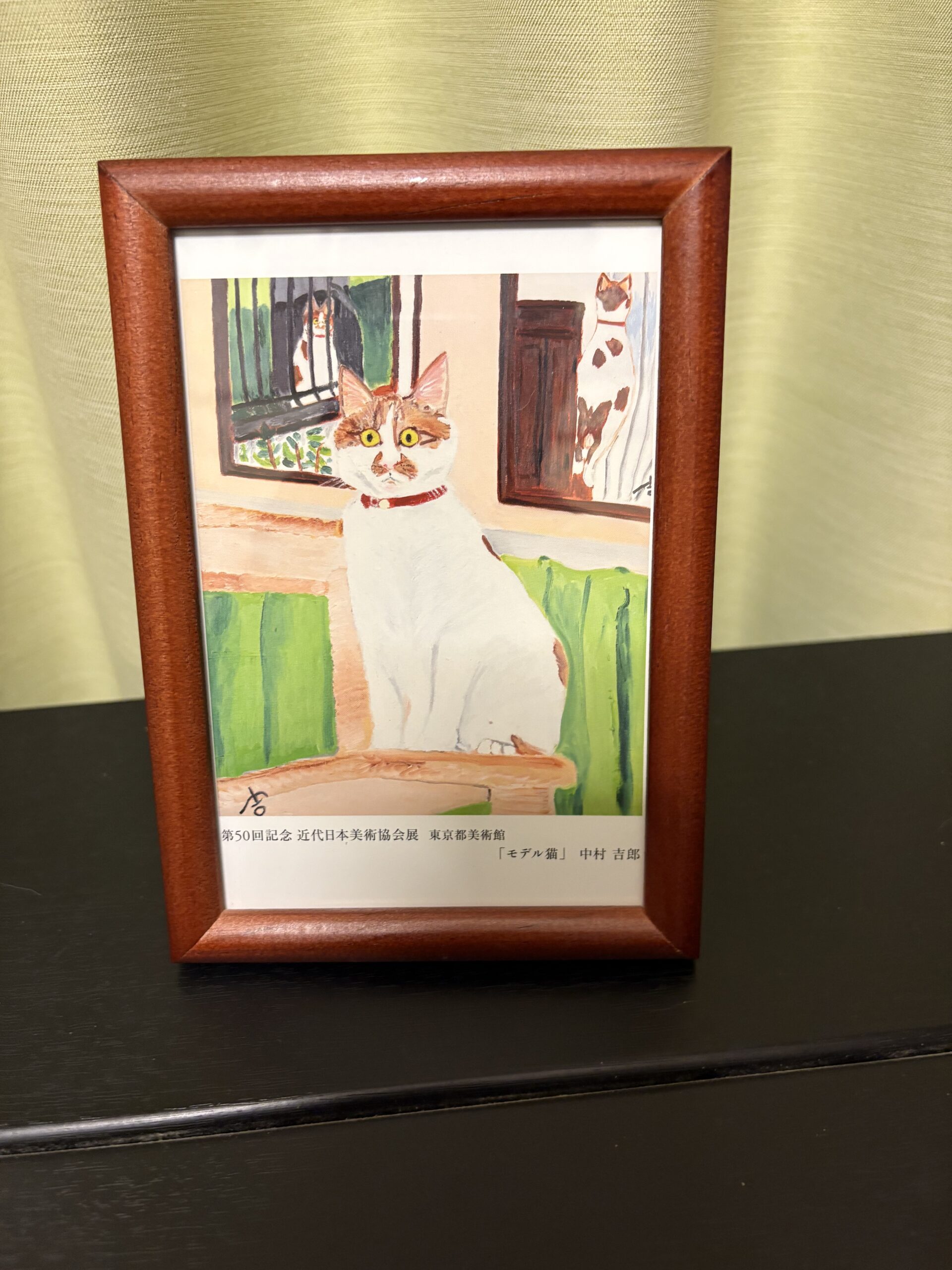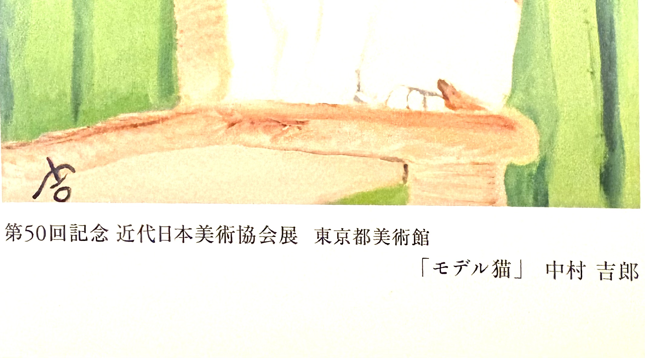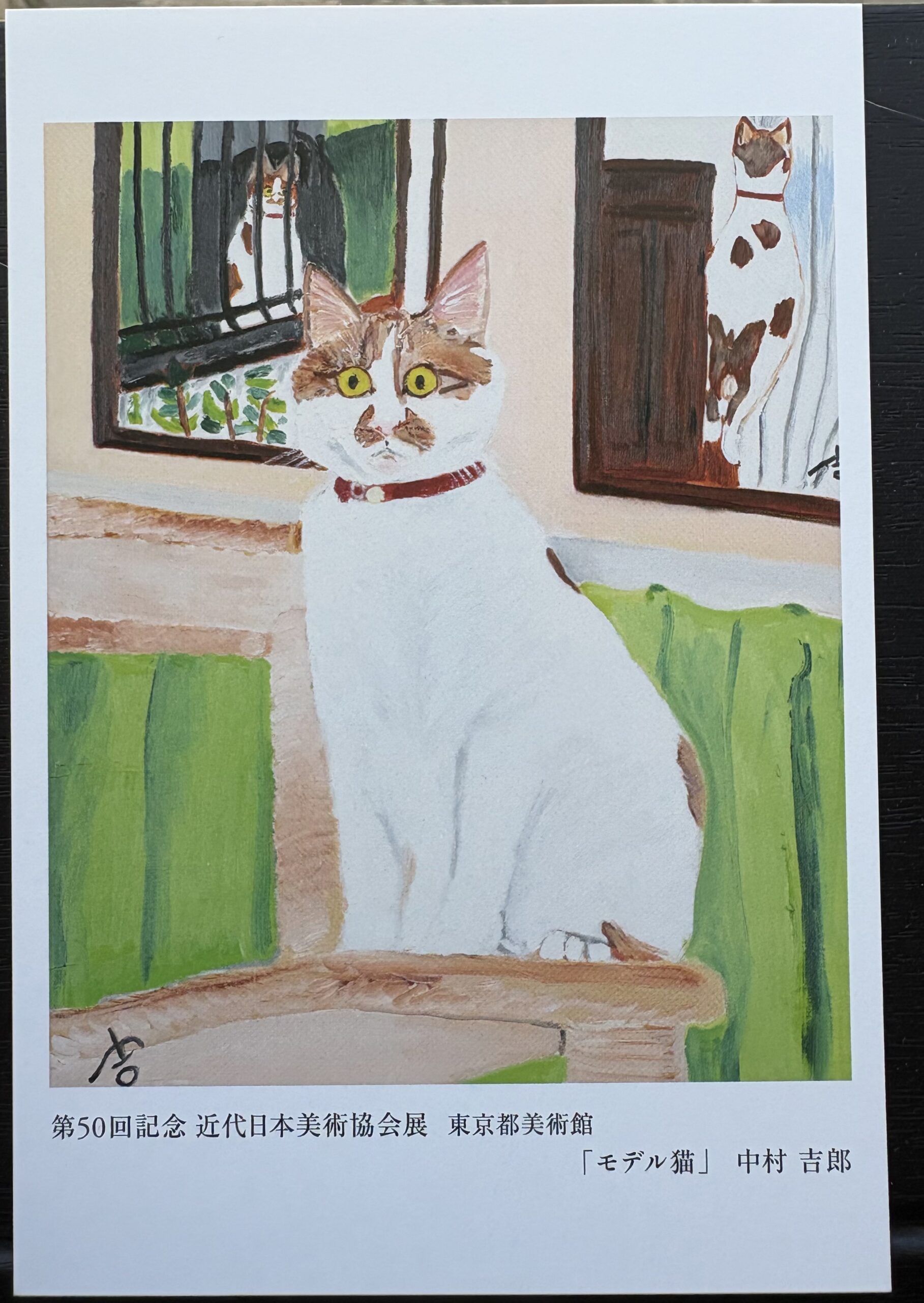 自作の油彩画「モデル猫」をポストカードにしました。 保健所から譲渡されたタマは、何枚もの絵のモデルとなっており、この絵でも、自分がモデルとなった2枚の絵の前でポーズを取っています。 第50回記念近代日本美術協会展出展時に作成したものなので、表面に展示会名、作者名、タイトルが印字されています。 親しい方に送るだけでなく、額に入れてミニアートとして部屋に飾っていただくことも出来ます。 購入された方にはサンキューシールをプレゼント。